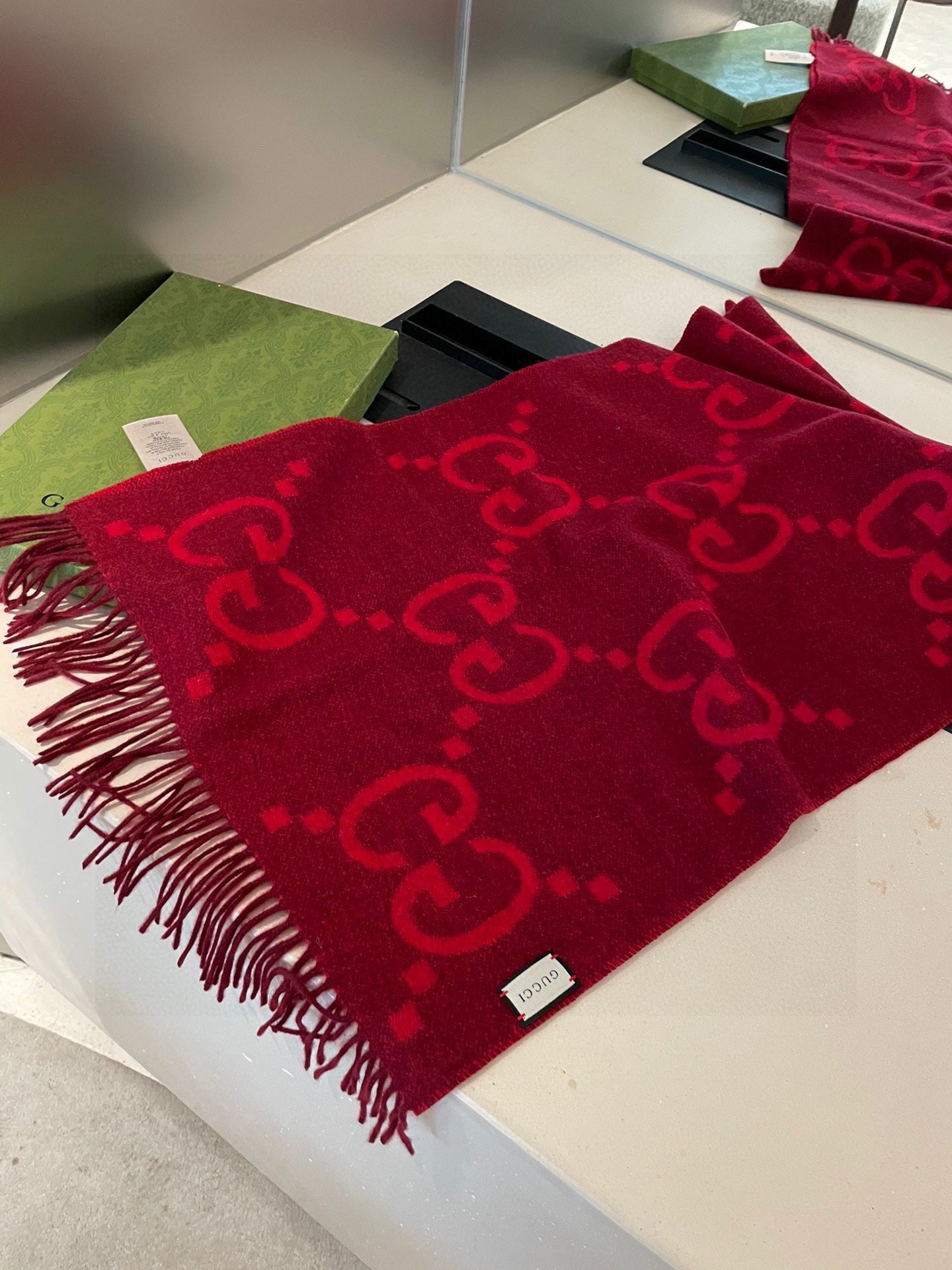 The House's most emblematic codes elevate everyday accessories. Presented in a contrasting color combination of lilac and ivory, the recognizable GG motif alternates across this soft cashmere jacquard scarf.