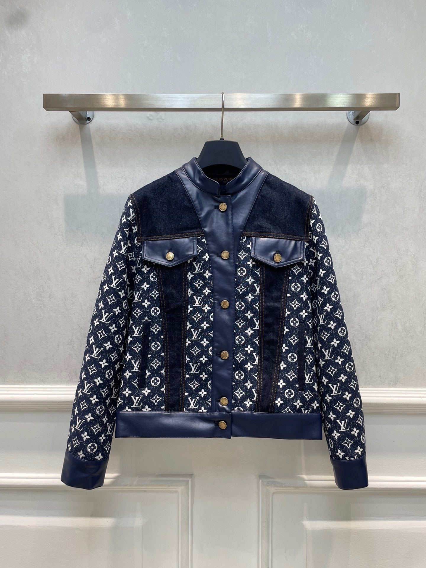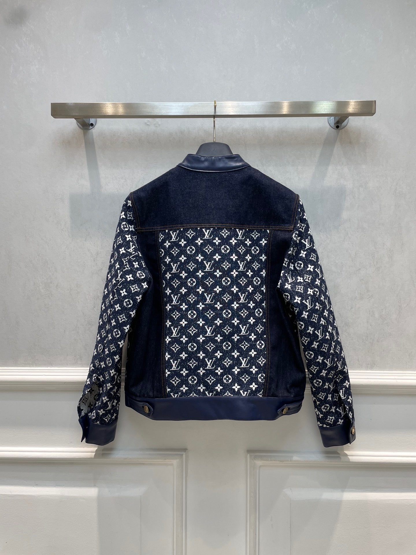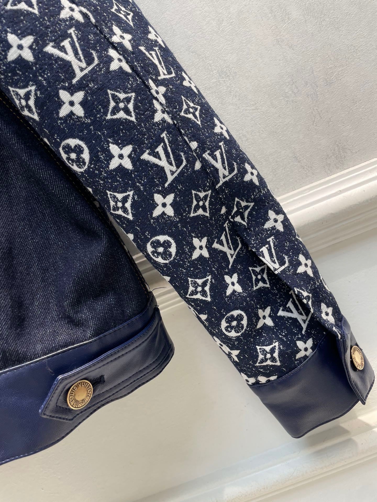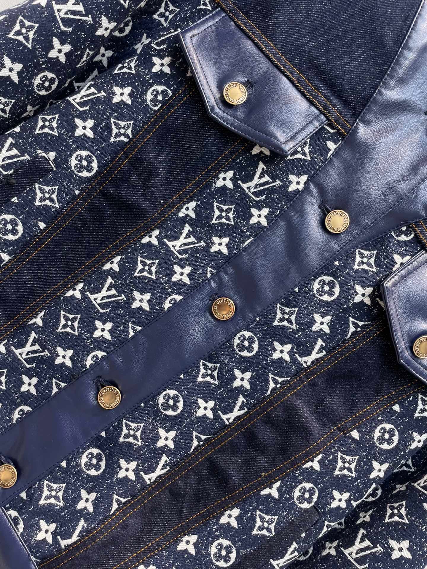 Casual yet graphic, this jacket is crafted from this season’s signature Monogram jacquard denim with contrasting inserts of glossy lambskin leather and raw denim detailed with bold yellow topstitching for a structured vintage look. Complete with a chic standing collar, adjustable tabs on the waistline and golden hardware.