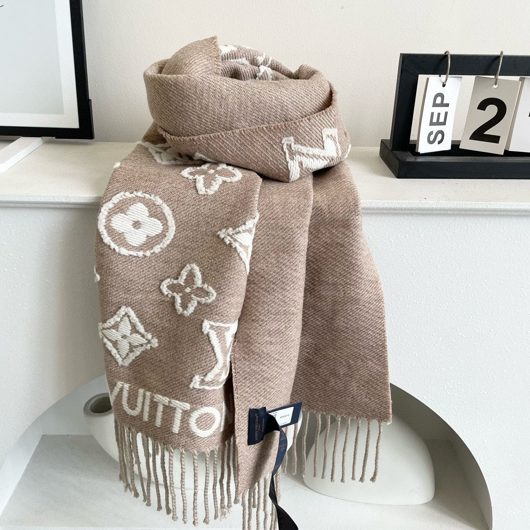 The new LV 3D scarf offers a creative variation on a classic House icon. The emblematic Monogram pattern is woven into a plush wool-cashmere blend with contrasting shearling to achieve a striking 3D effect. The sophisticated fil coupé technique is used to create subtly different surface finishes on the two sides of this on-trend, elegant scarf.