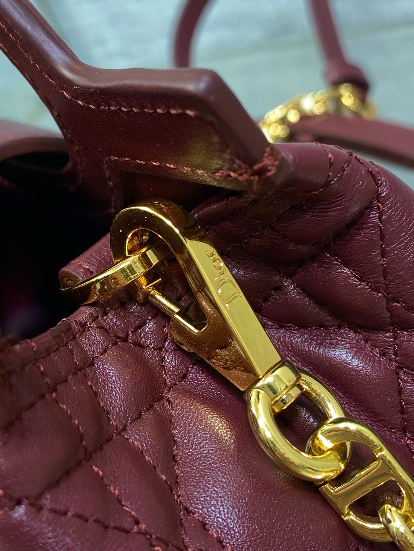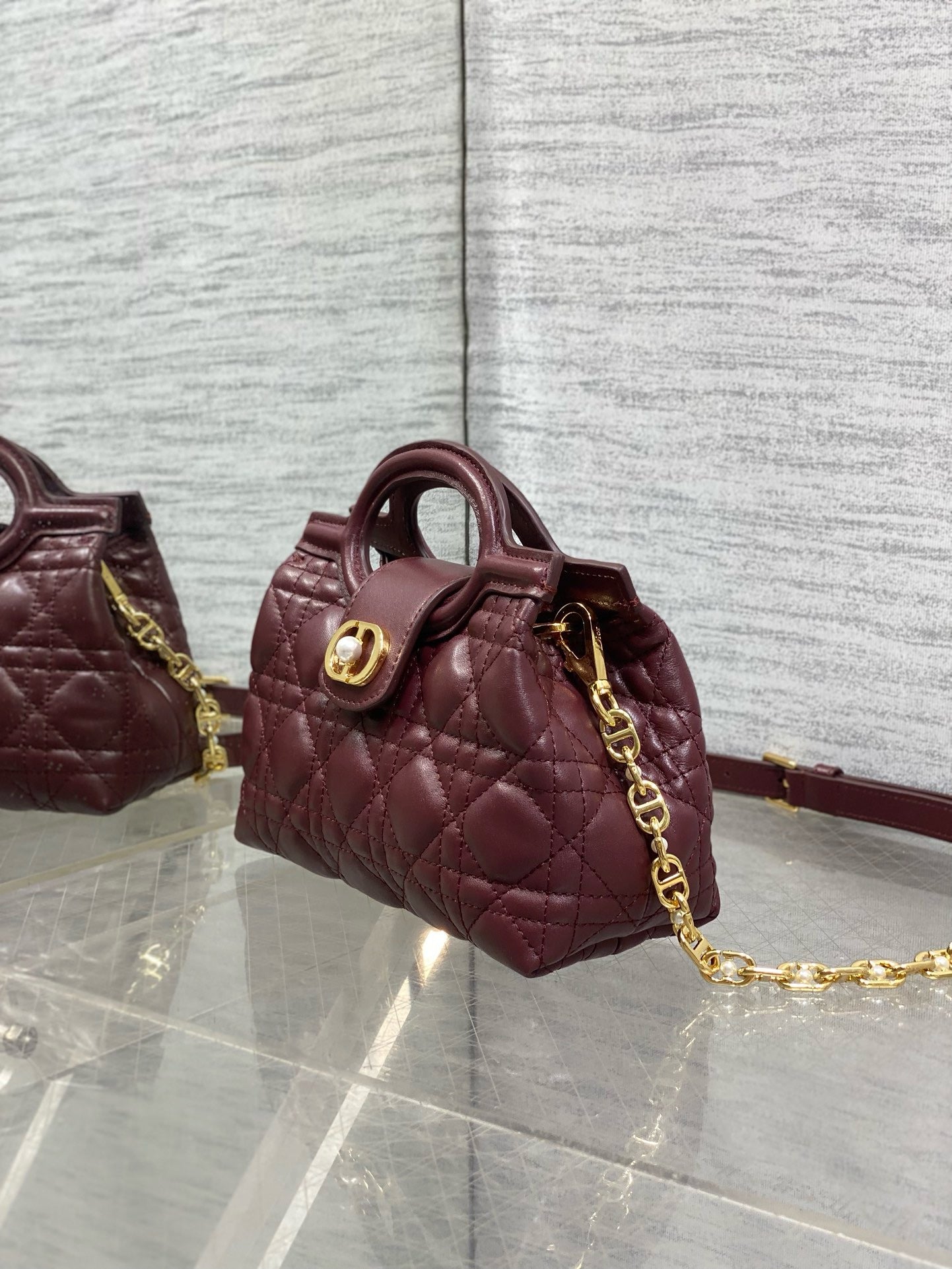 New for Cruise 2026, the Dior Jolie Top Handle mini bag presents an elegant and refined design. Crafted in black Cannage lambskin, the style features a flap, enhanced by a gold-finish metal CD signature with a white resin pearl, that opens to reveal a compartment to accommodate all the essentials. The double top handle, complete with an adjustable and removable CD chain strap accented by white resin pearls and a leather insert, allows the bag to be comfortably carried by hand, worn over the shoulder or crossbody, day or evening.