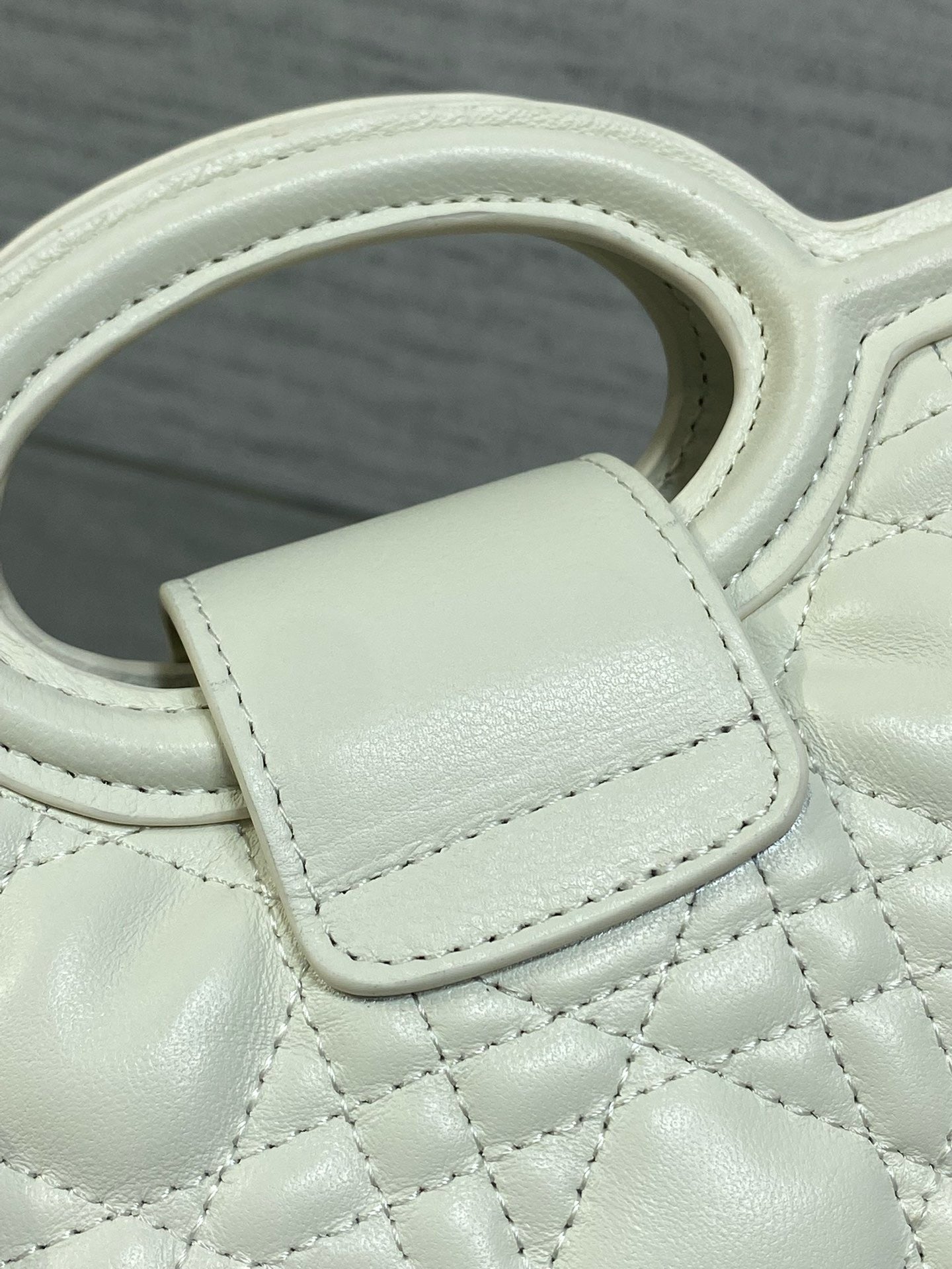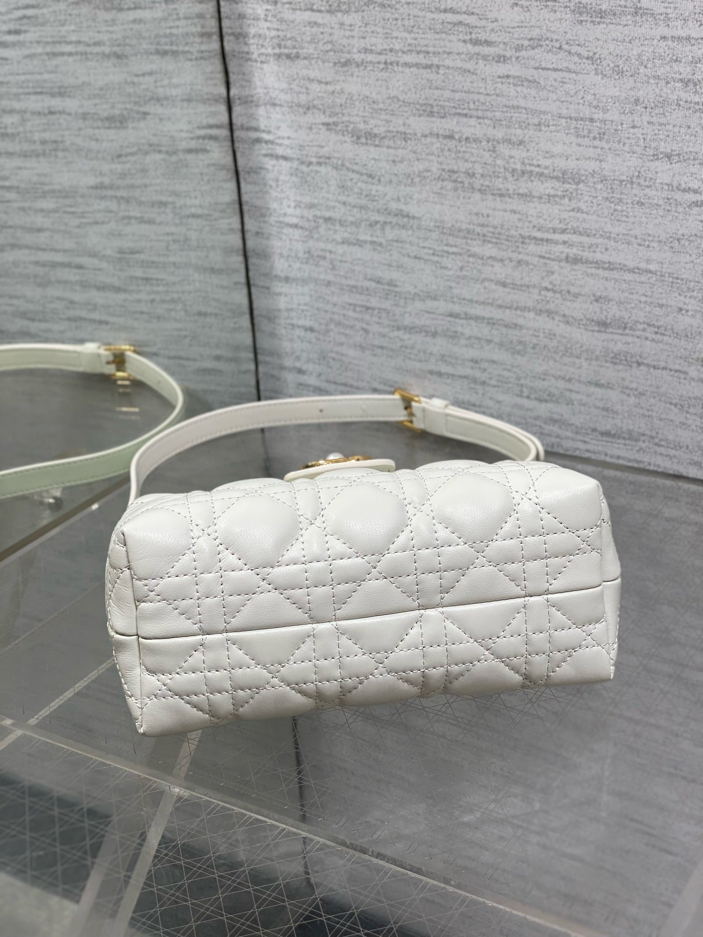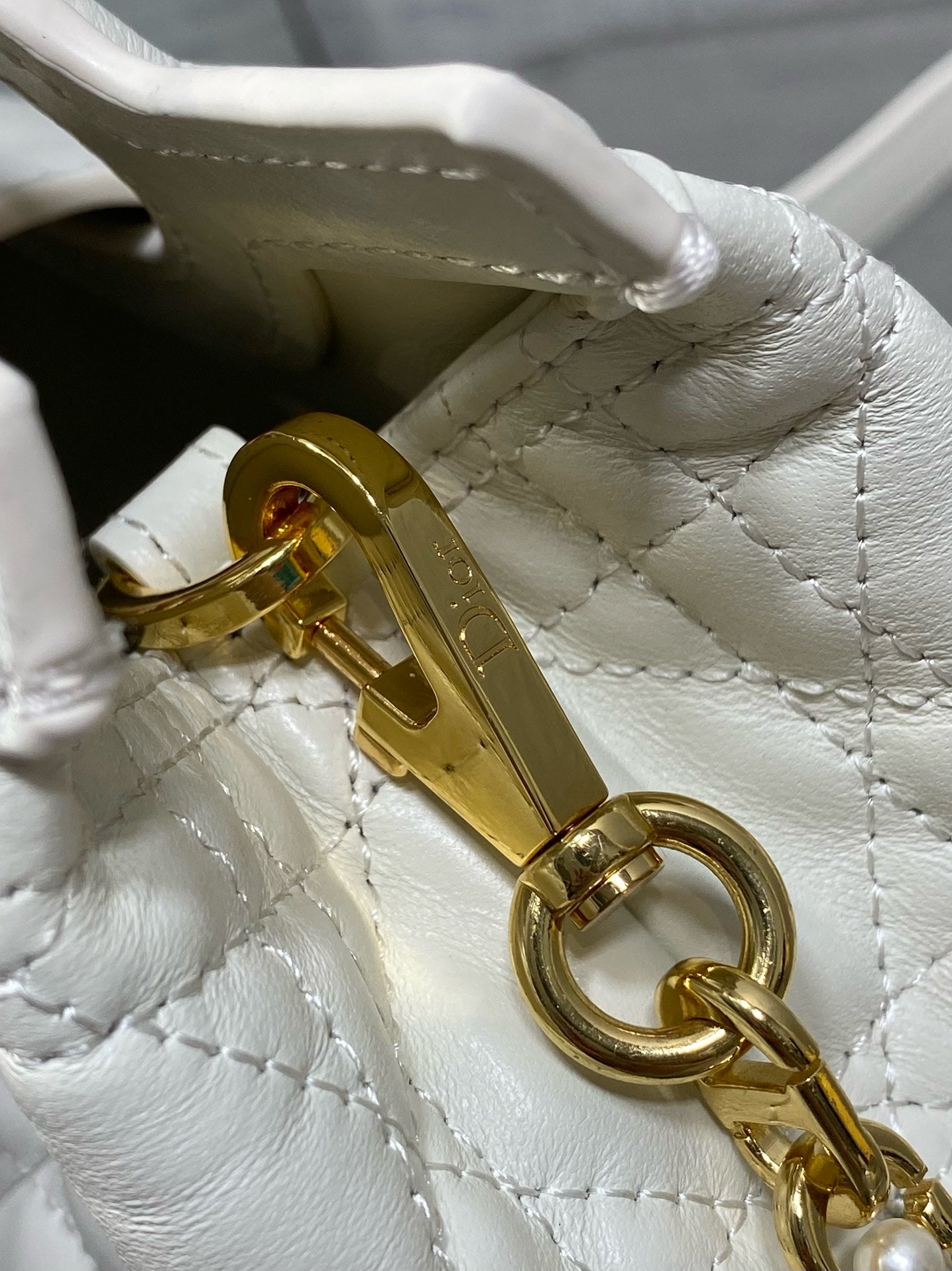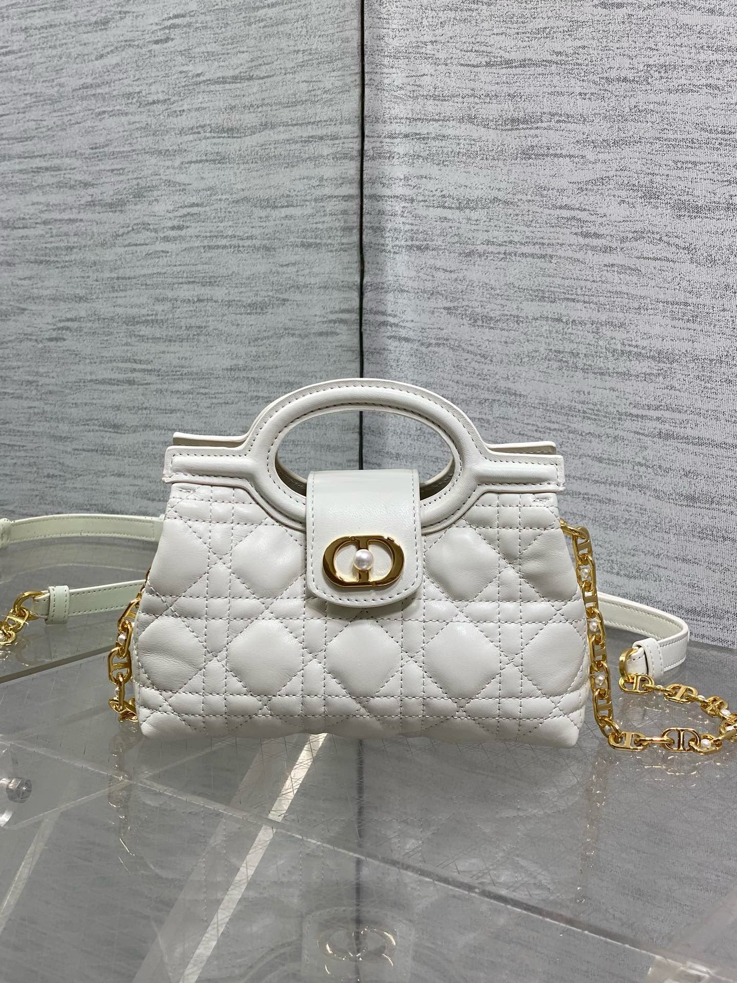 New for Cruise 2026, the Dior Jolie Top Handle mini bag presents an elegant and refined design. Crafted in black Cannage lambskin, the style features a flap, enhanced by a gold-finish metal CD signature with a white resin pearl, that opens to reveal a compartment to accommodate all the essentials. The double top handle, complete with an adjustable and removable CD chain strap accented by white resin pearls and a leather insert, allows the bag to be comfortably carried by hand, worn over the shoulder or crossbody, day or evening.