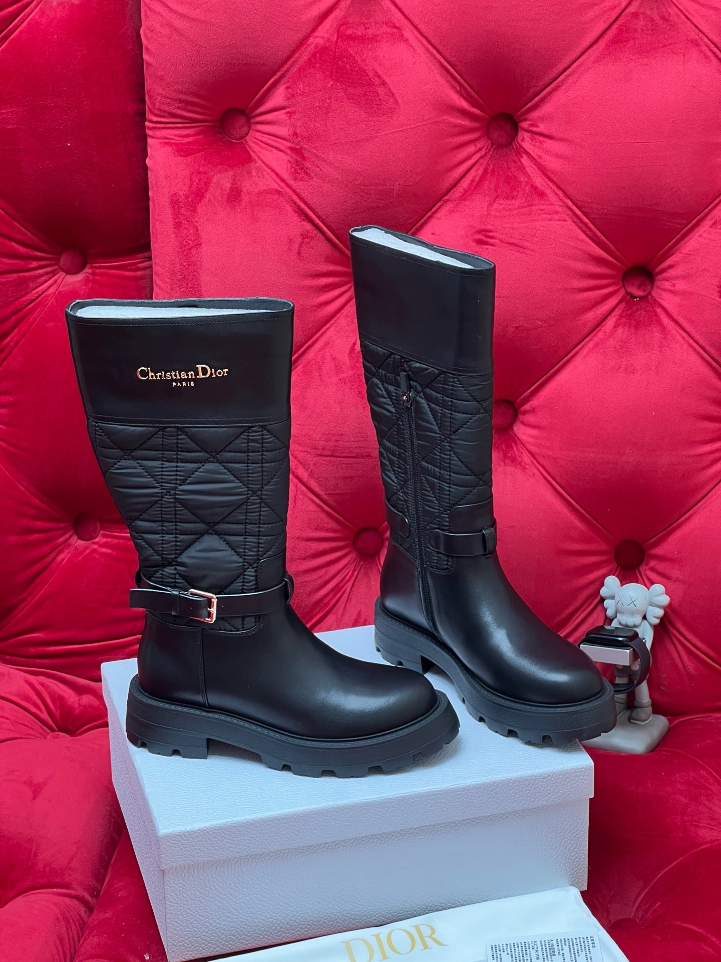 The D-Town boot showcases bold, modern appeal. The upper pairs black calfskin and nylon with Cannage stitching, and is accented by a gold-finish metal Christian Dior Paris signature on the side and an adjustable buckled strap highlighting the ankle. The thick yet ultralightweight notched sole will lend a contemporary touch to any look.
