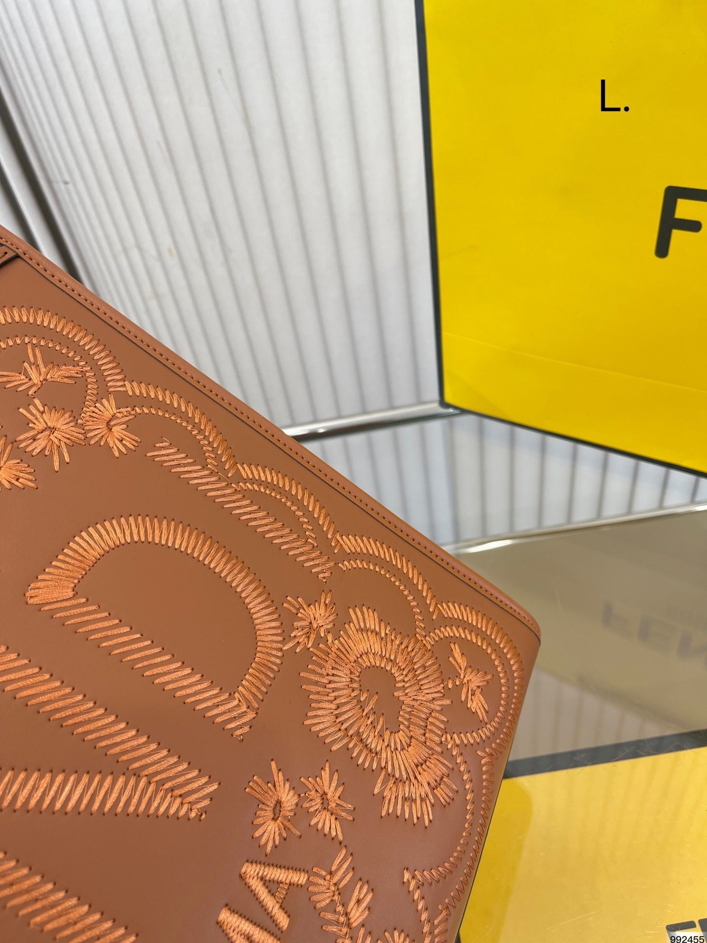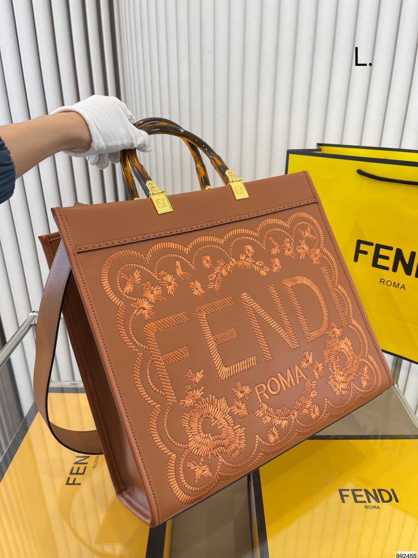 Medium Sunshine shopper bag made of dove gray leather, delicately embroidered with a floral motif and FENDI ROMA lettering in white thread. Stiff tortoiseshell-effect plexiglass handles.