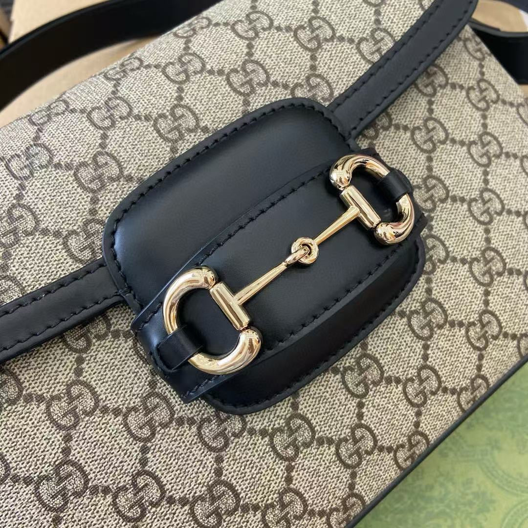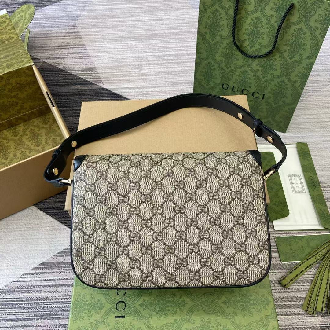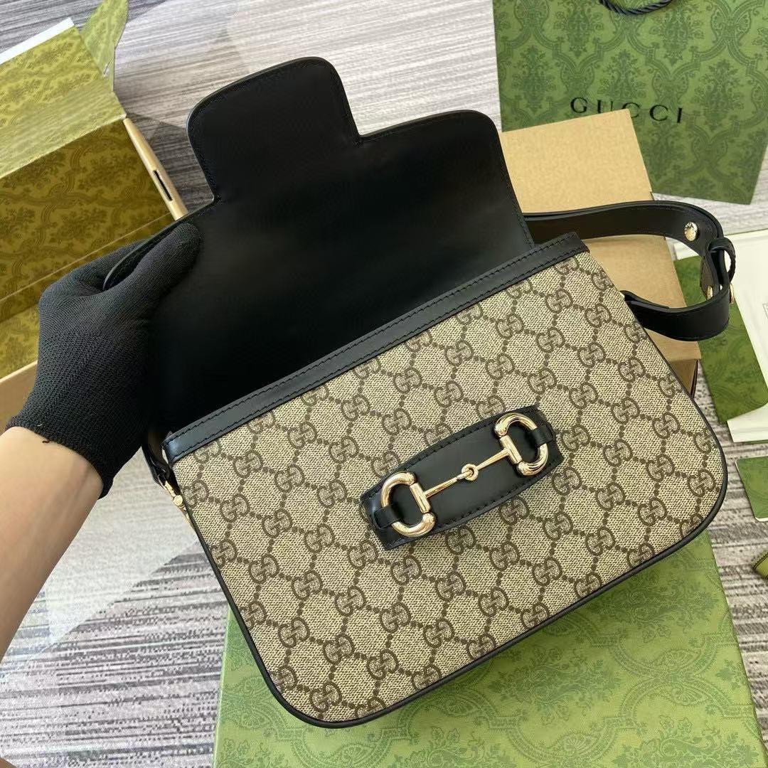 The Gucci Horsebit 1955 Soft continues its equestrian-inspired design with the double ring and bar hardware, blending light gold-toned details and GG Monogram coated fabric, with a soft and sophisticated feel, on this small shoulder bag.