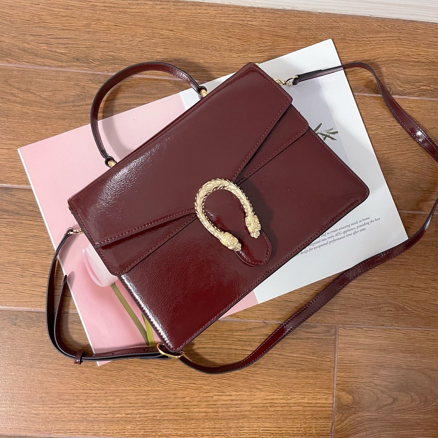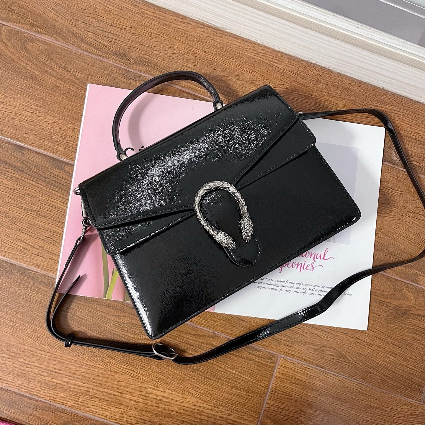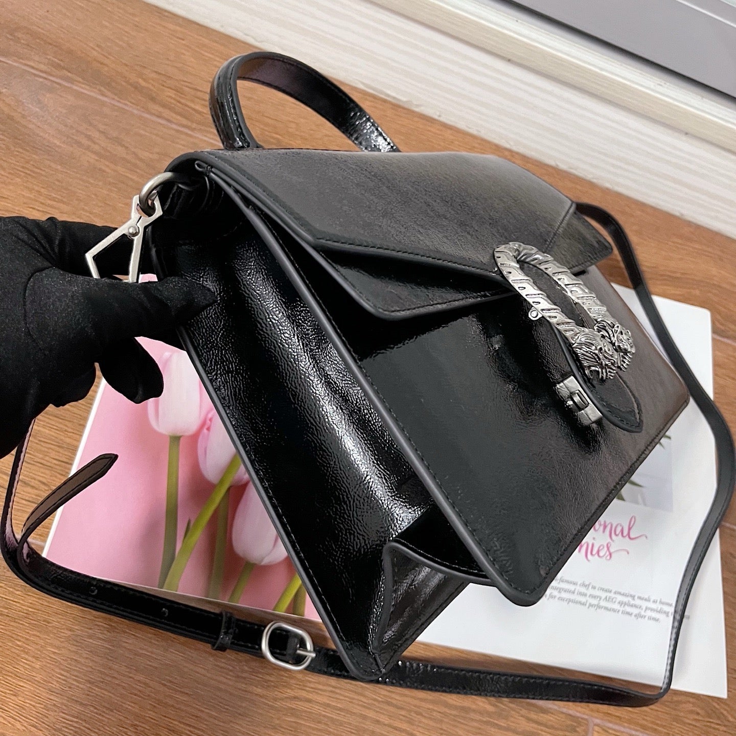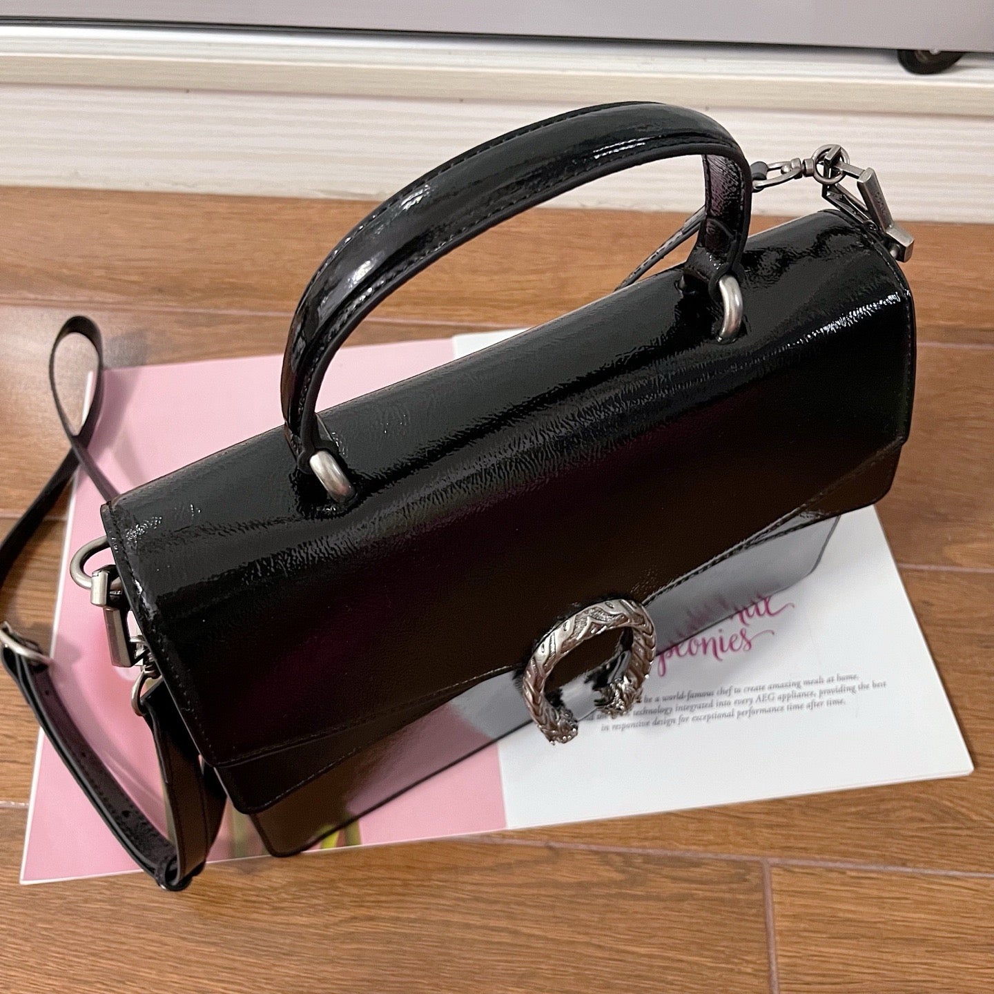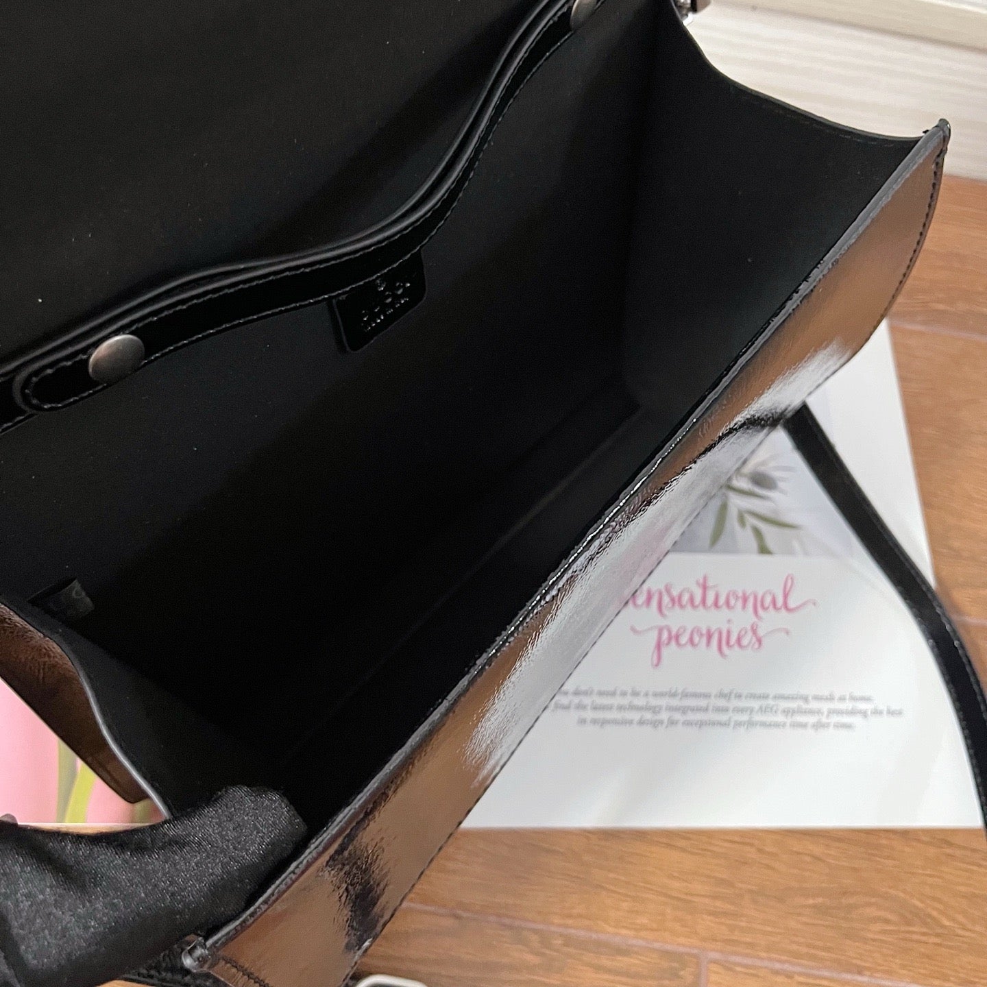 Gucci has unveiled a new style for the iconic Dionysus line. The top handle bag features a contemporary look, and is crafted in sleek black patent leather. At the front appears the signature tiger head closure with a flap, as well as a sliding chain that can be adjusted to suit the wearer's preferred length and style.