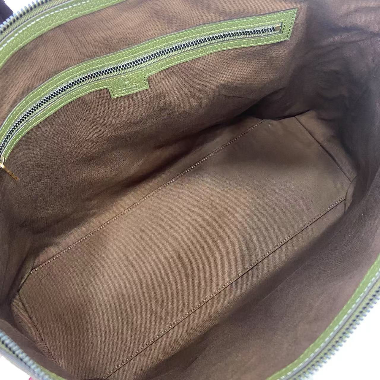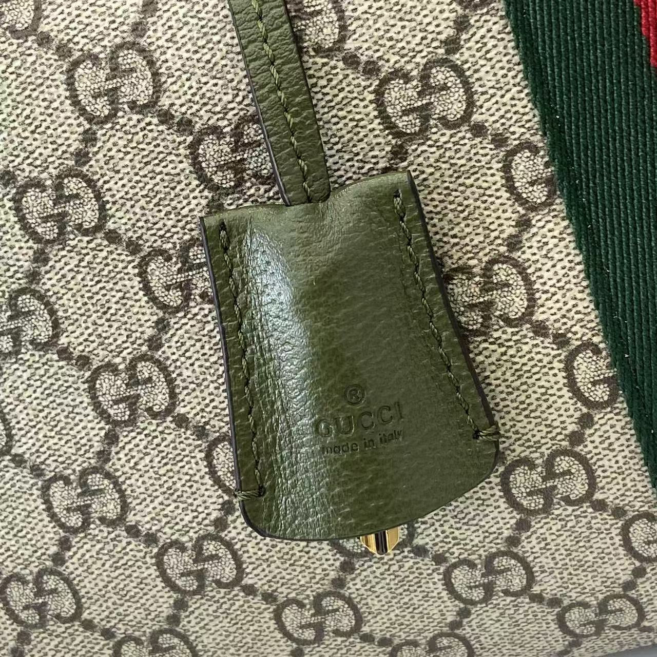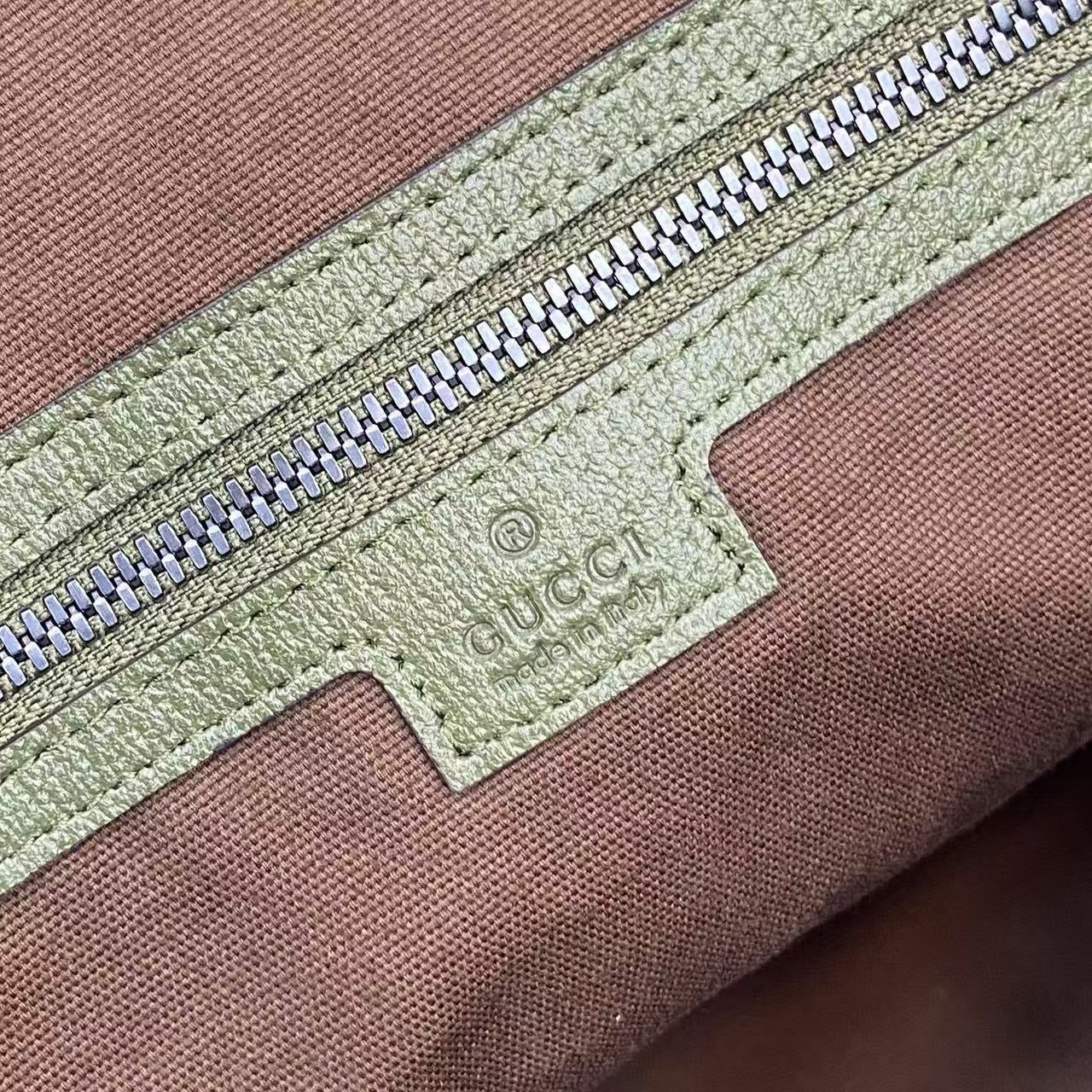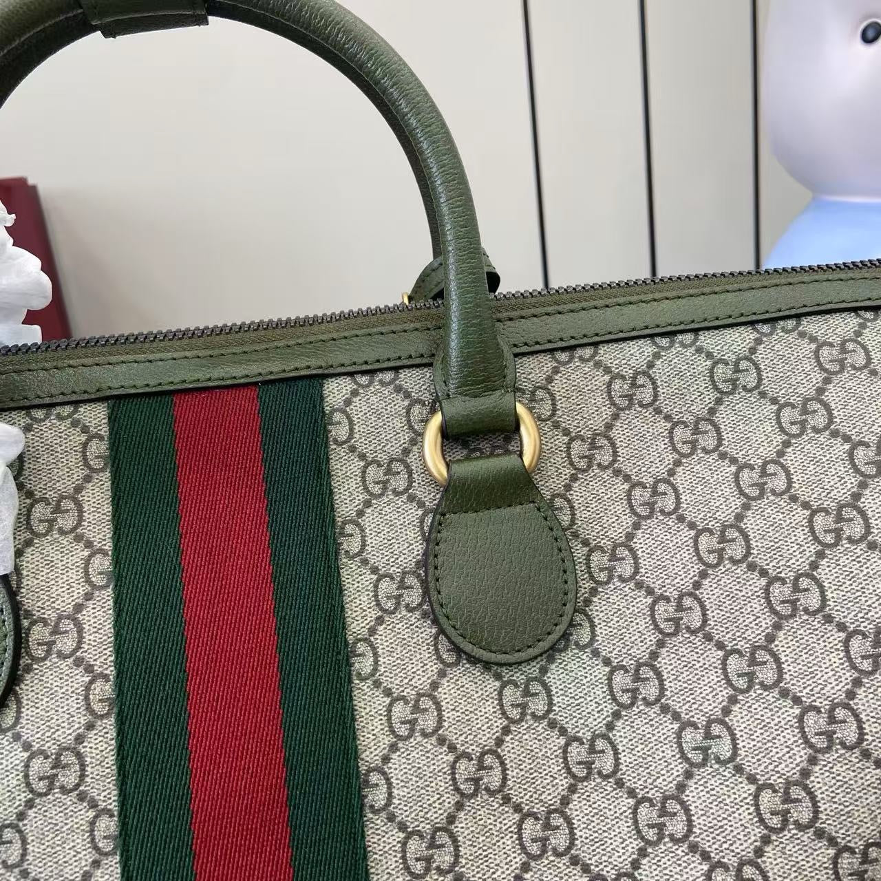 Gucci Savoy in the beige and dark brown/ palette offers signature silhouettes, crafted with a soft touch. This duffle bag is presented in GG Monogram coated fabric and enriched with a Double G and Web detail.