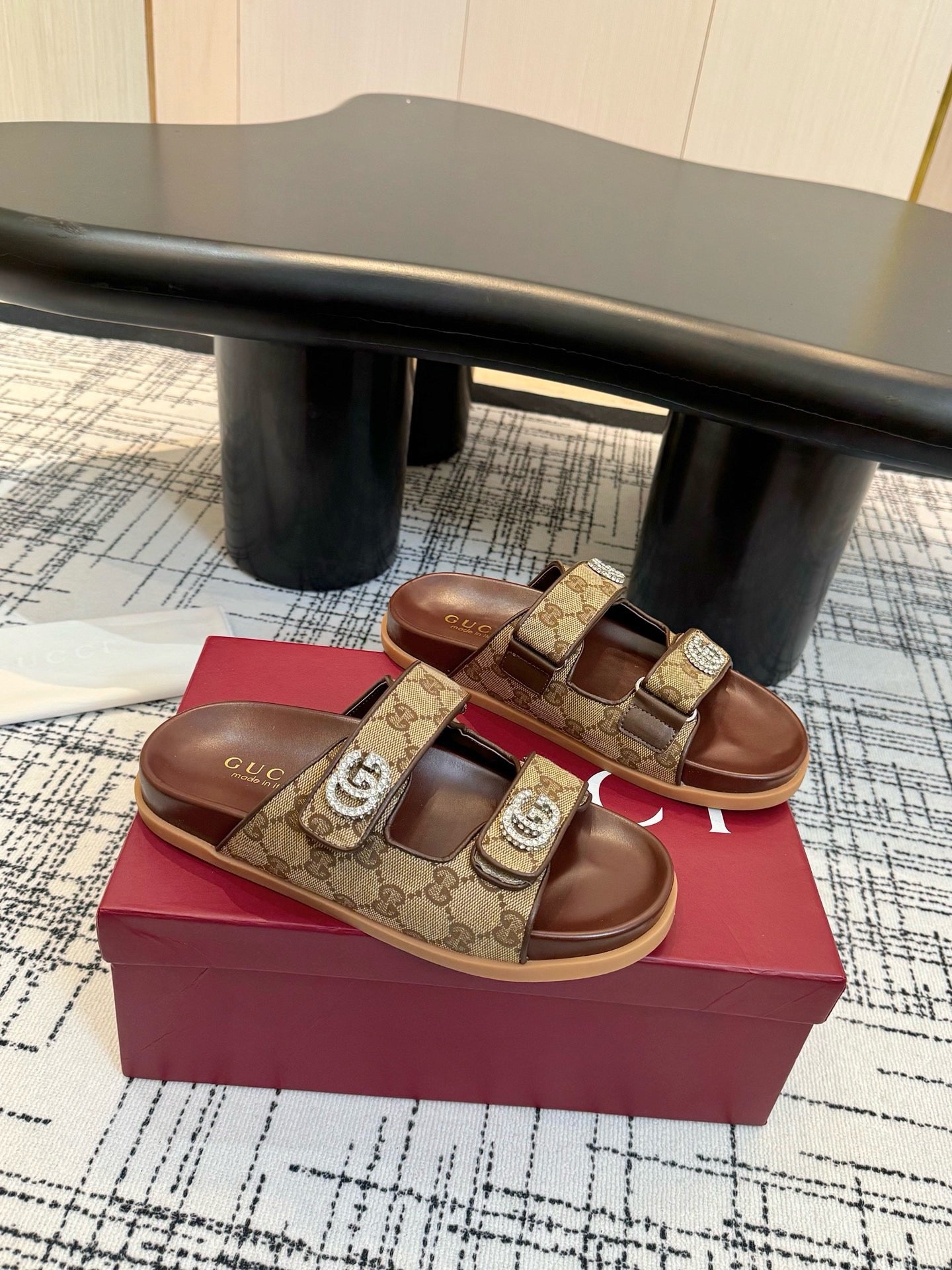 Crafted in leather, these sandals feature the unmistakable Double G logo adorned with light gold-toned hardware, adding a touch of refined elegance.