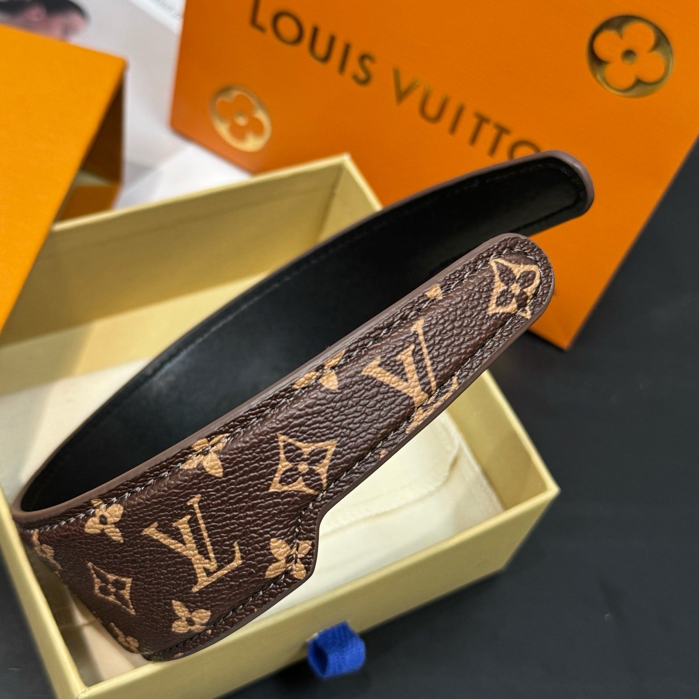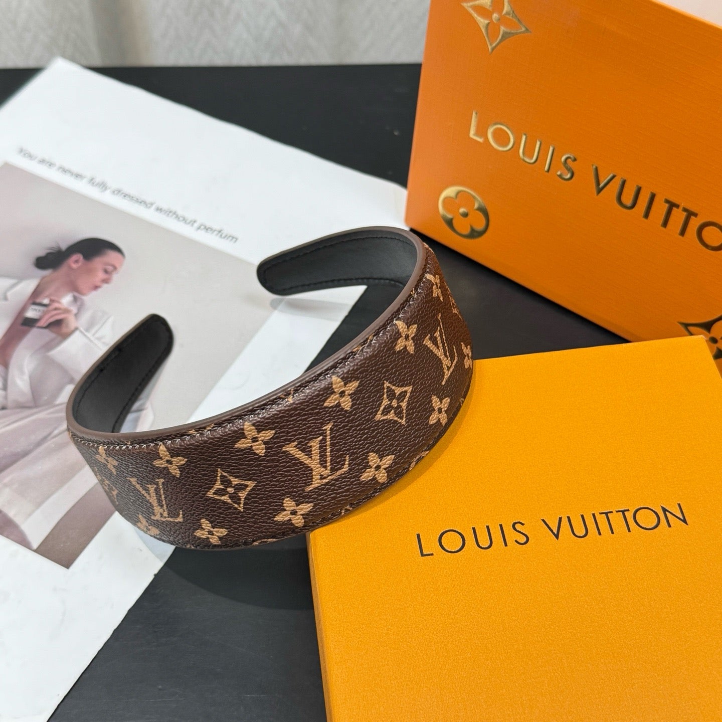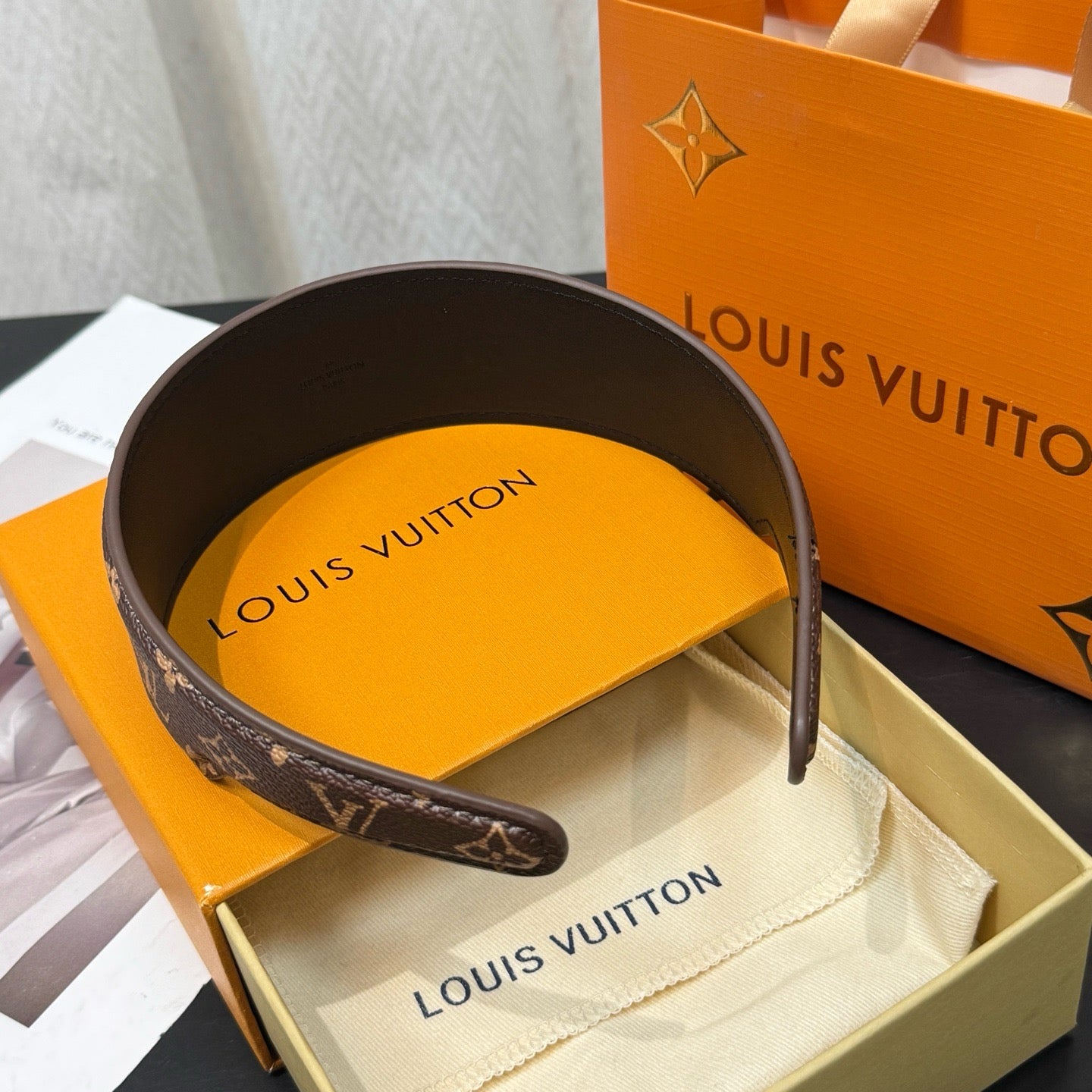 Elegant and easy to wear, the LV Outline headband makes a subtle but eloquent signature statement. With Monogram canvas on the outside plus a fine leather lining, its ingenious ergonomic design ensures a perfect fit, keeping the hair neatly in place all day long. A hot-stamped Louis Vuitton signature on the inside adds a discreet House touch.