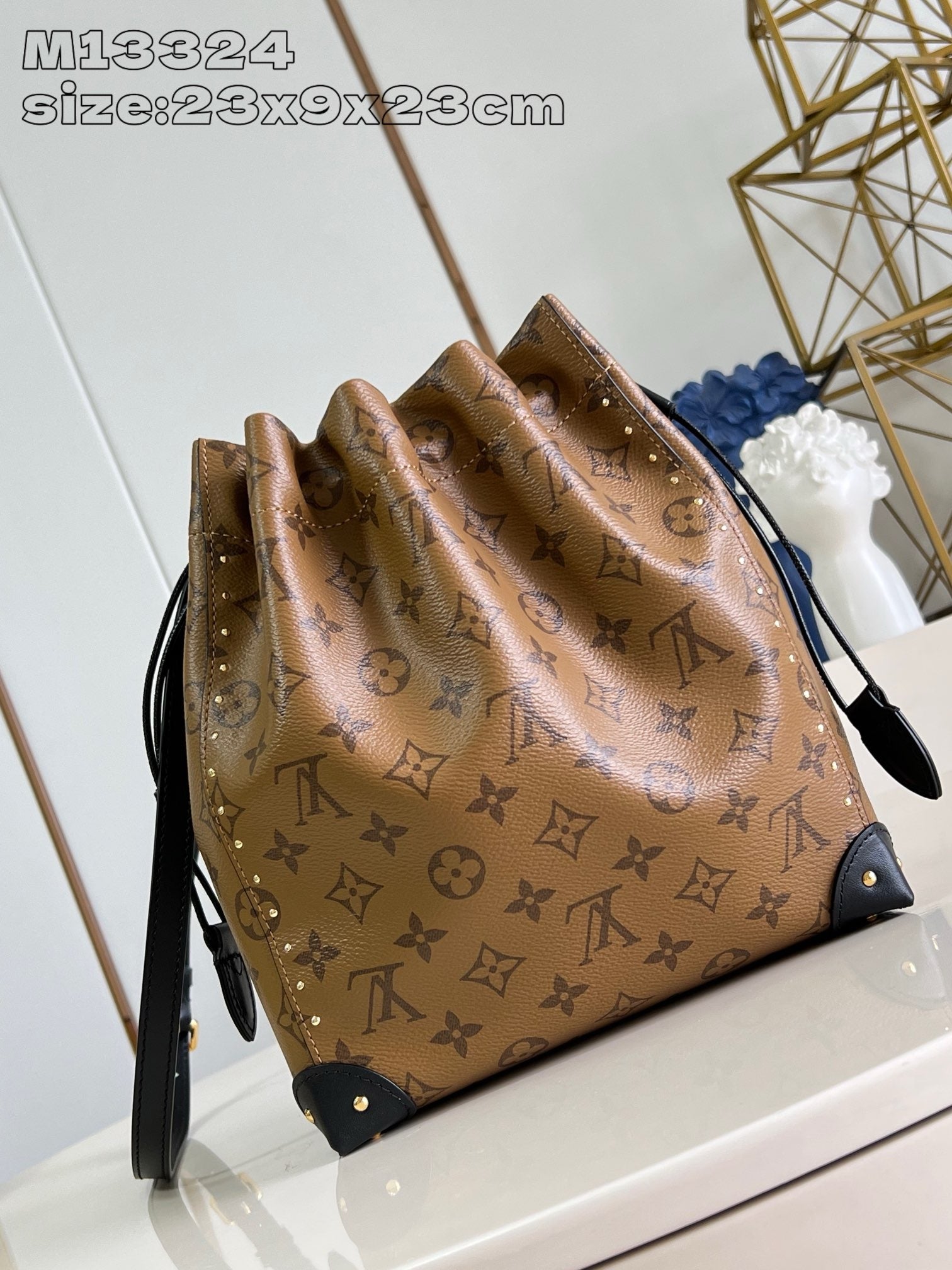 The historical Noé handbag is reinterpreted for Cruise 2025. This version, which is a new member of the Trunk family, showcases iconic DNA details, including leather corners and a drawstring closure. The versatile design is crafted from canvas patterned with the House’s signature Monogram Reverse and is accented with a gold-toned braided chain. Follow the runway styling and carry it by hand, or wear it cross-body.