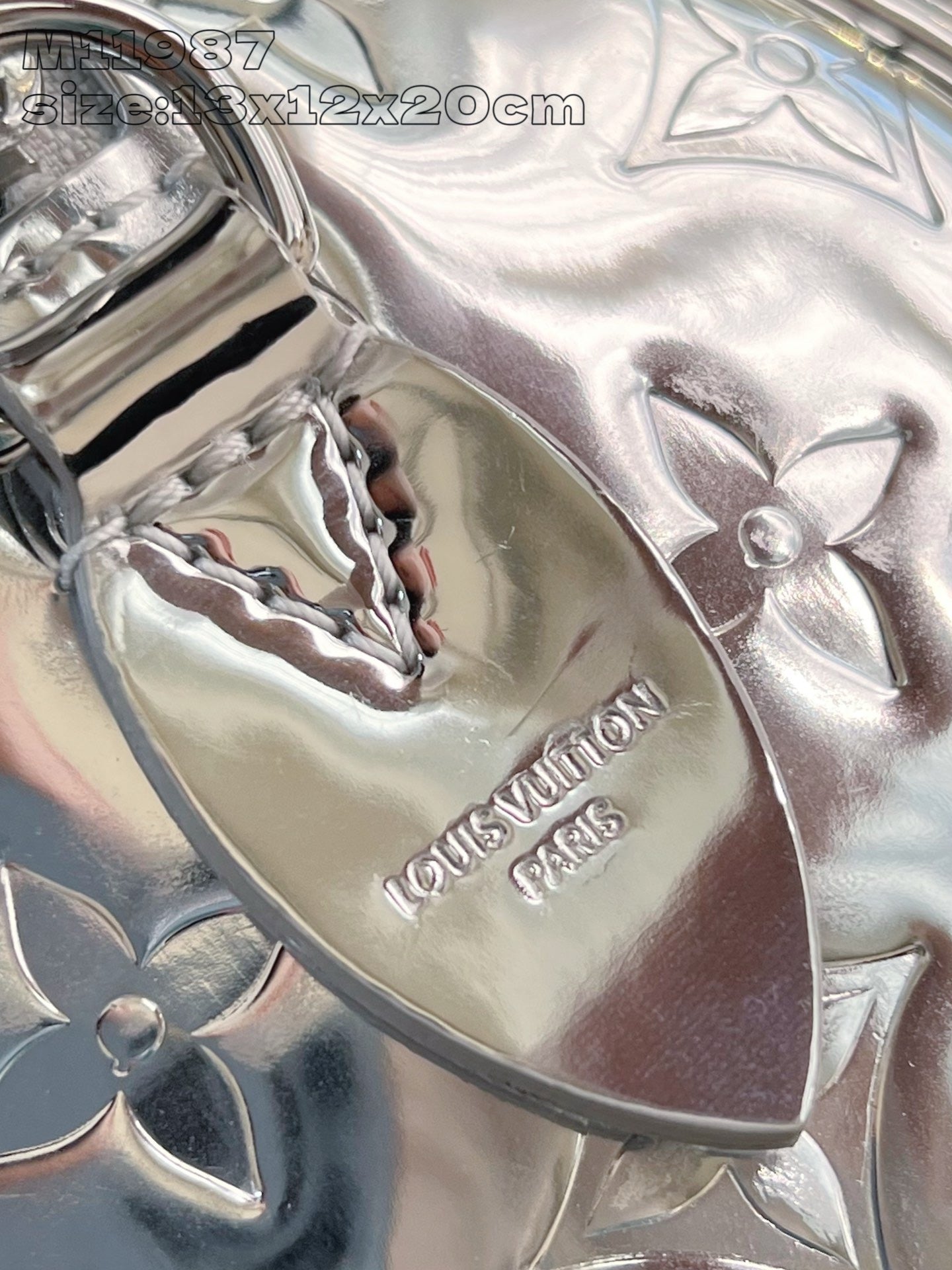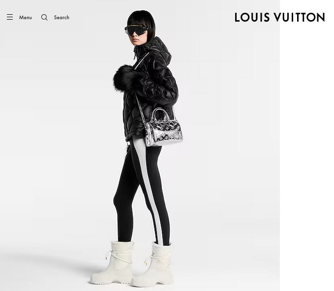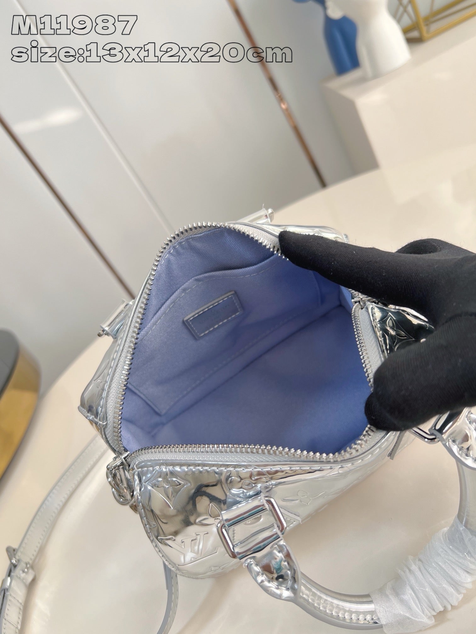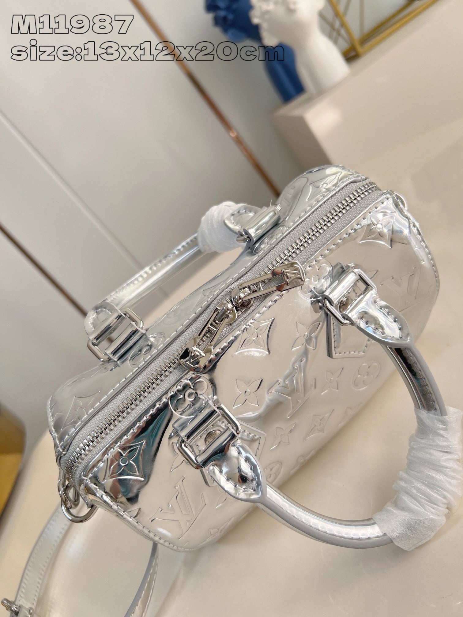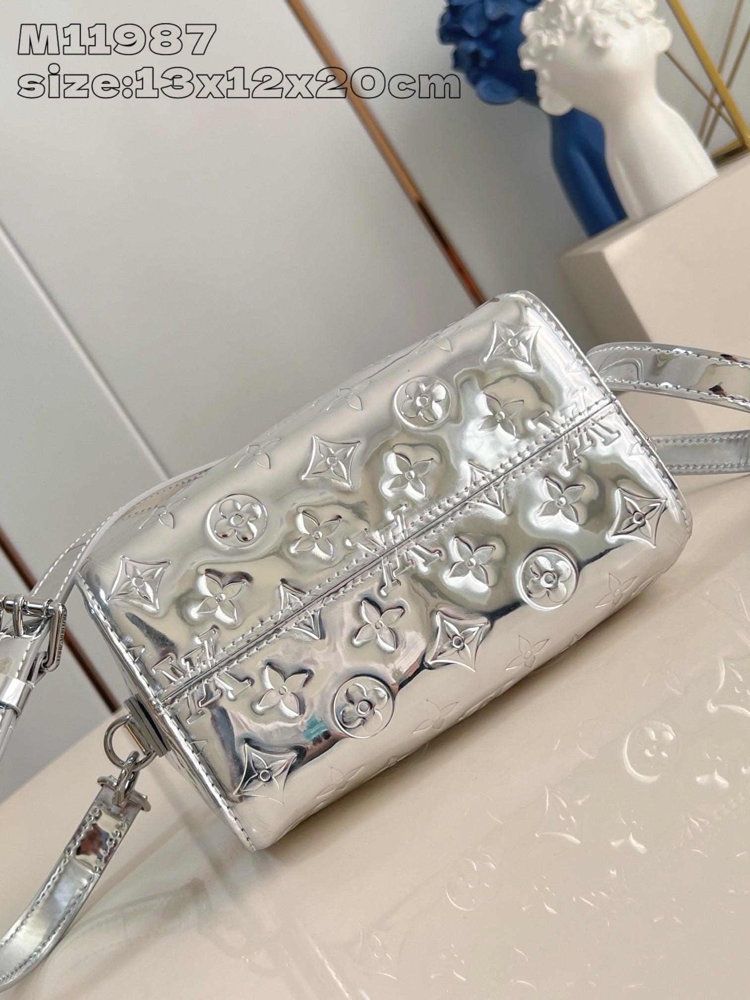 From the LV Ski collection, this Speedy Bandoulière 20 glimmers with the new Monogram Miroir effect, creating a retro-futuristic mood. It is crafted from embossed coated canvas, trimmed with smooth leather and finished with silver-toned hardware. The statement style offers multiple carry options thanks to the removable and adjustable leather strap and is sized to fit everyday essentials, including a long wallet.