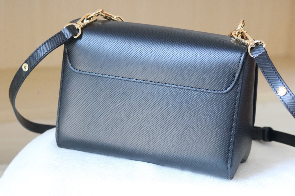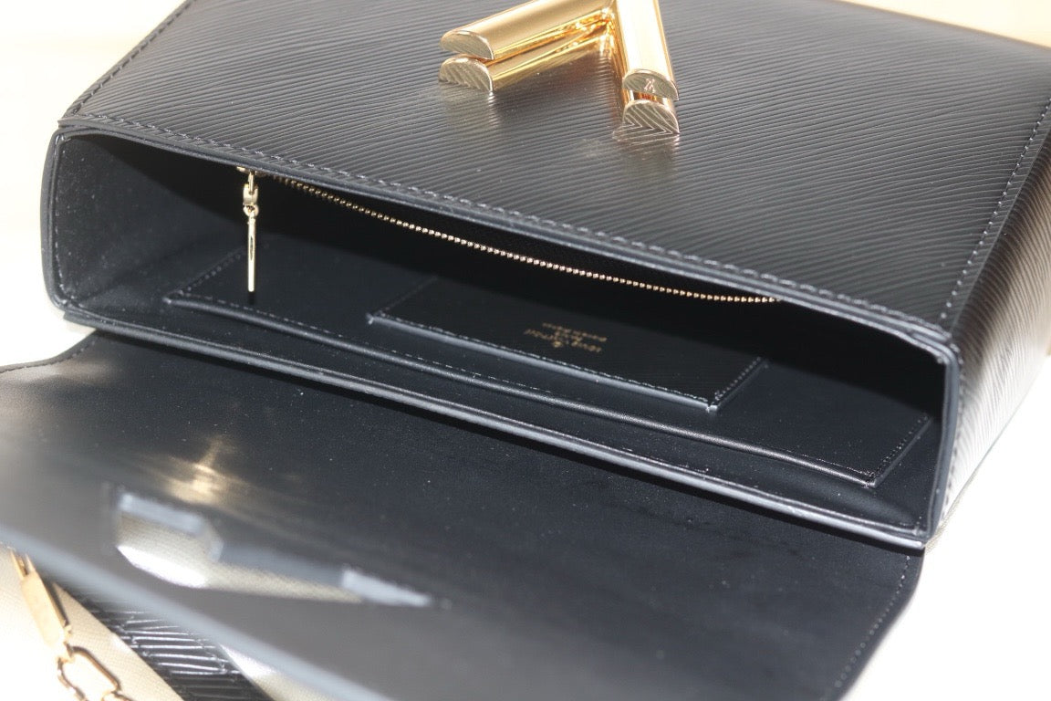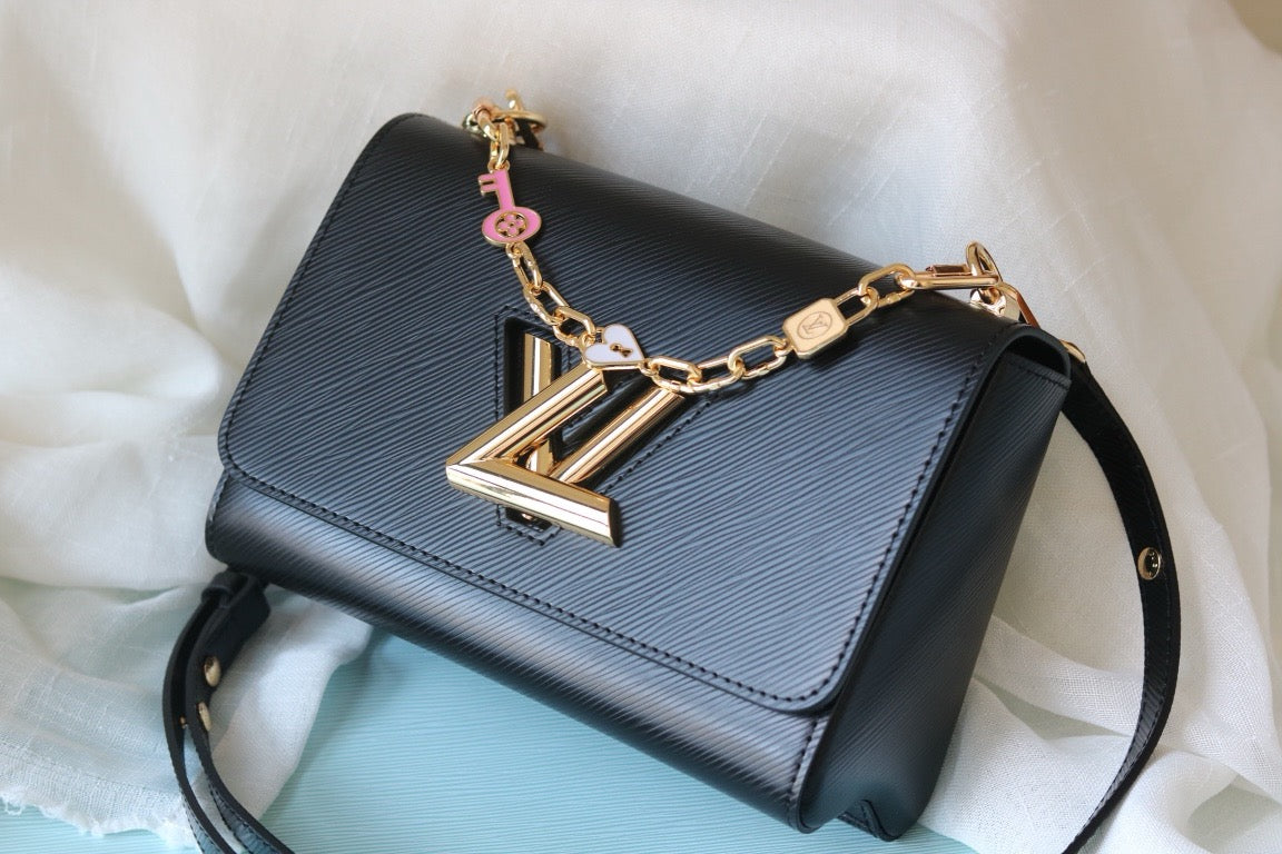 This Twist MM handbag is made from Epi leather, with its distinctive ridged grain, and trimmed in smooth cowhide leather. It features an elegant thin chain with enamel Monogram Flower charms and is lined in cowhide leather. The removable smart strap adjusts for shoulder and cross-body carry.