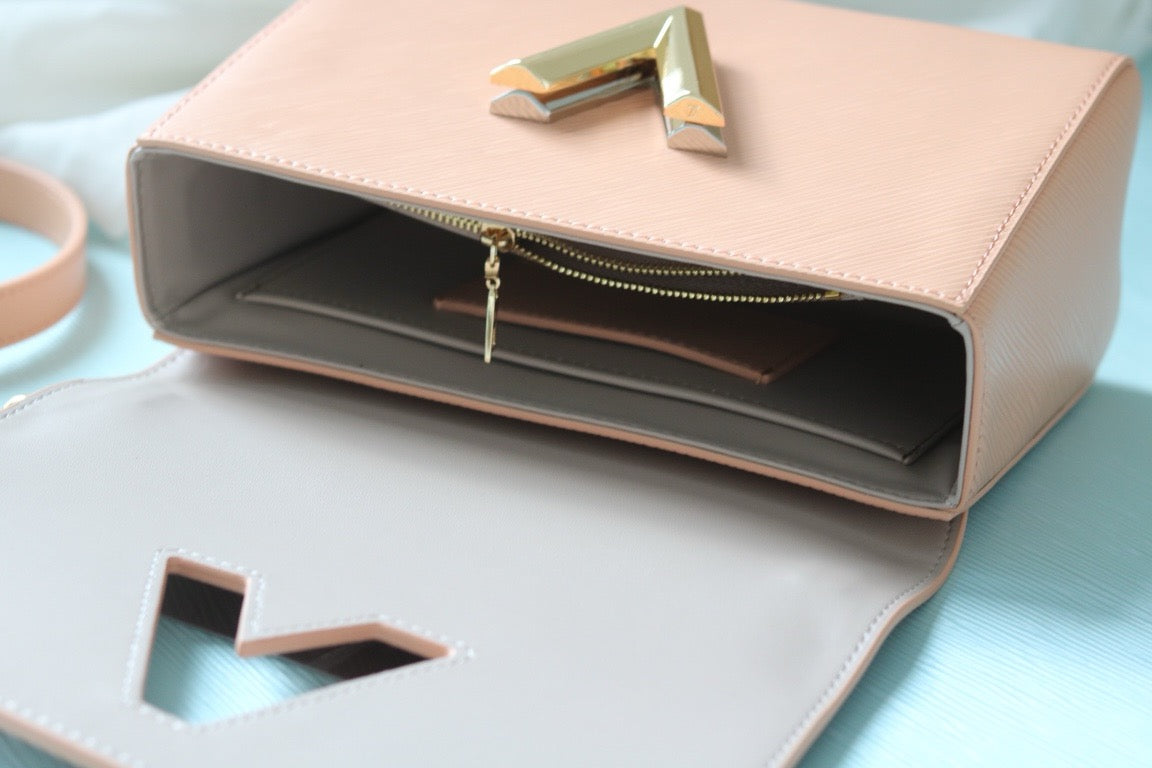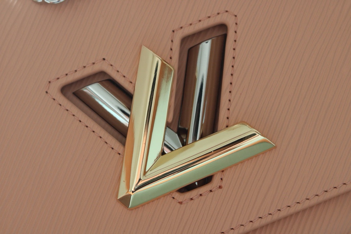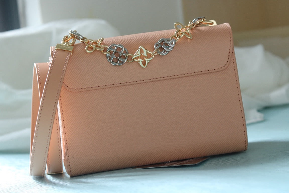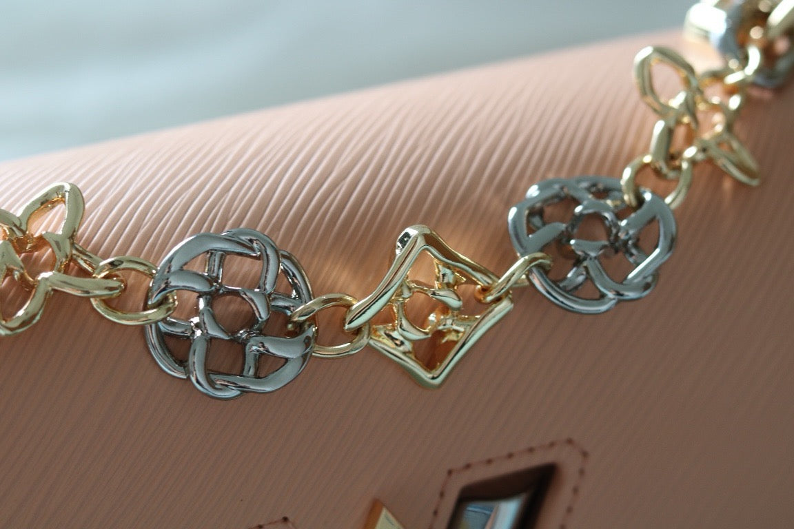 This Twist MM handbag is made from Epi leather, with its distinctive ridged grain, and trimmed in smooth cowhide leather. It features an elegant thin chain with enamel Monogram Flower charms and is lined in cowhide leather. The removable smart strap adjusts for shoulder and cross-body carry.