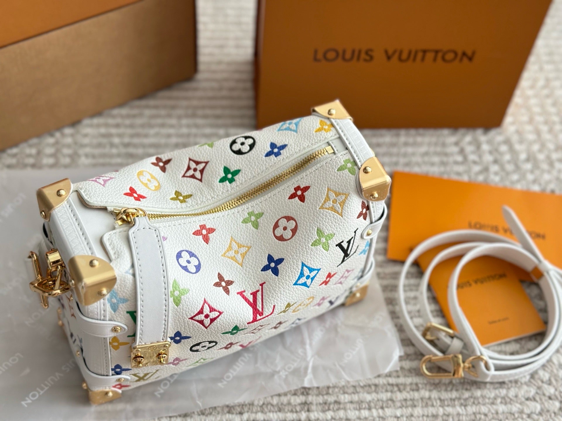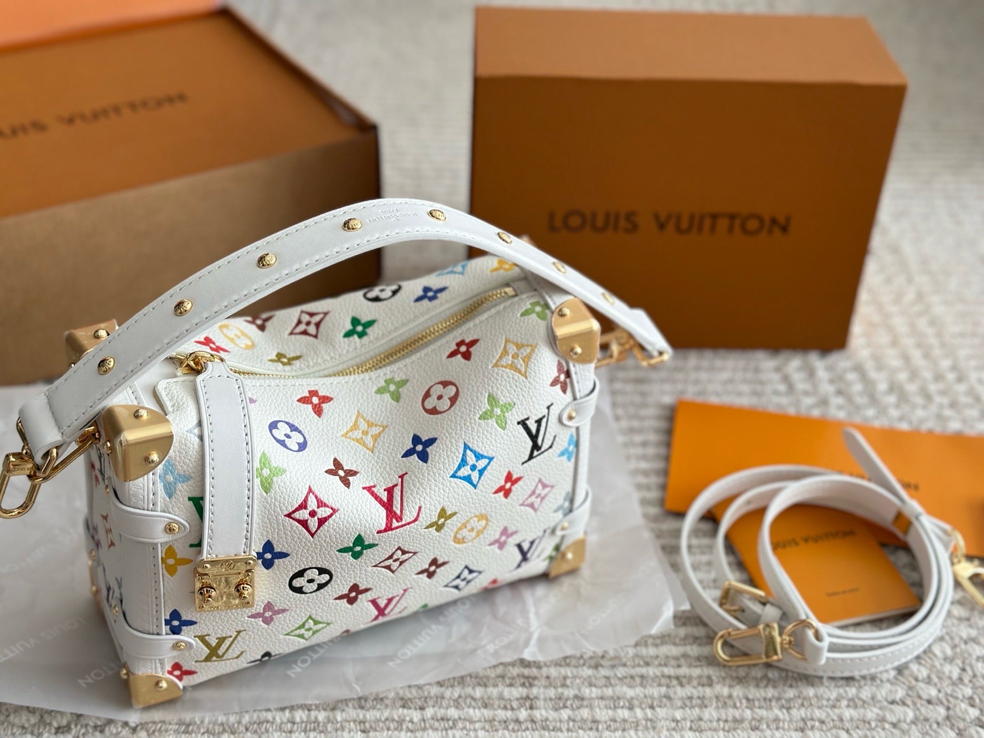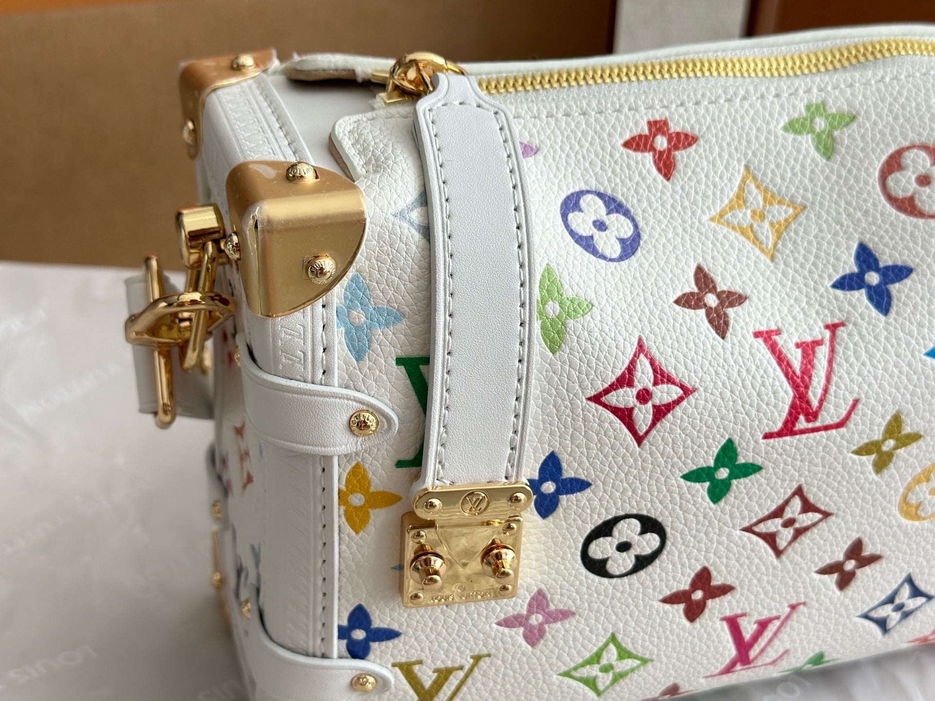 The iconic Side Trunk MM makes a spirited everyday statement in a playful version of the Monogram motif from the re-edition of the Louis Vuitton x Murakami collection. Crafted from supple cowhide, the rectangular silhouette pays homage to the House’s archival luggage complete with golden reinforced corners and an emblematic S-lock closure. The removable handle embellished with studs and strap offer versatile carry options, while the inside is large enough to stow daily essentials.