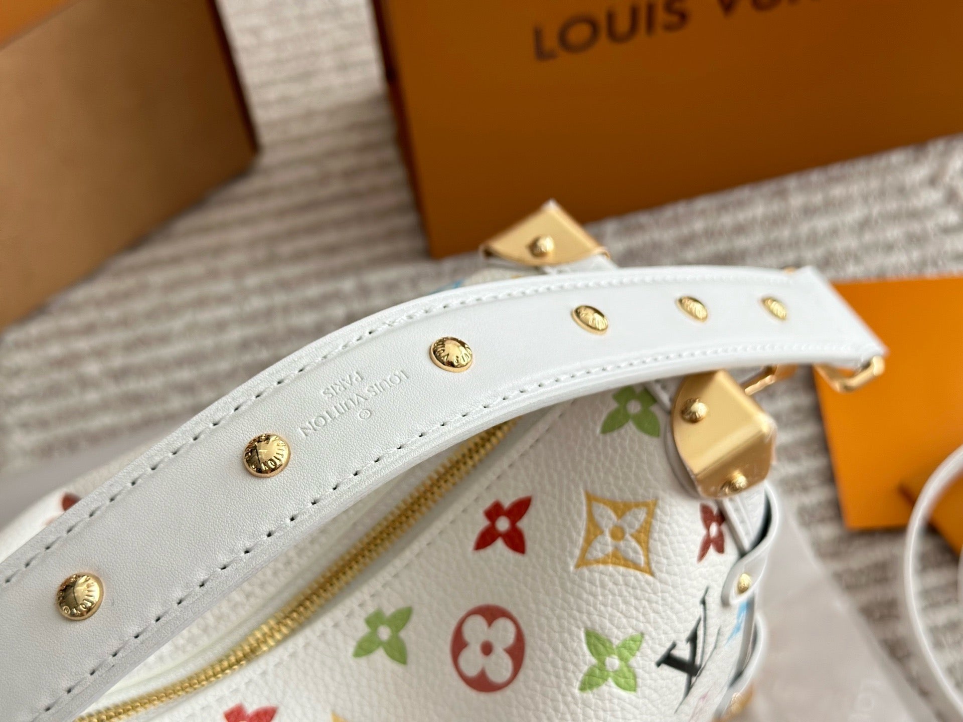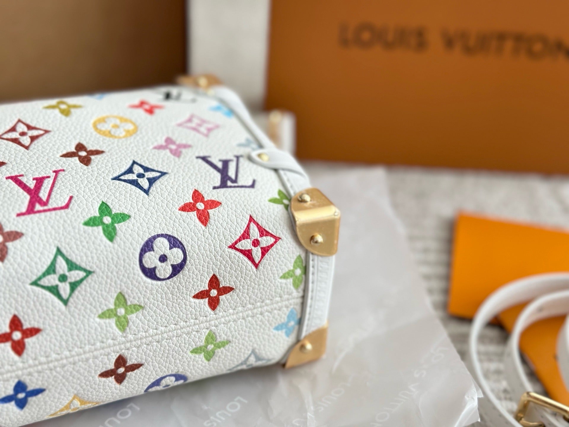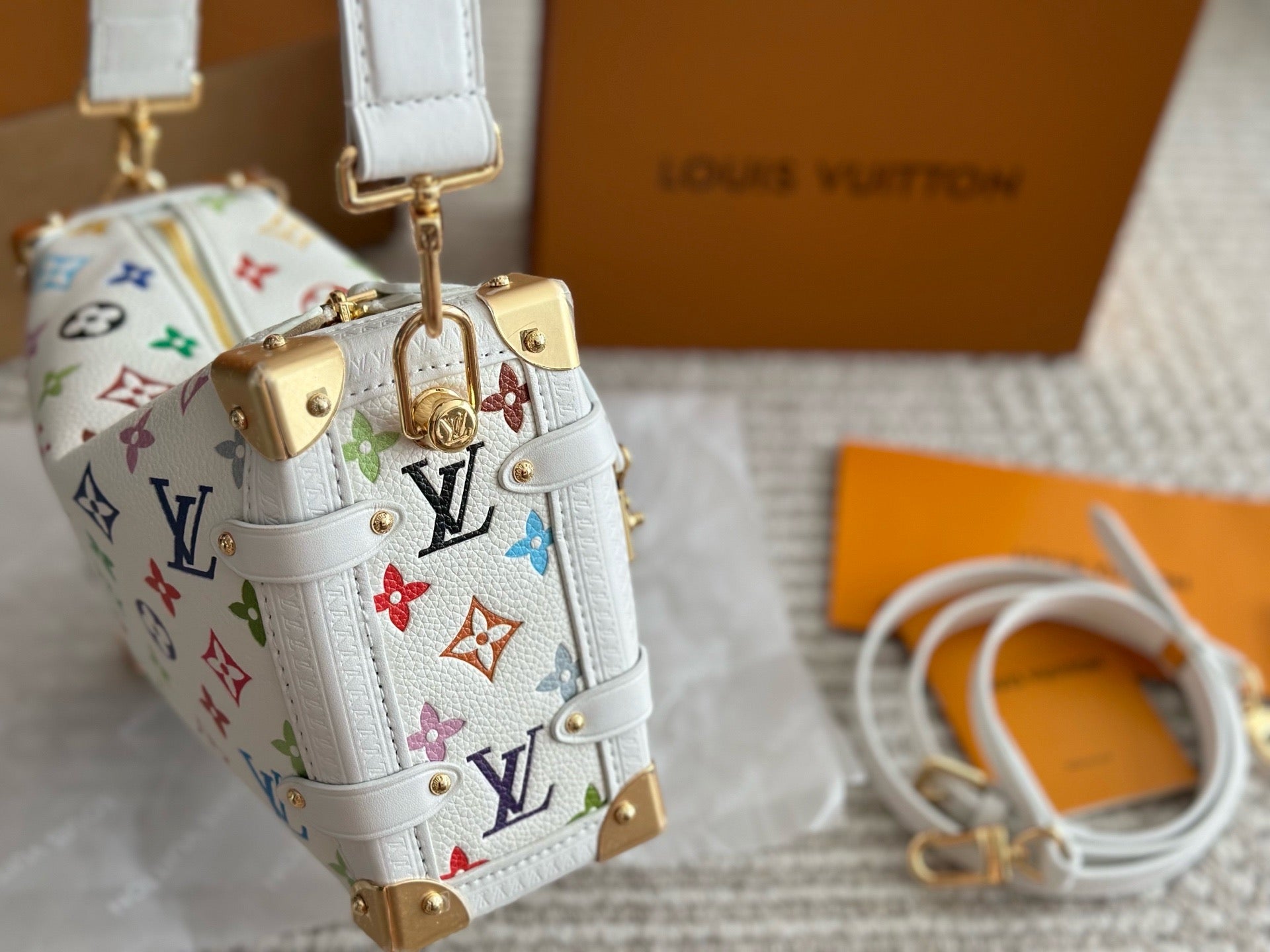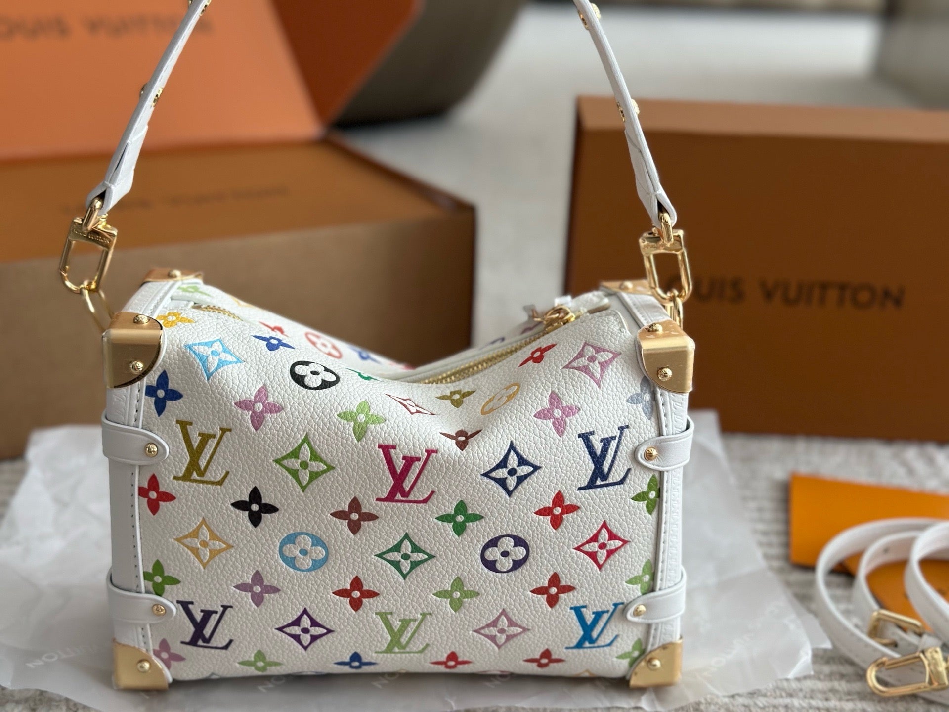 The iconic Side Trunk MM makes a spirited everyday statement in a playful version of the Monogram motif from the re-edition of the Louis Vuitton x Murakami collection. Crafted from supple cowhide, the rectangular silhouette pays homage to the House’s archival luggage complete with golden reinforced corners and an emblematic S-lock closure. The removable handle embellished with studs and strap offer versatile carry options, while the inside is large enough to stow daily essentials.