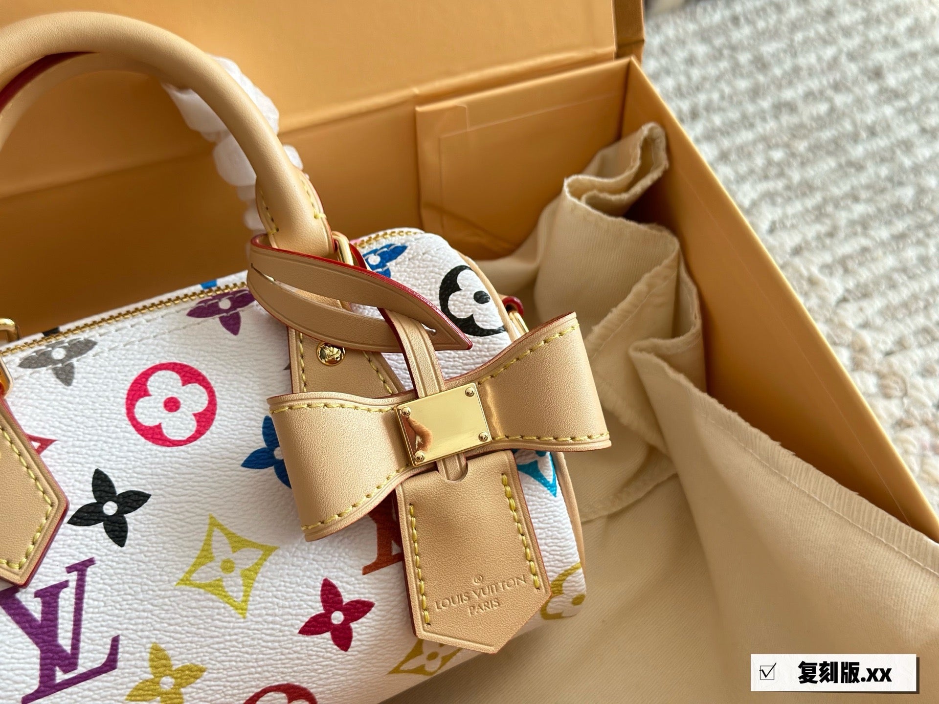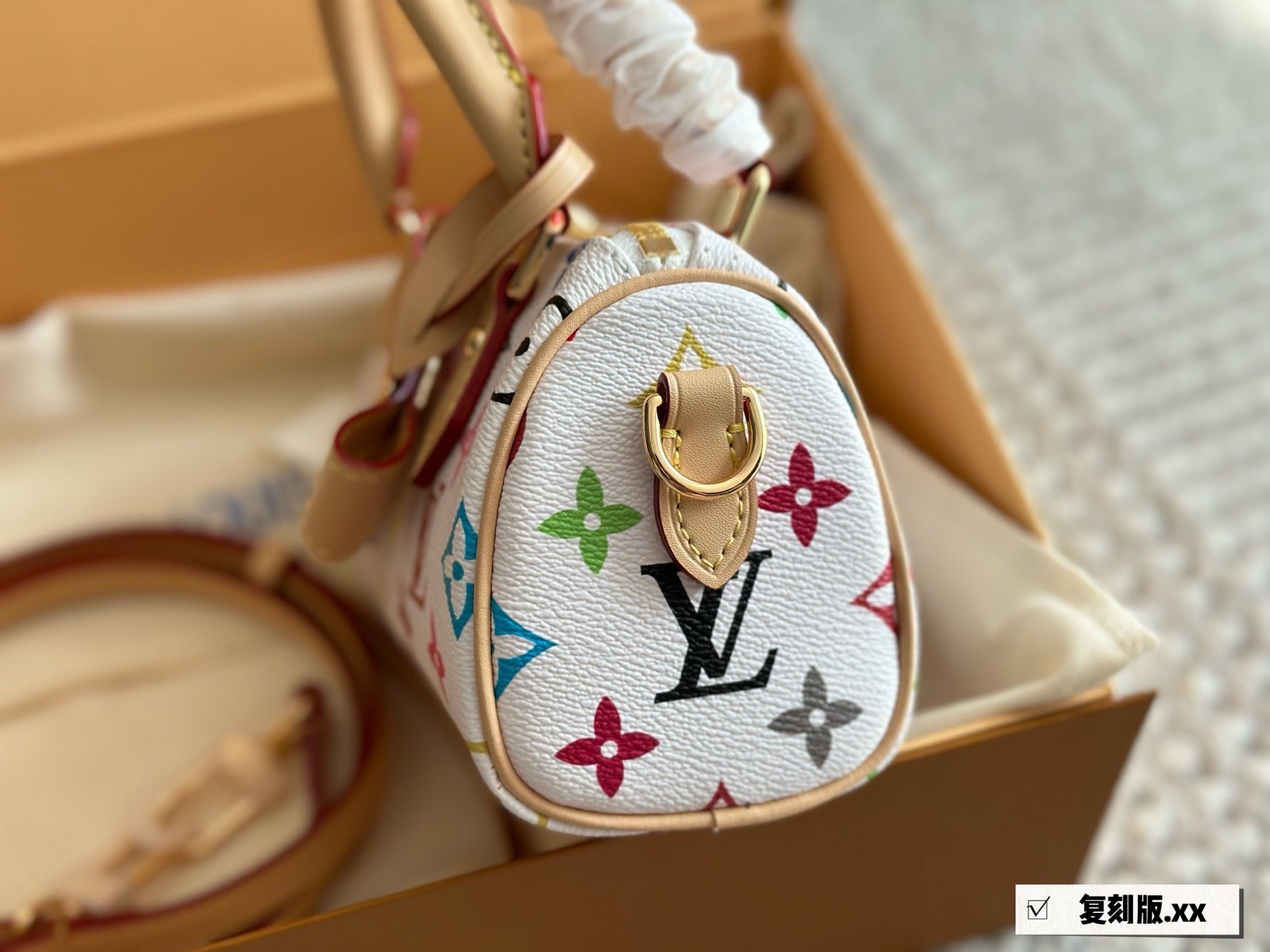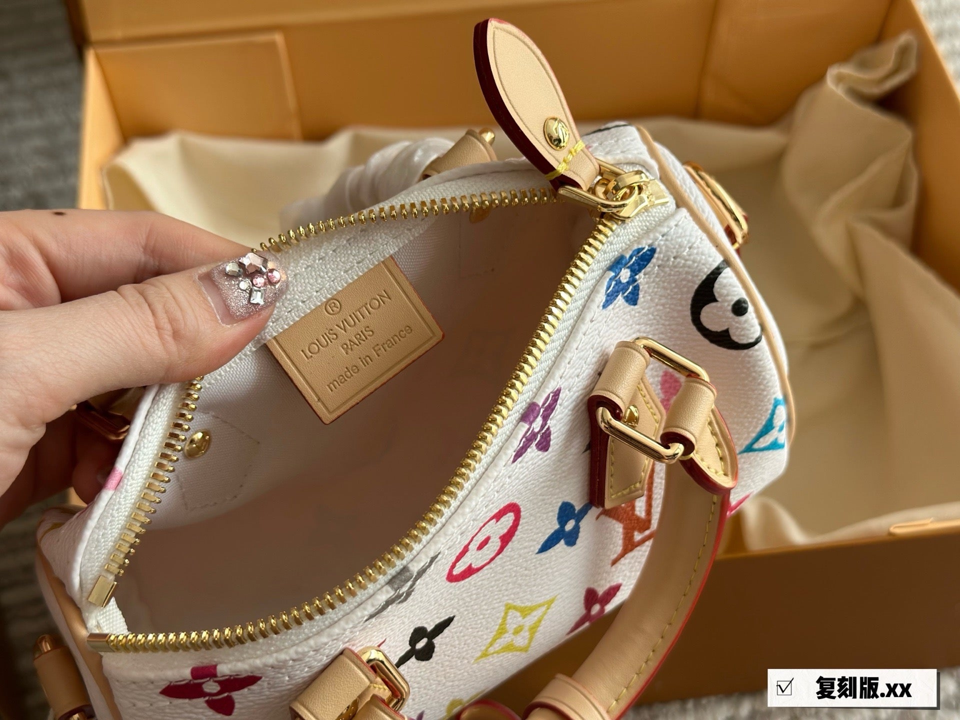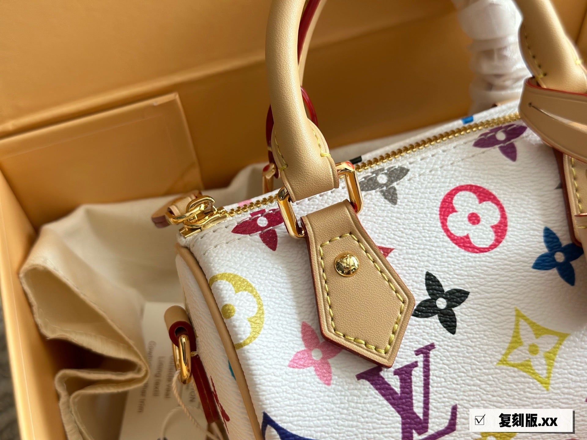 The scaled-down Nano Speedy makes a playful statement in Monogram coated canvas, which has been reworked in upbeat tones as part of the re-edition of the Louis Vuitton x Murakami collection. Natural cowhide leather trims add a timeless touch, as do two Toron top handles and a gleaming golden padlock in homage to the House’s travel heritage. Complete with a removable, adjustable strap and an exclusive LV x TM keybell.