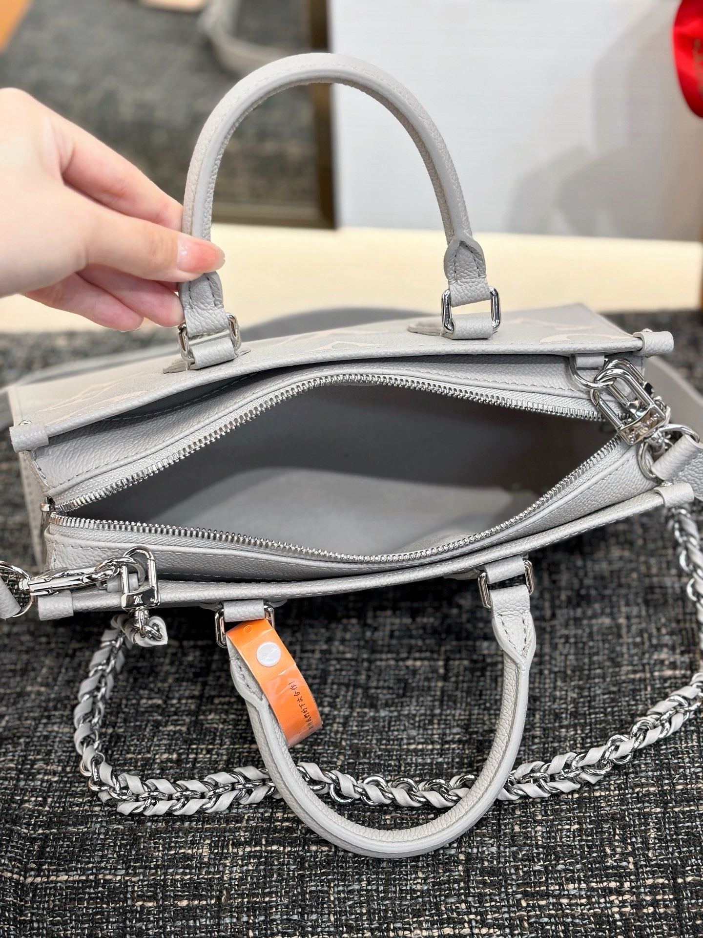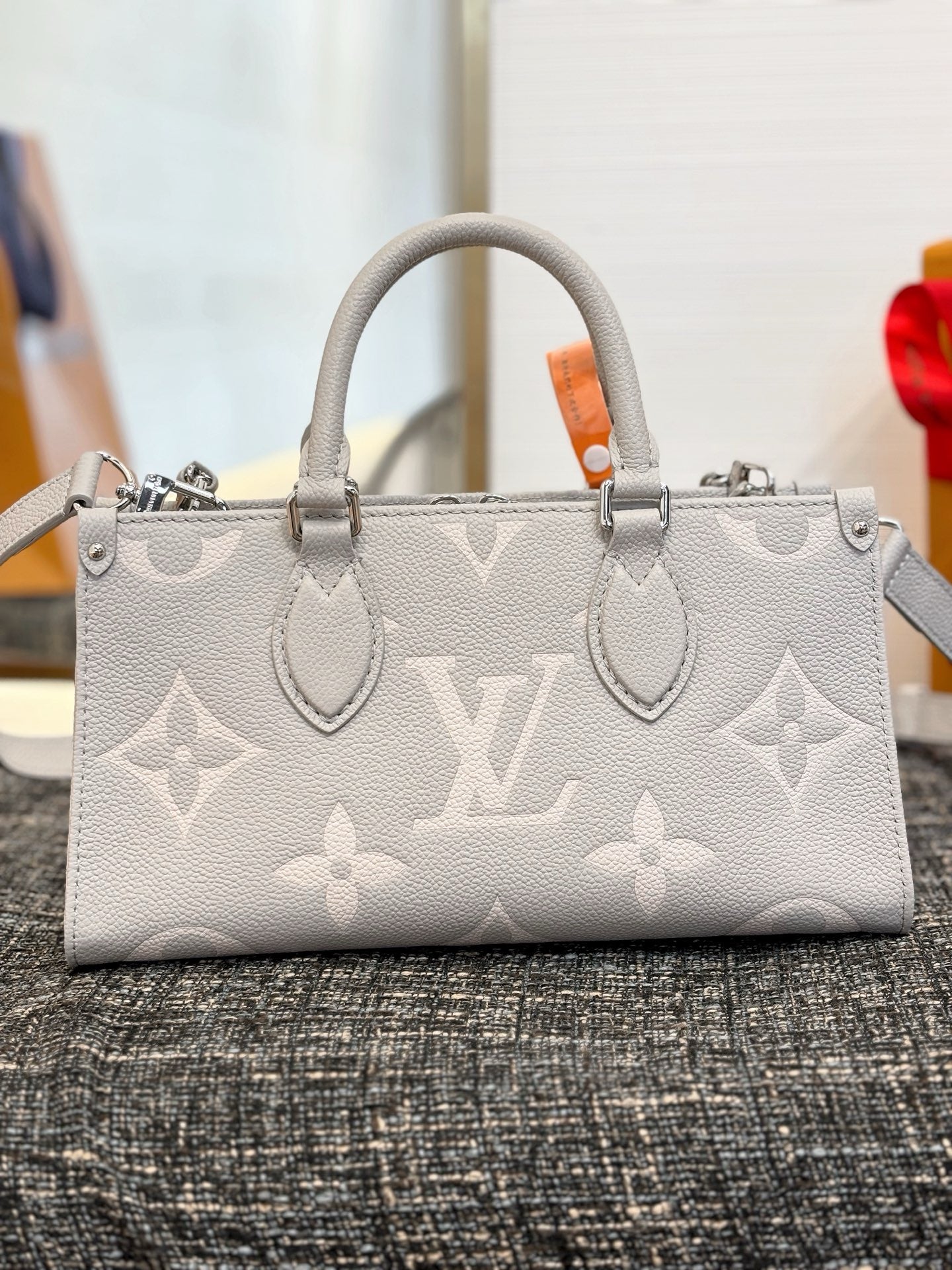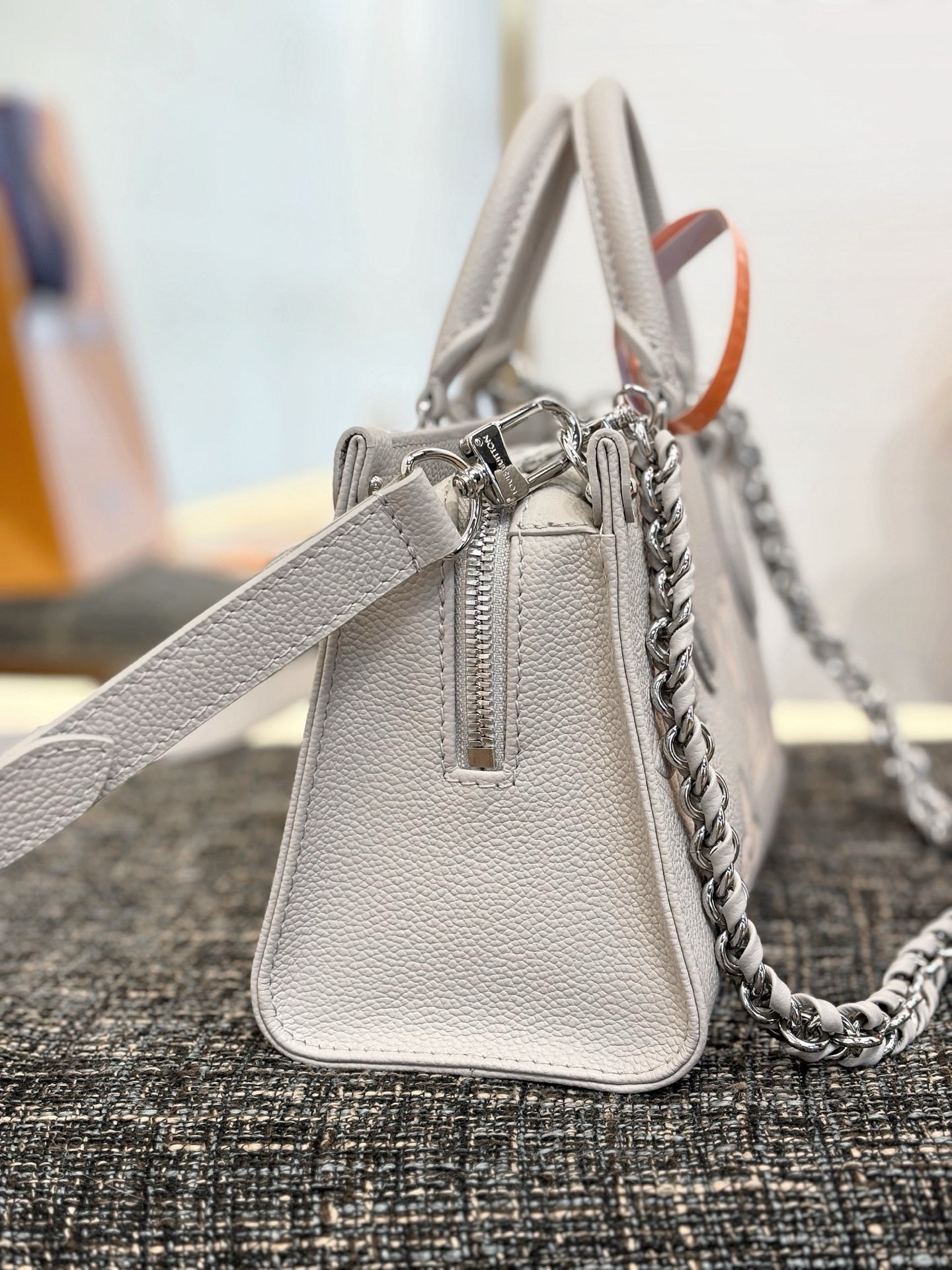 Part of the LV Milky Way collection, this OnTheGo East West bag showcases a refined bicolor palette for the season. It is crafted from signature Monogram Empreinte leather and accented with silver-toned hardware, including a removable braided chain. The compact style offers multiple interior and outer compartments to store essentials, and can be worn several ways.
