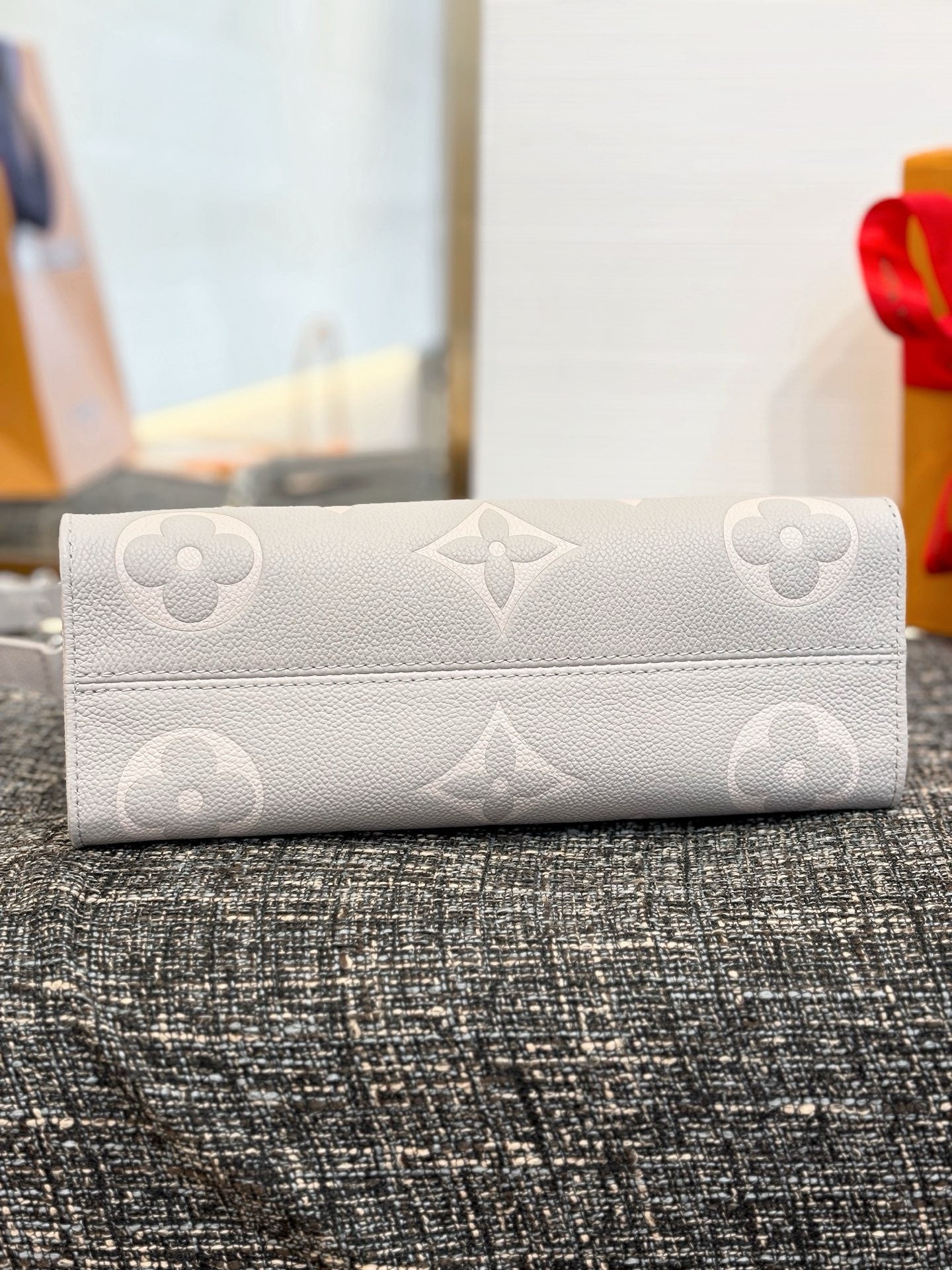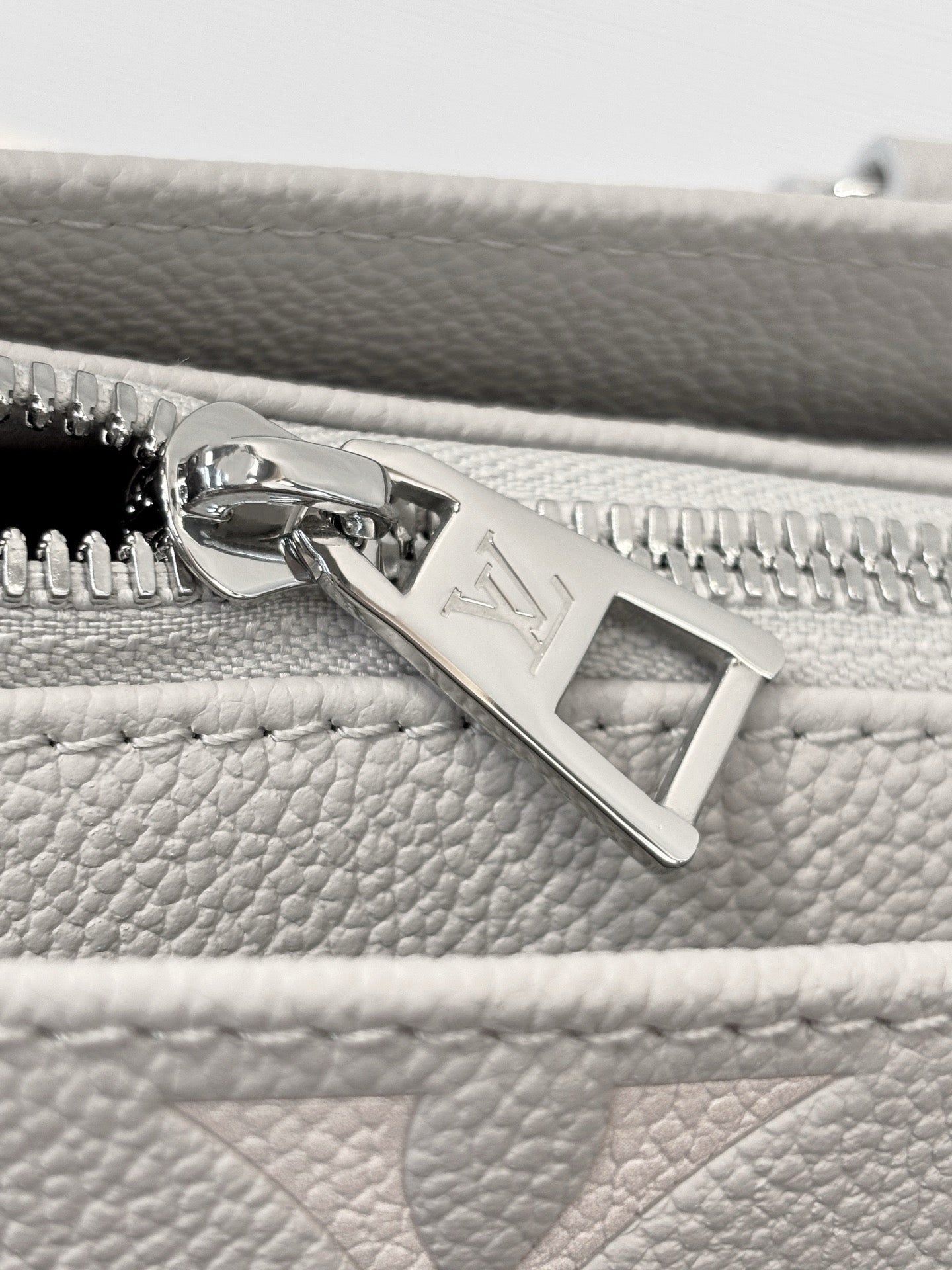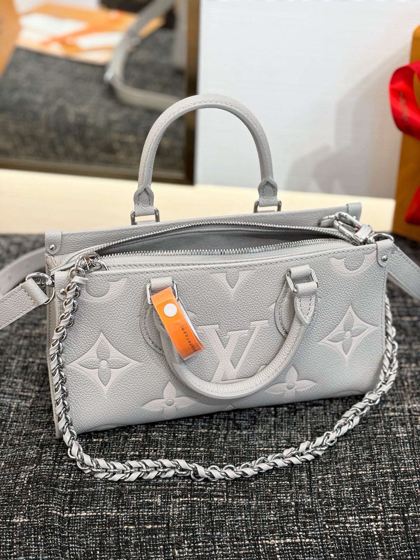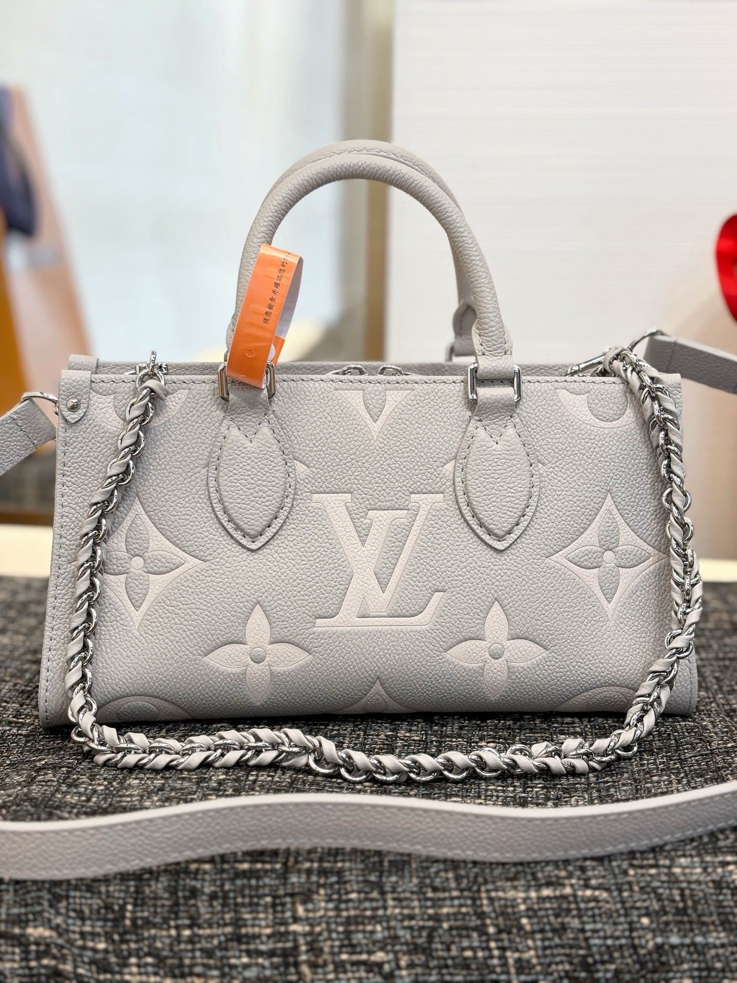 Part of the LV Milky Way collection, this OnTheGo East West bag showcases a refined bicolor palette for the season. It is crafted from signature Monogram Empreinte leather and accented with silver-toned hardware, including a removable braided chain. The compact style offers multiple interior and outer compartments to store essentials, and can be worn several ways.