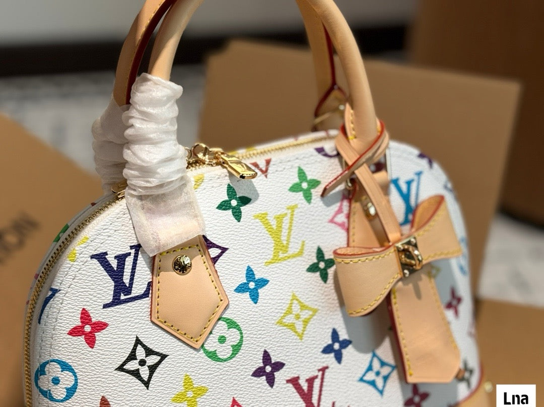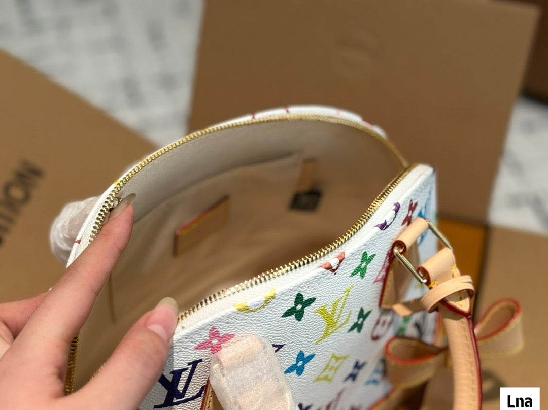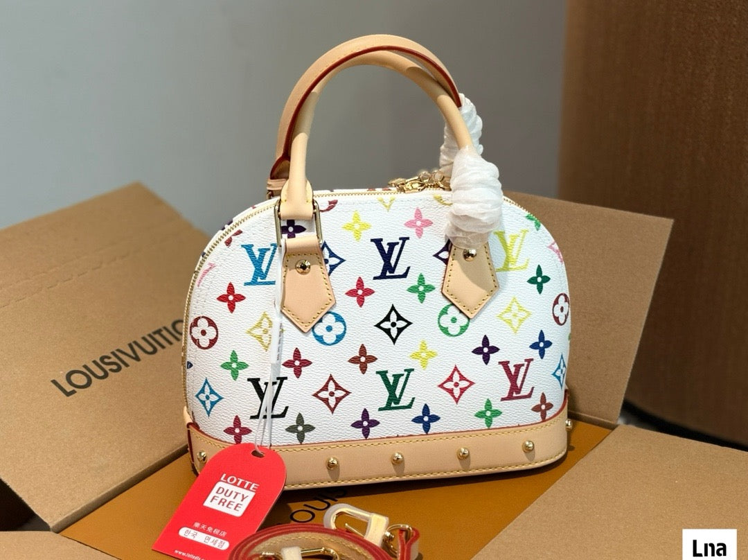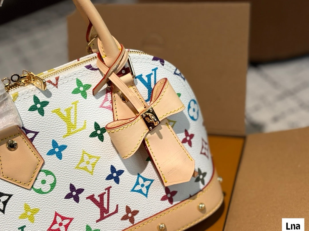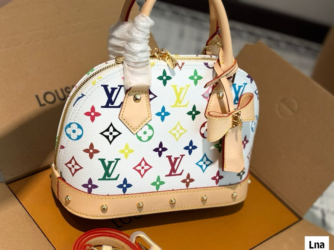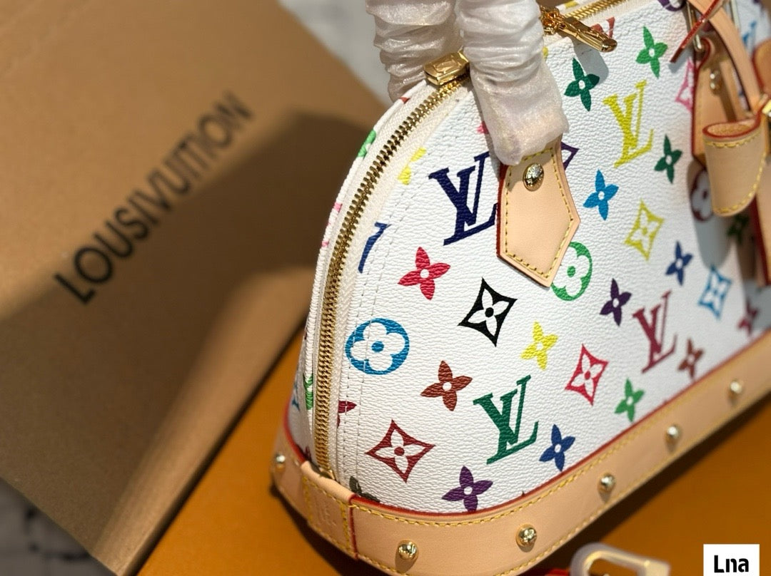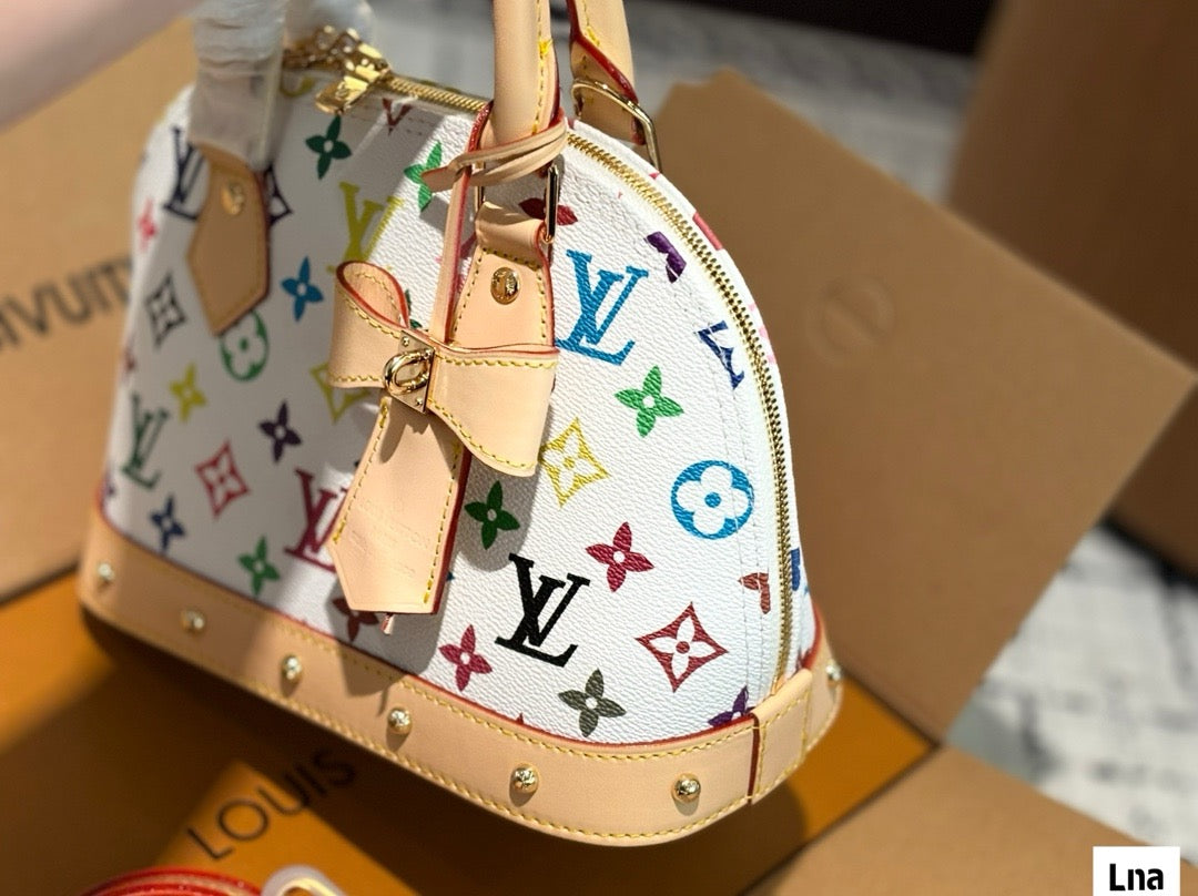 Originally inspired by a 1930s Art Deco design, this edition of the Alma BB has a celebratory spirit in the Louis Vuitton x Murakami collection’s multicolored Monogram coated canvas, which draws on the Japanese artist’s playful palette. The House’s natural cowhide leather adds an emblematic touch to the refined Toron top handles, the bottom, the removable strap, and the exclusive LV x TM keybell.