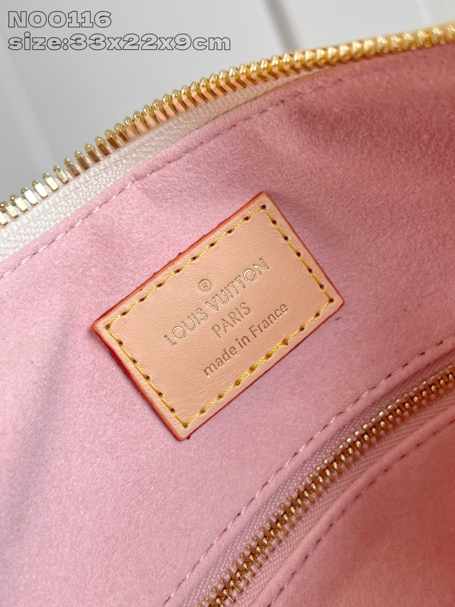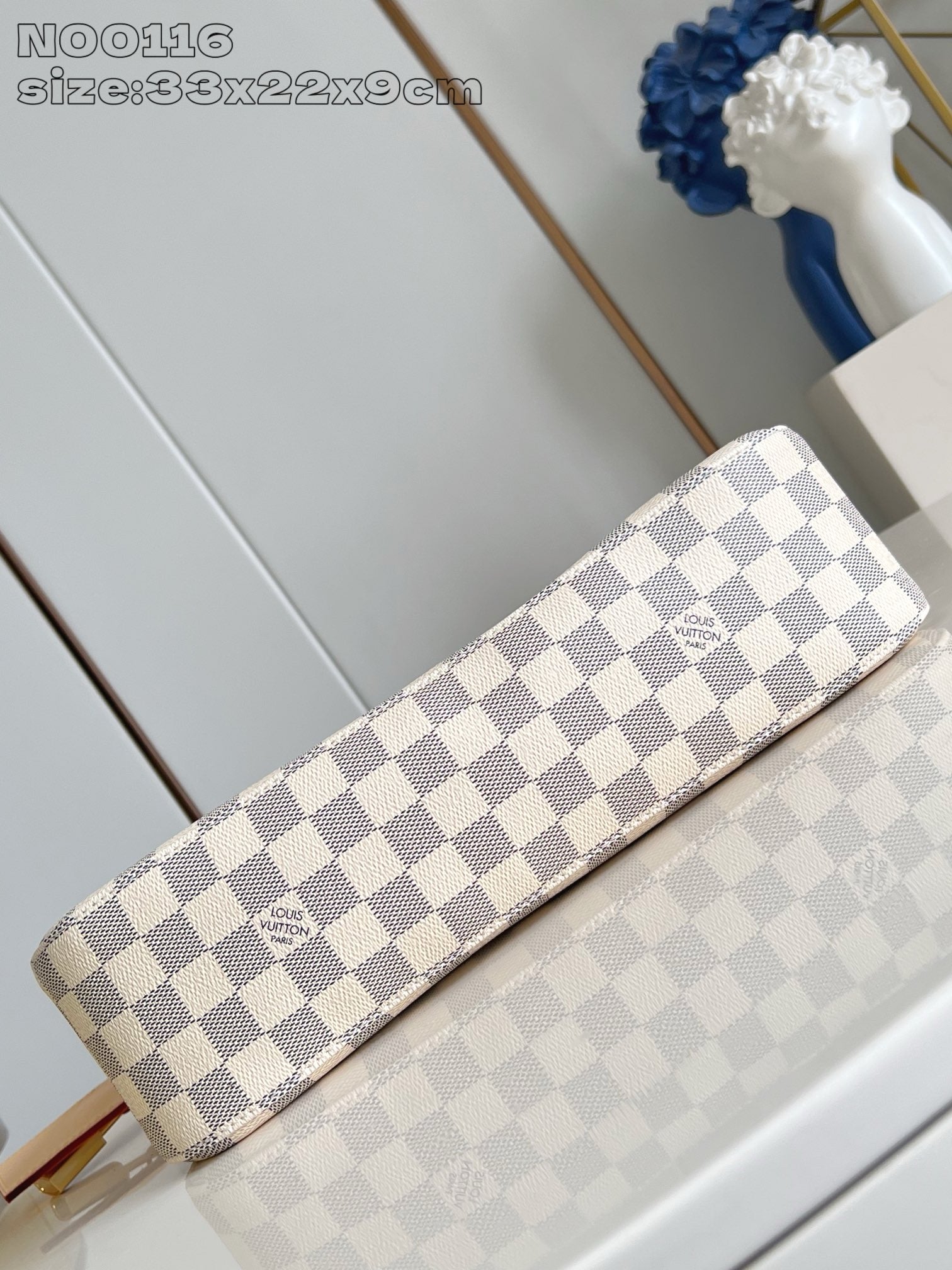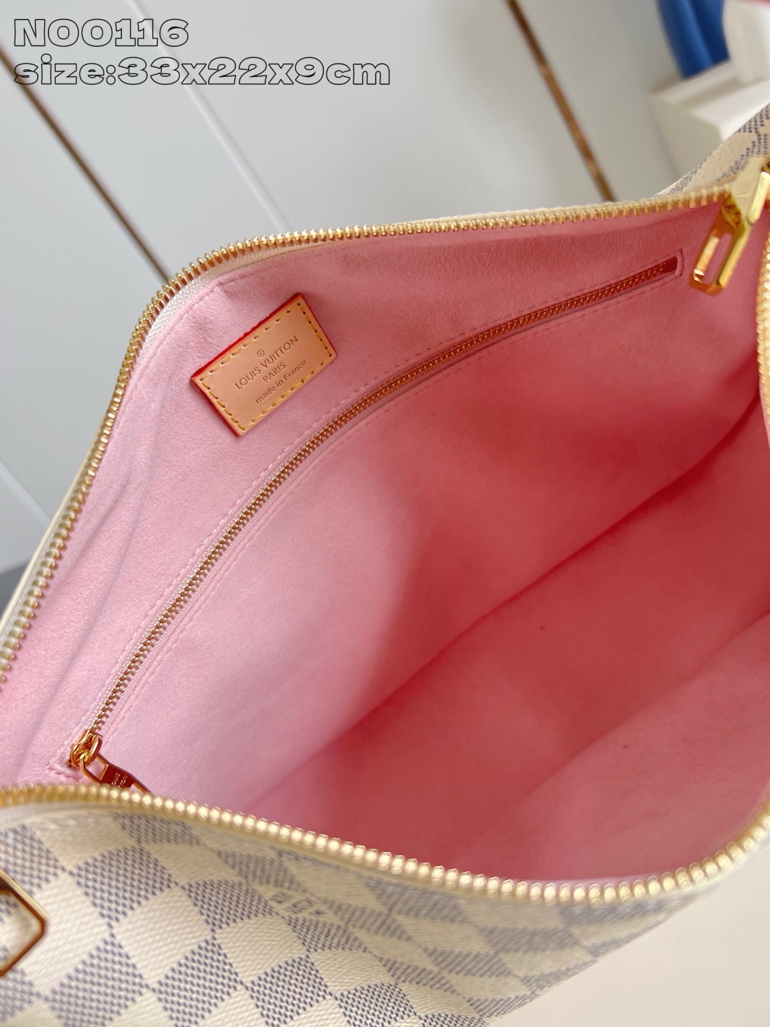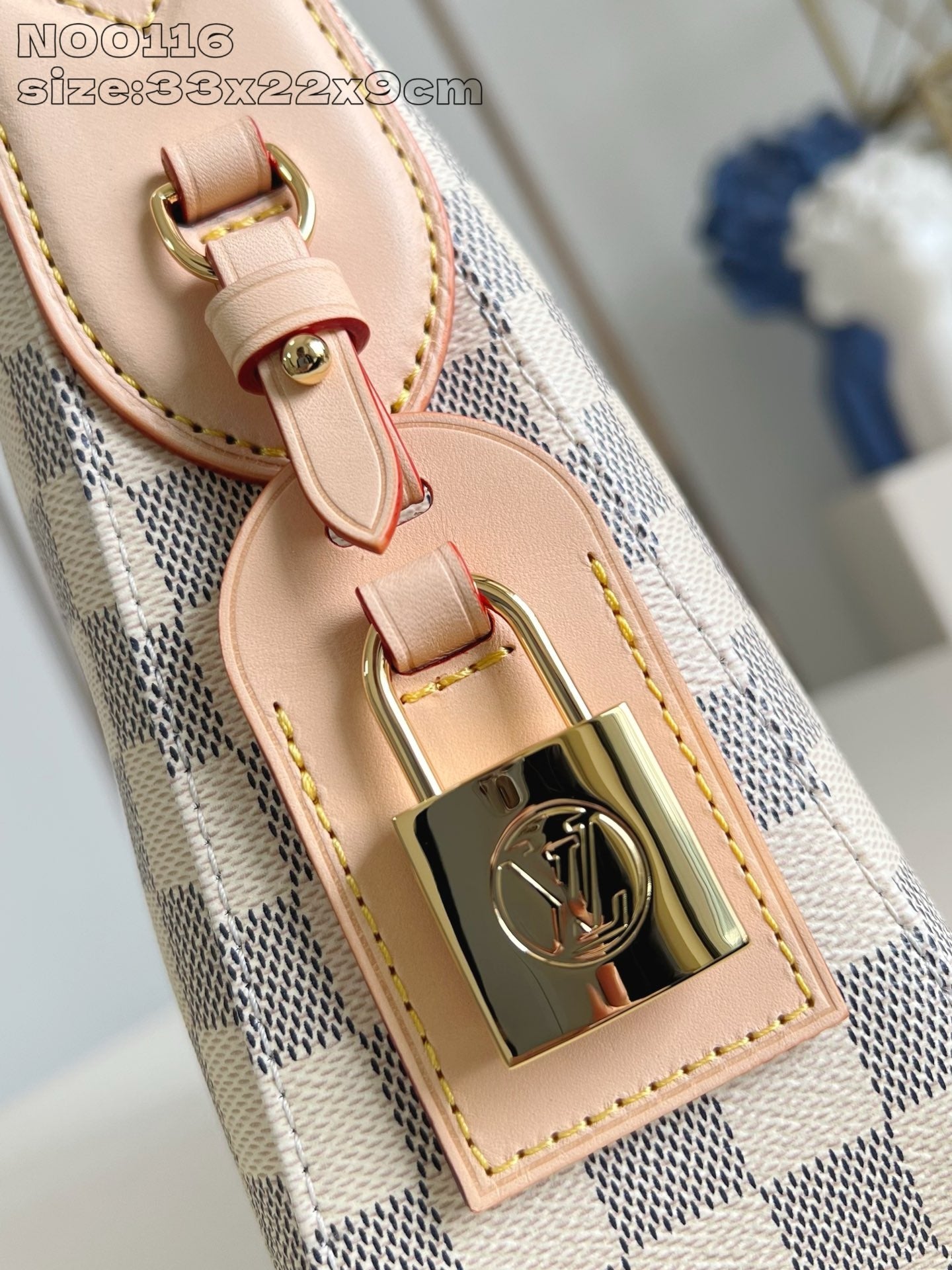 Part of the Damier Azur collection, this edition of the Slouchy PM is inspired by the elegant lifestyle of the French Riviera. The unique pattern is created using a heliogravure printing process and is complemented with sleek gold-toned hardware. Signature details include the natural leather name tag, which includes a padlock that symbolizes the House's heritage and craftsmanship.