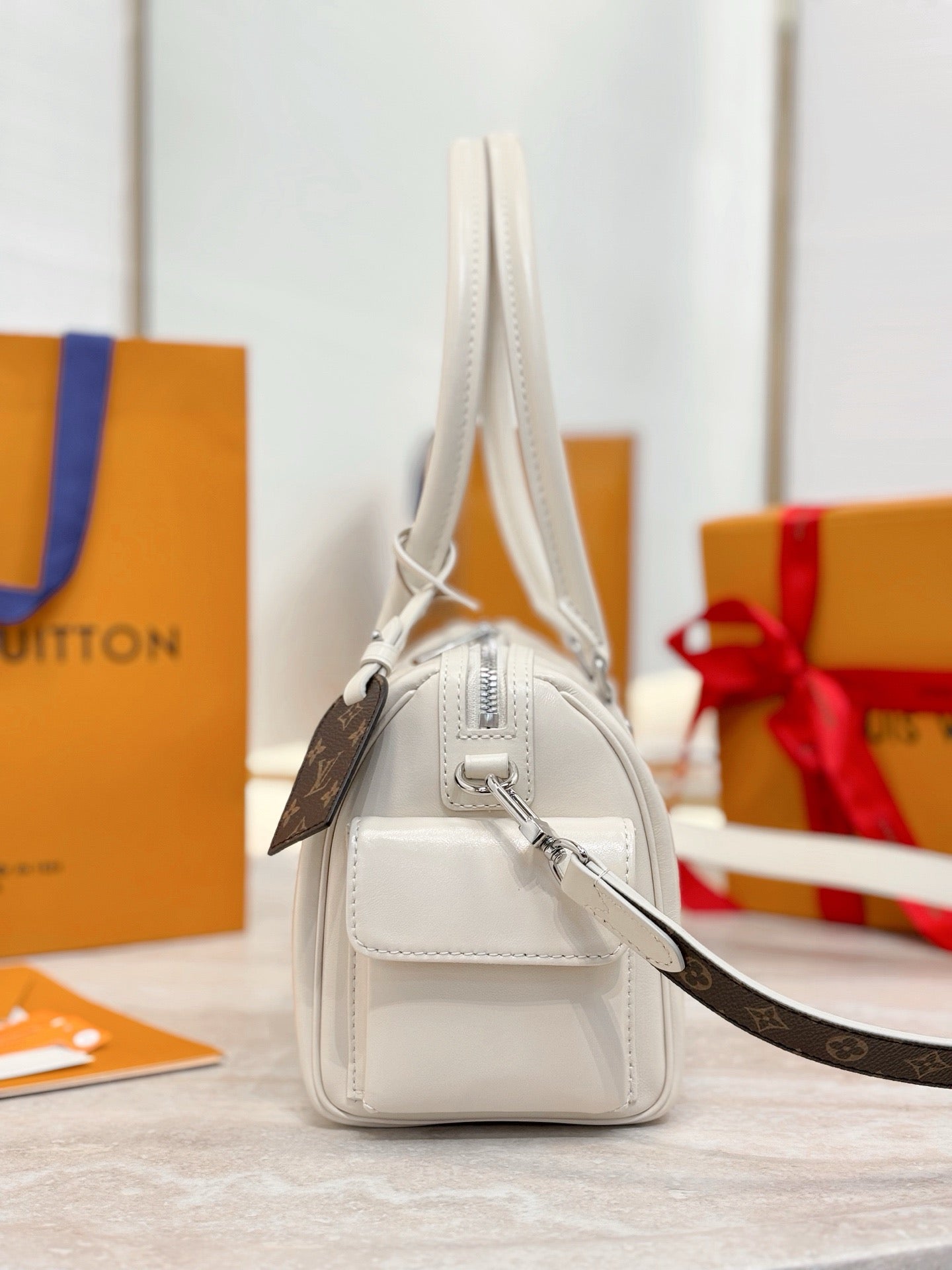 Part of the LV Vibe collection, the Speedy Cargo reimagines the original 1930s design with a neo-rock edge. It is crafted from glossy lambskin and accented with a Monogram address tag, paying tribute to the House’s trunk-making heritage. Capaciously sized for everyday essentials, it offers multiple carry options thanks to the removable leather strap.