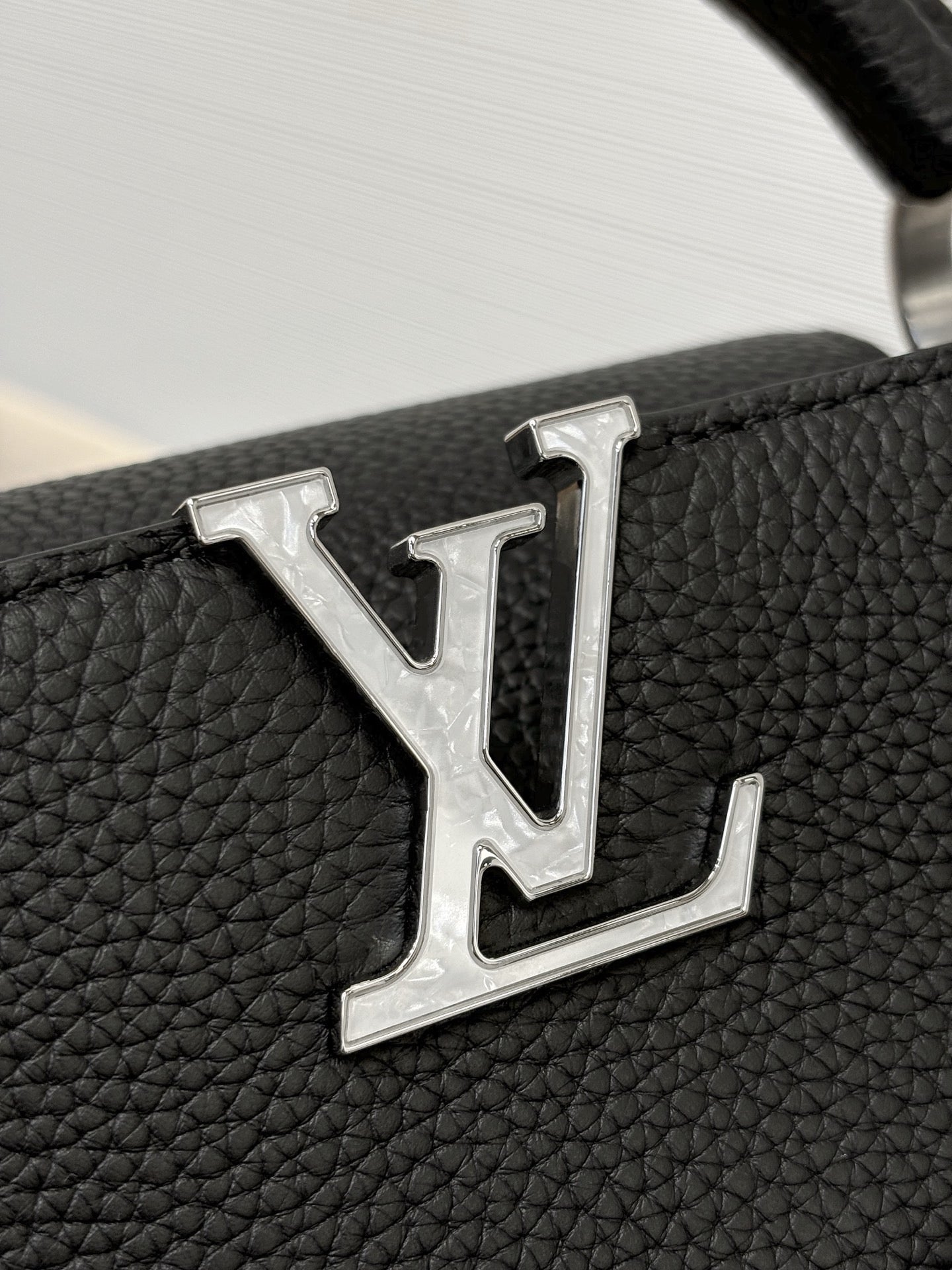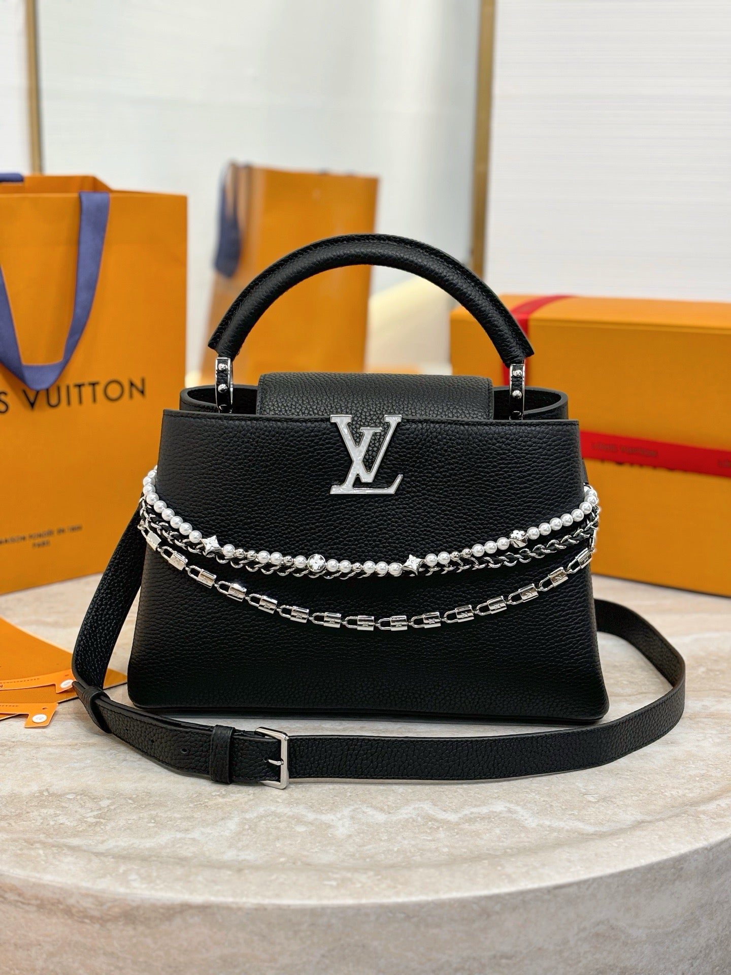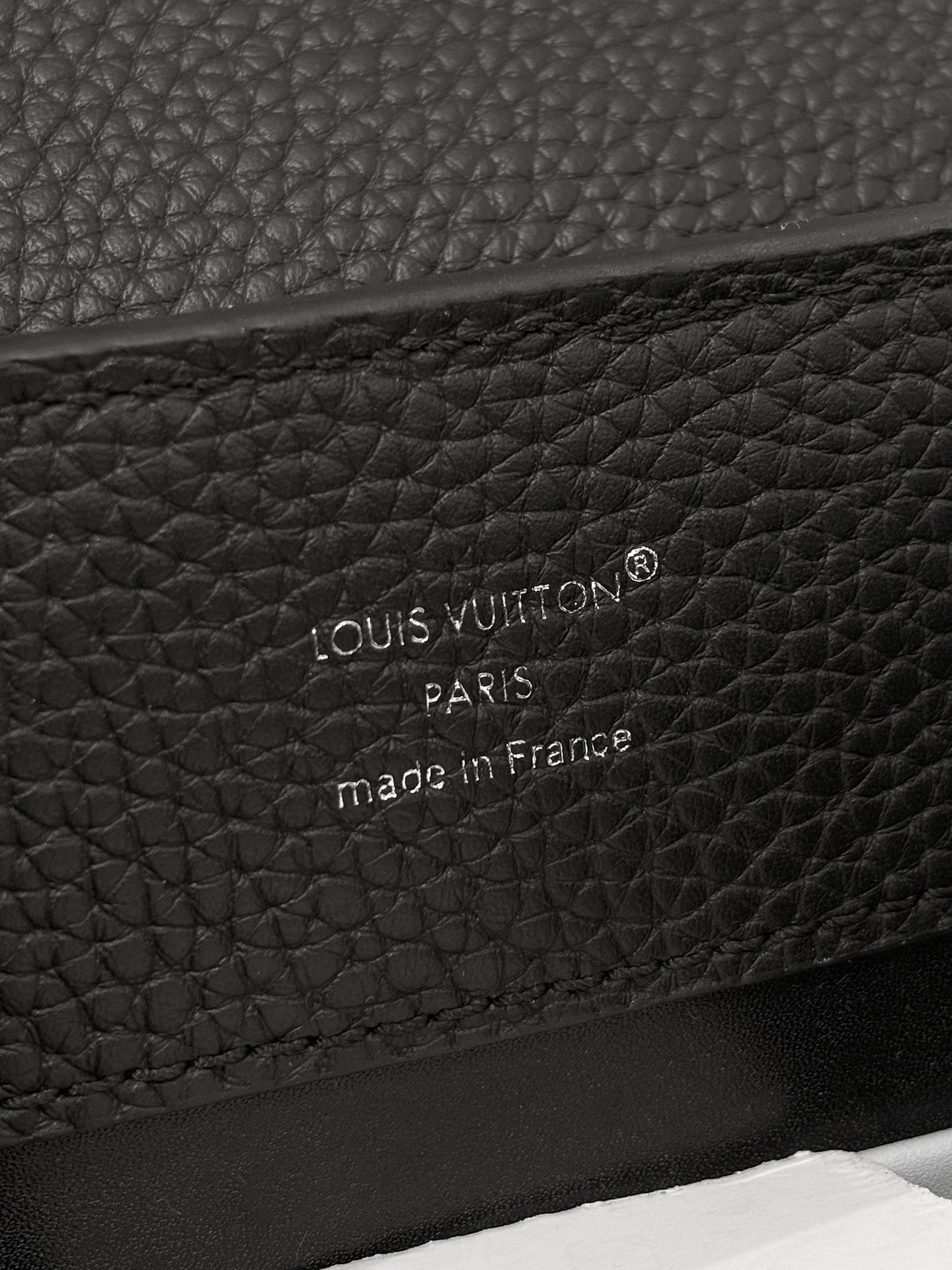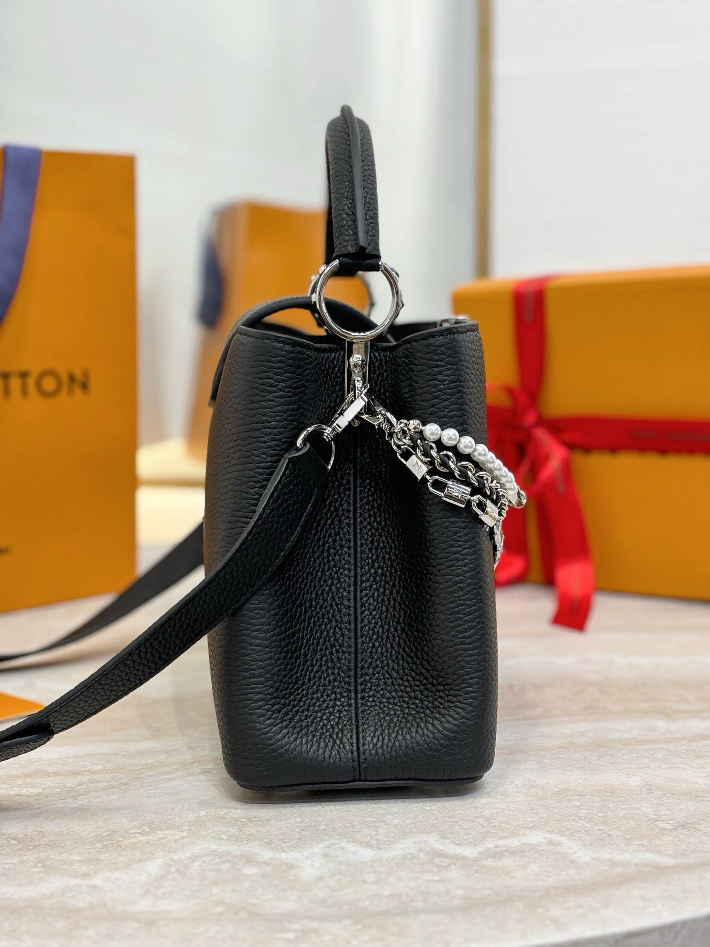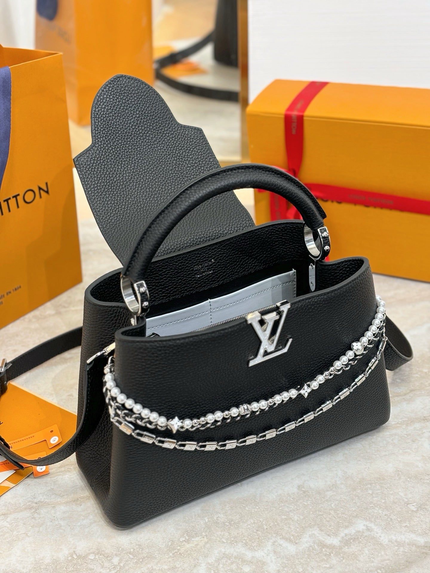 Part of the Trilogy line, this Capucines BB is the epitome of sophistication with its triple chain adornment. Look closely to notice the jewel-like chain details, including signature mini padlocks and enameled Monogram flowers. This double-carry style is crafted from iconic Taurillon leather and is accented with gold-toned hardware. It is fitted with multiple interior pockets and can be worn several ways.