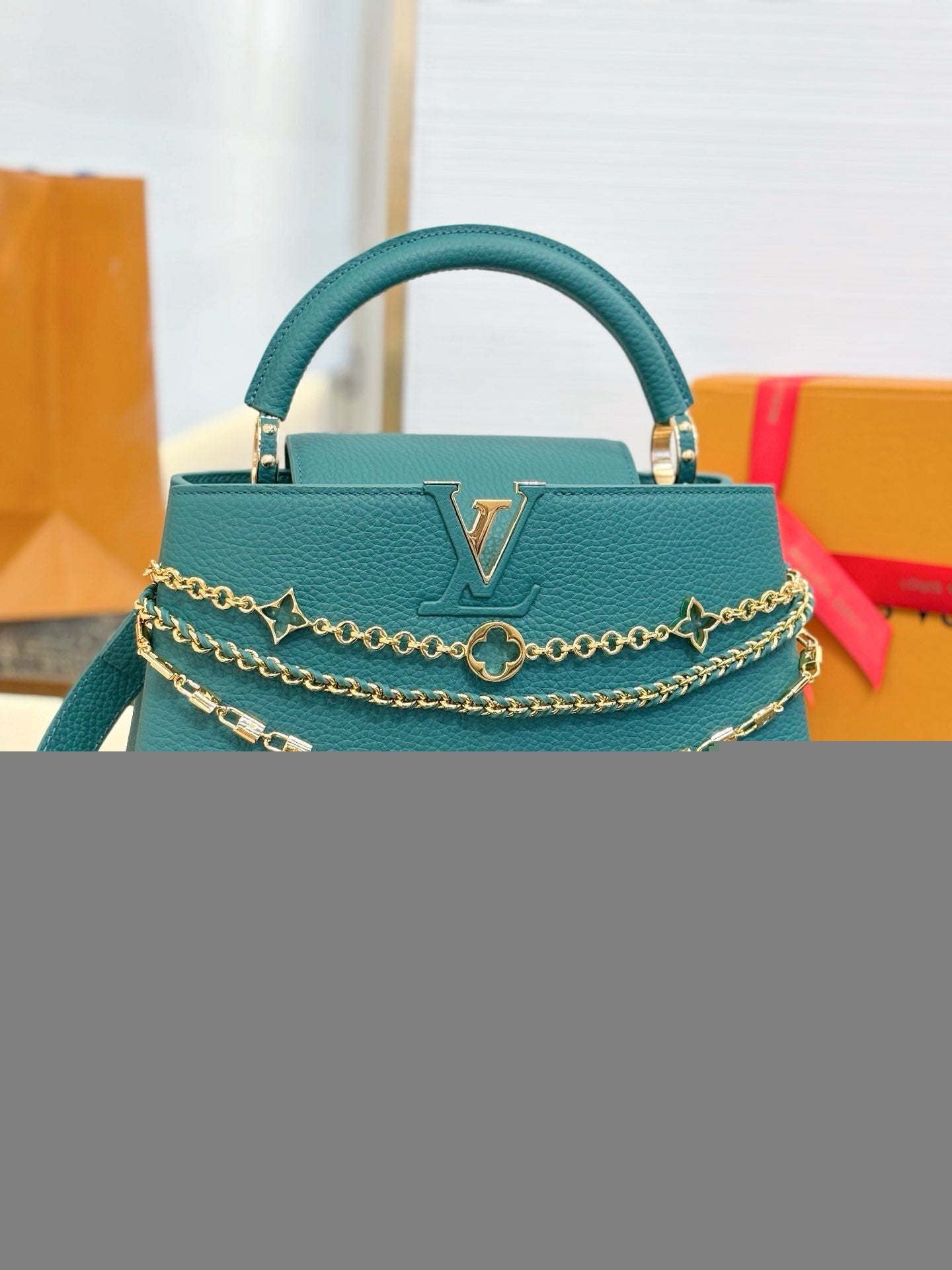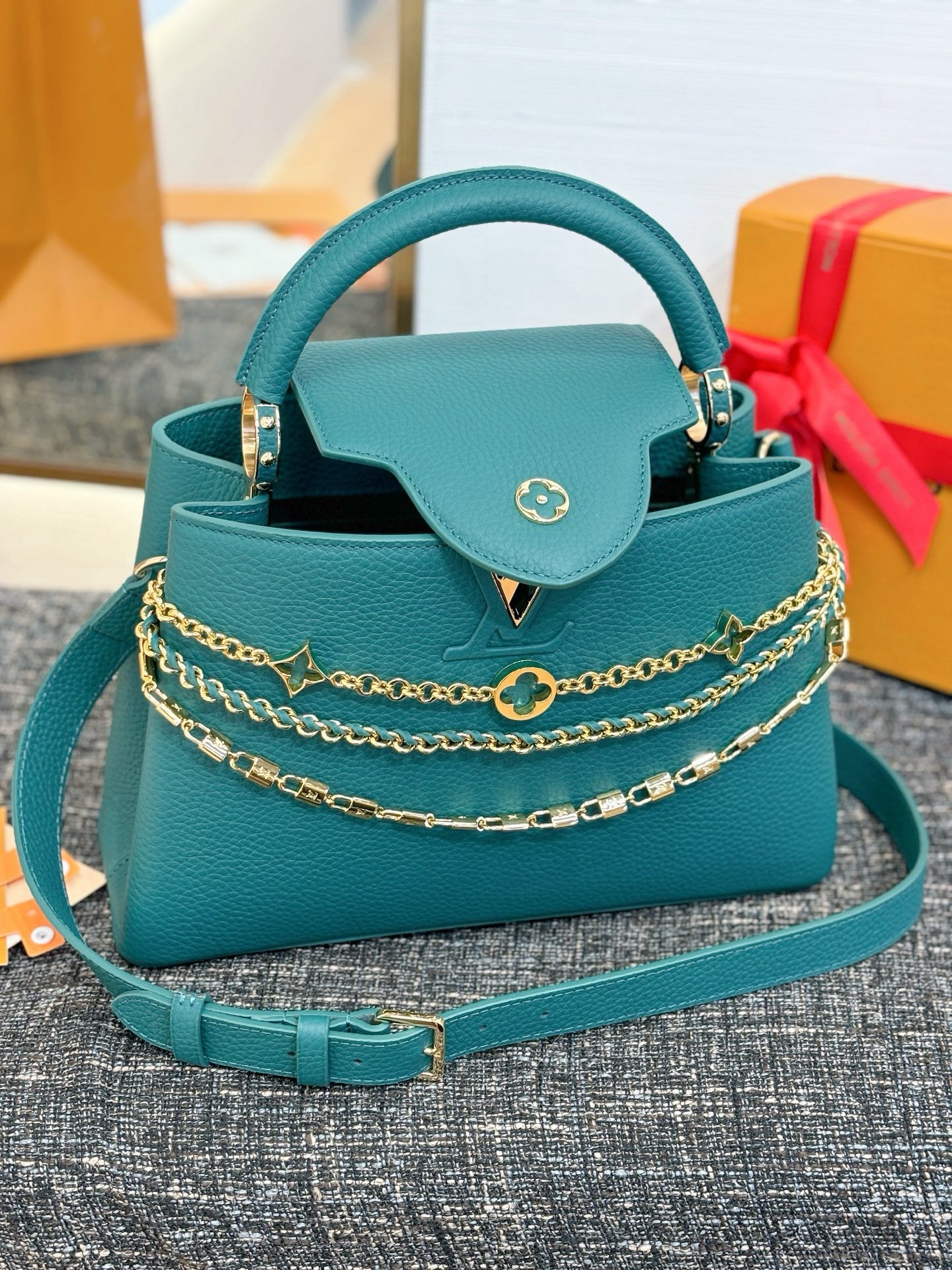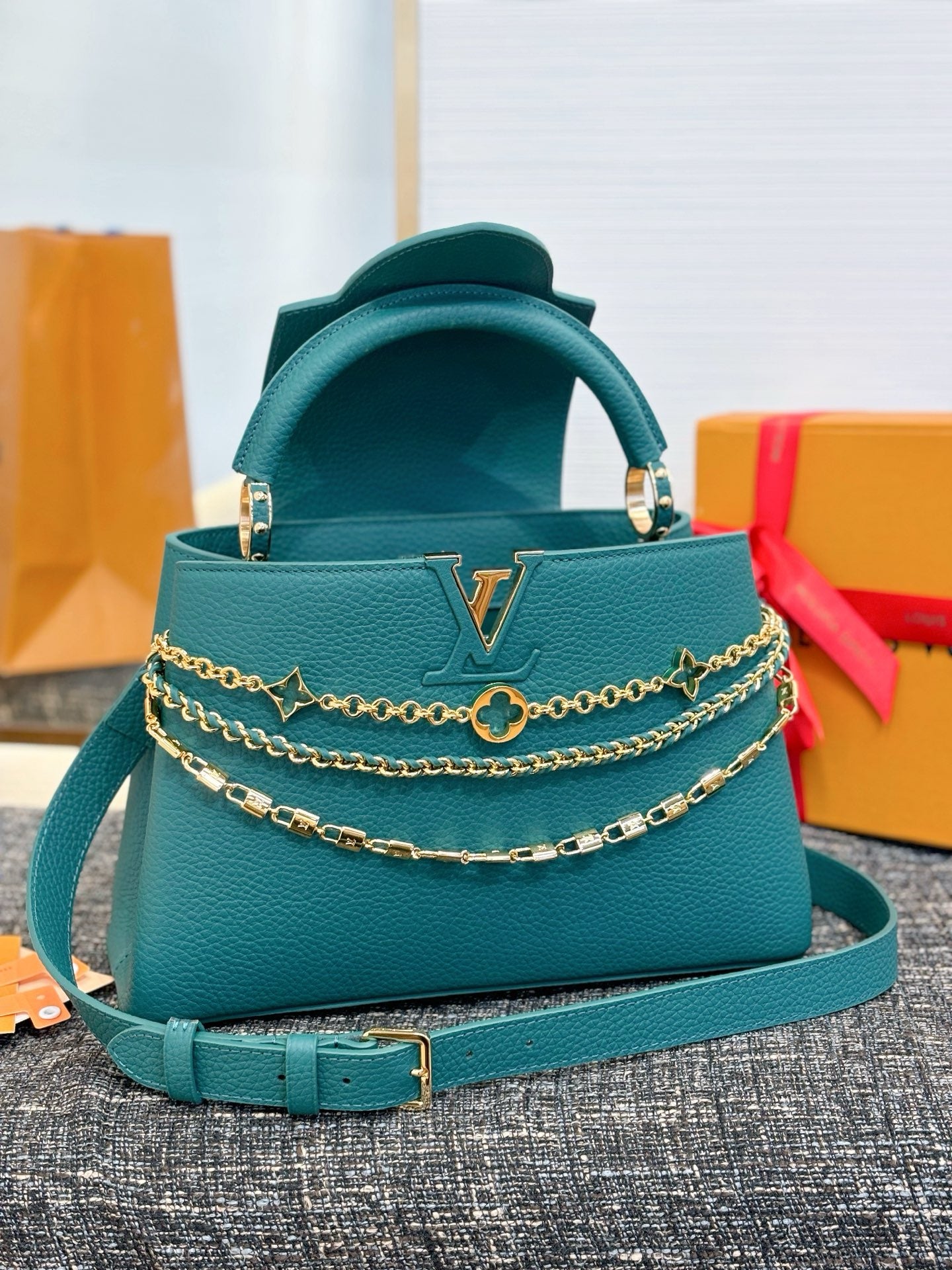 Part of the Trilogy line, this Capucines BB is the epitome of sophistication with its triple chain adornment. Look closely to notice the jewel-like chain details, including signature mini padlocks and enameled Monogram flowers. This double-carry style is crafted from iconic Taurillon leather and is accented with gold-toned hardware. It is fitted with multiple interior pockets and can be worn several ways.