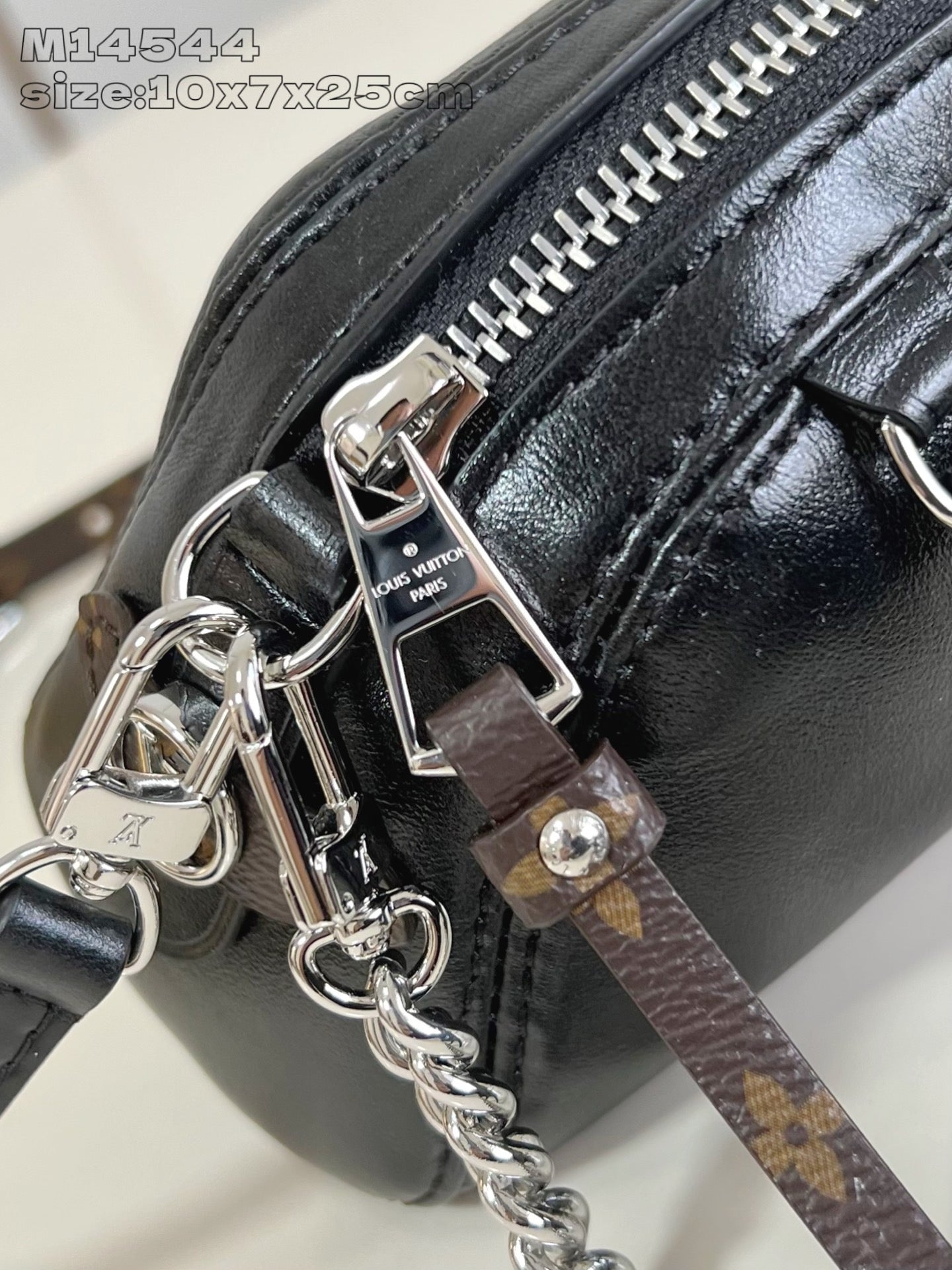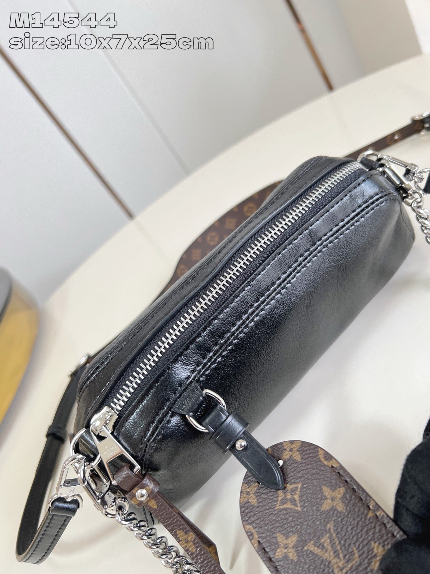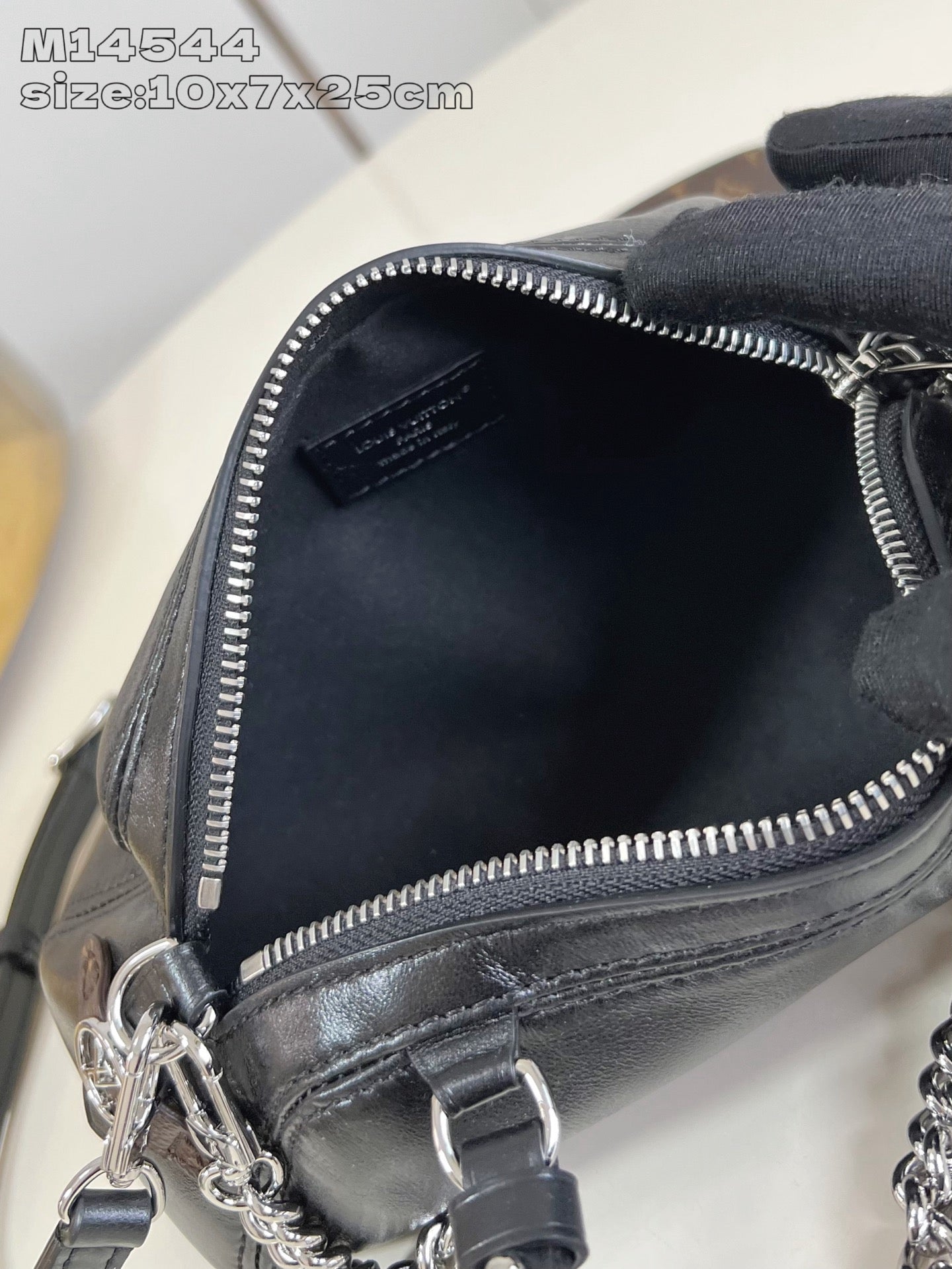 The iconic LV Vibe line introduces this pochette edition, designed as the perfect day-to-evening handbag. Crafted from supple lambskin with a glossy finish, it is adorned with a bold silver-toned chain and signature Monogram details – note the contrasting address tag and LV Circle. The reversible strap is a reinterpretation of the original Carryall LV Vibe, offering versatile styling options.