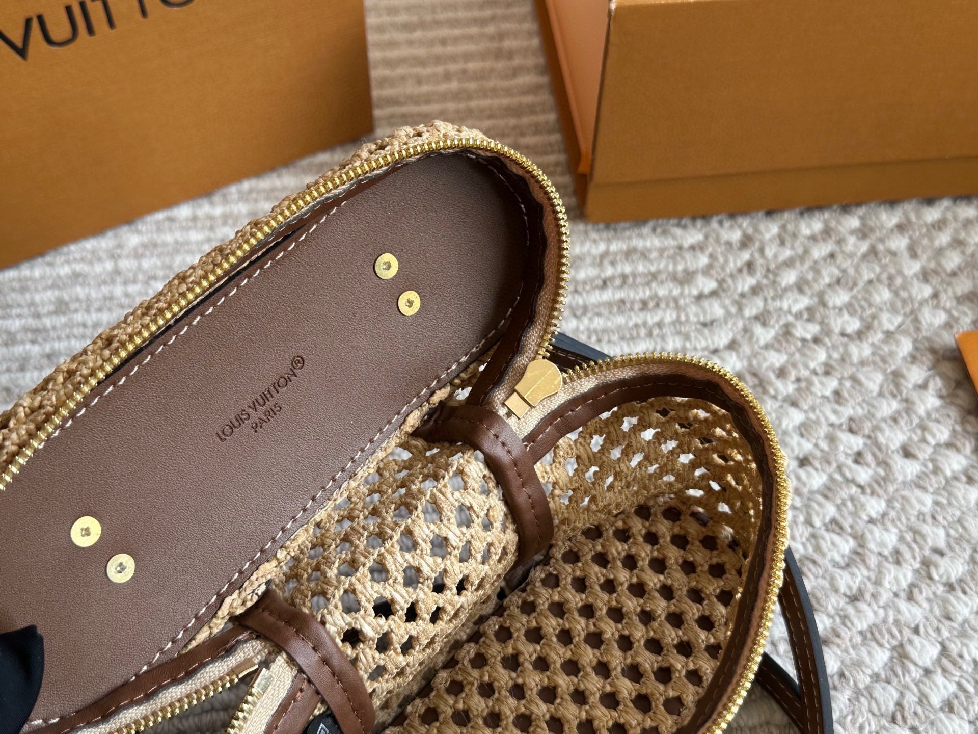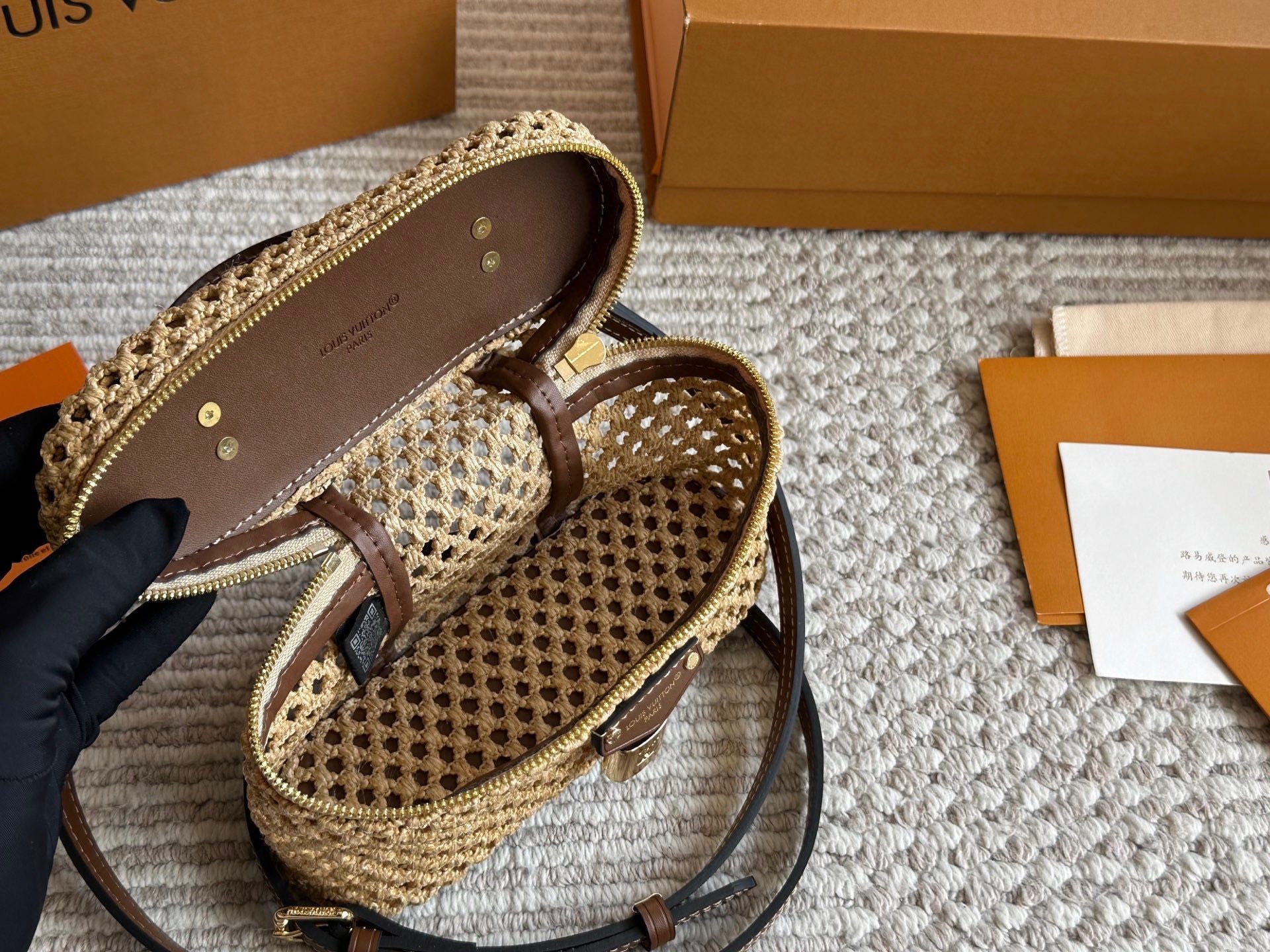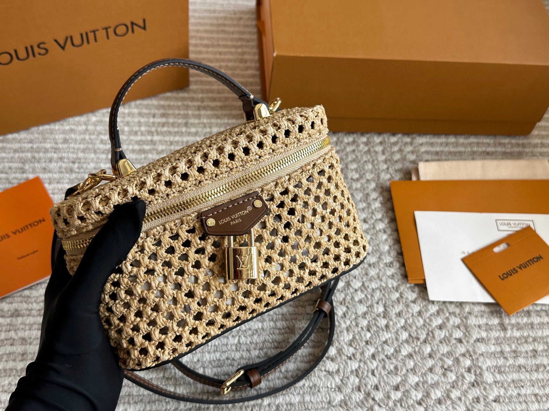 Ideal for alfresco events and vacations, the Vanity Chain pouch is updated as part of the Resort collection in seasonal raffia. Offered in a neutral, versatile colorway, the elegant design is trimmed with contrasting cowhide leather for a refined finish. The gold-toned hardware lends a sophisticated touch and includes a signature LV-engraved padlock.