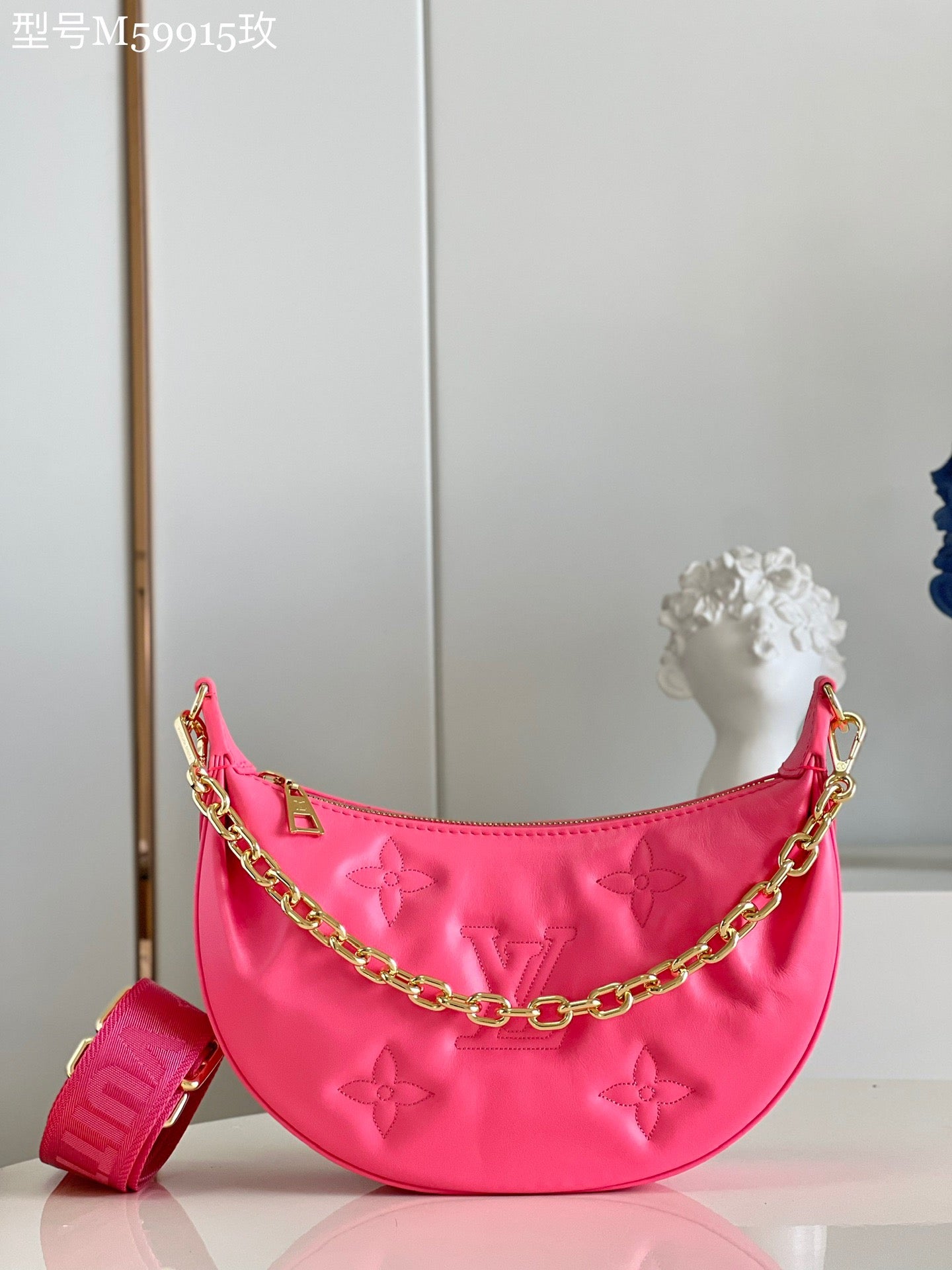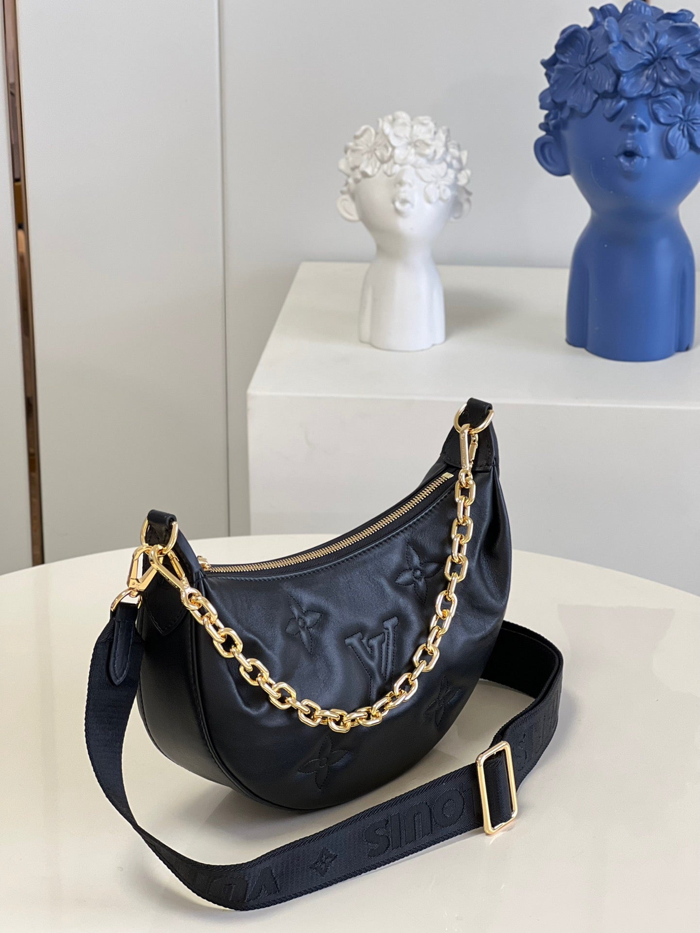 The Over The Moon delights with its versatile shape in quilted calf leather. The embroidered puffy Monogram pattern brings a statutory feel while the adjustable strap and gold-color chain deliver a myriad of carry options: elbow, short shoulder, cross-body, and long shoulder. With the strap removed, it can even be carried as an evening clutch.