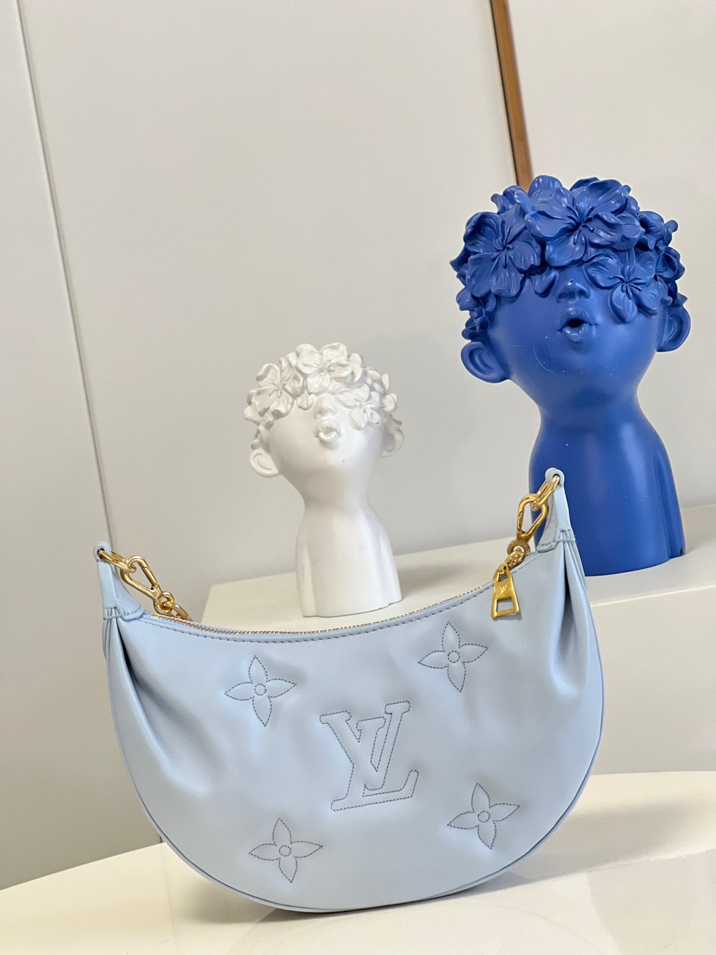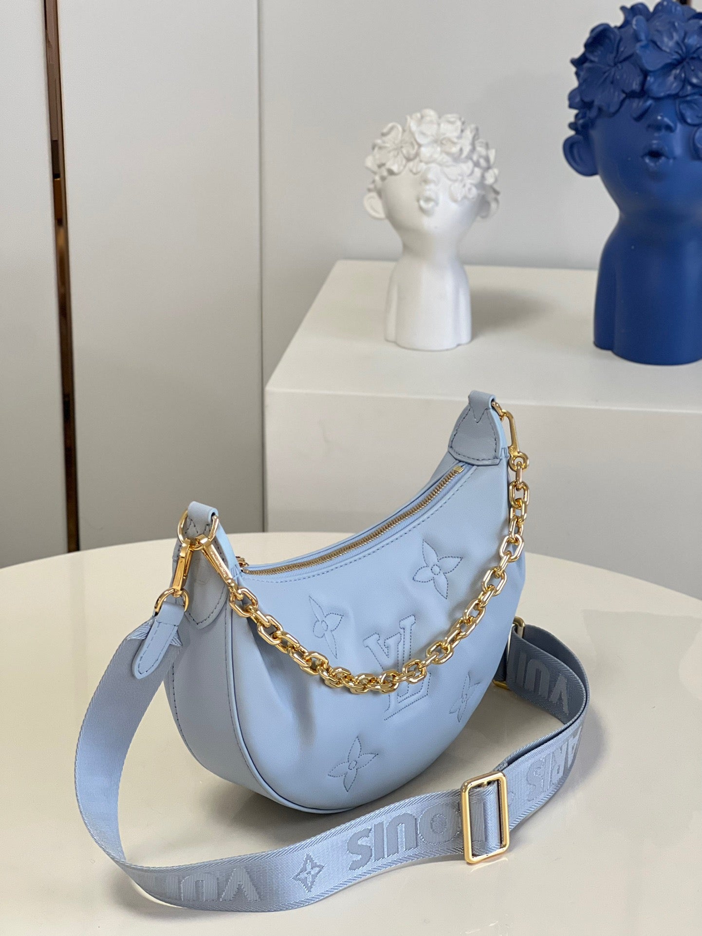 The Over The Moon delights with its versatile shape in quilted calf leather. The embroidered puffy Monogram pattern brings a statutory feel while the adjustable strap and gold-color chain deliver a myriad of carry options: elbow, short shoulder, cross-body, and long shoulder. With the strap removed, it can even be carried as an evening clutch.