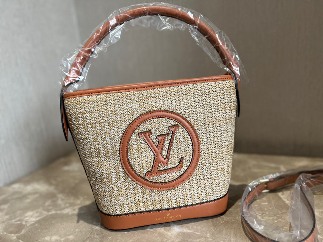 As fresh as a Spring breeze, the Petit Bucket bag is crafted from knitted raffia enriched with elegant leather detailing. The bag features the iconic LB logo patch, while the leather bottom is stamped with the Maison’s golden signature. Easy to wear, with room for one’s daily essentials, this feminine piece goes easily from city to beach.