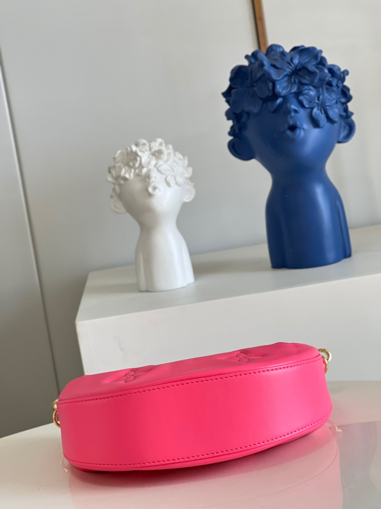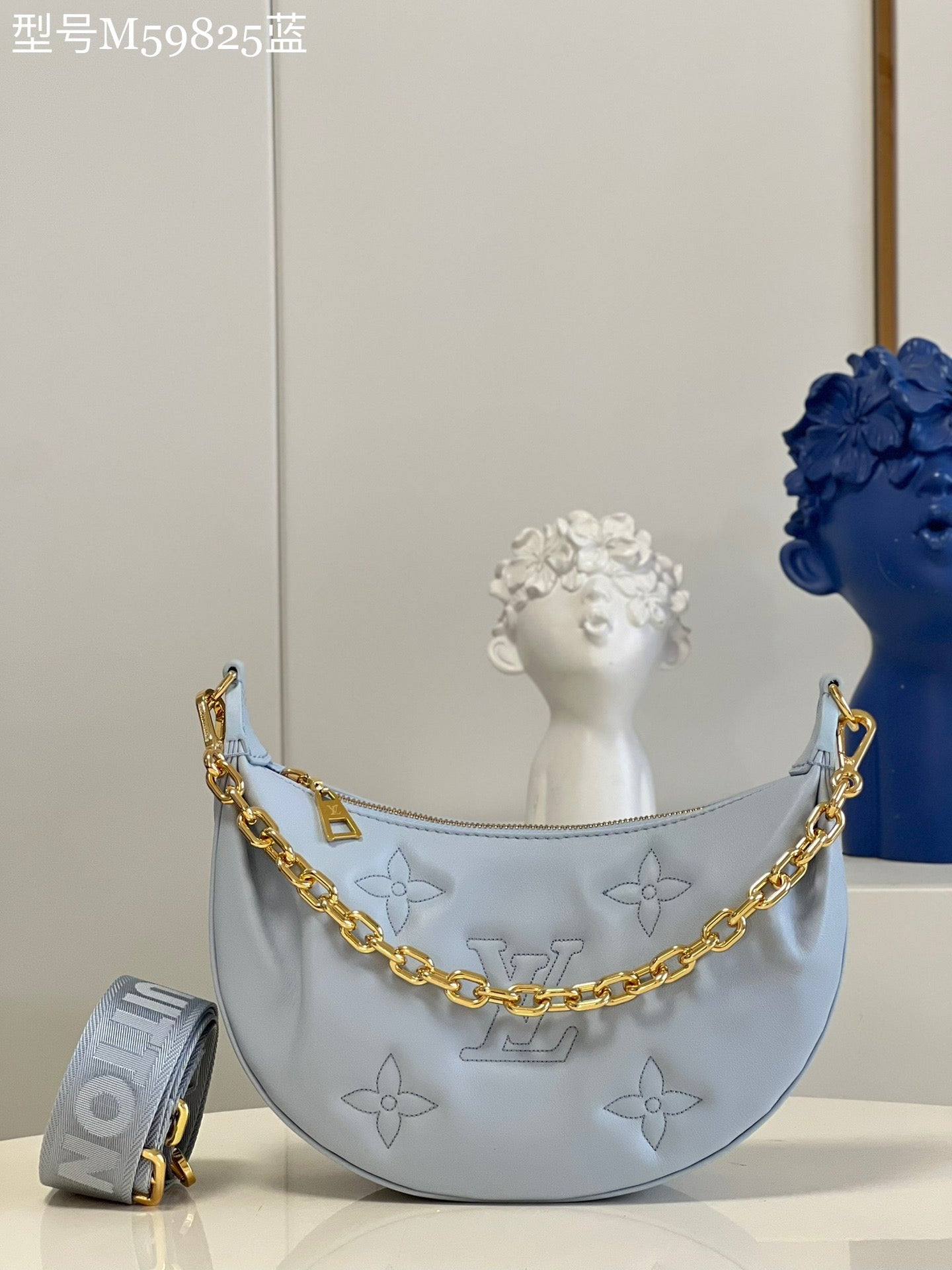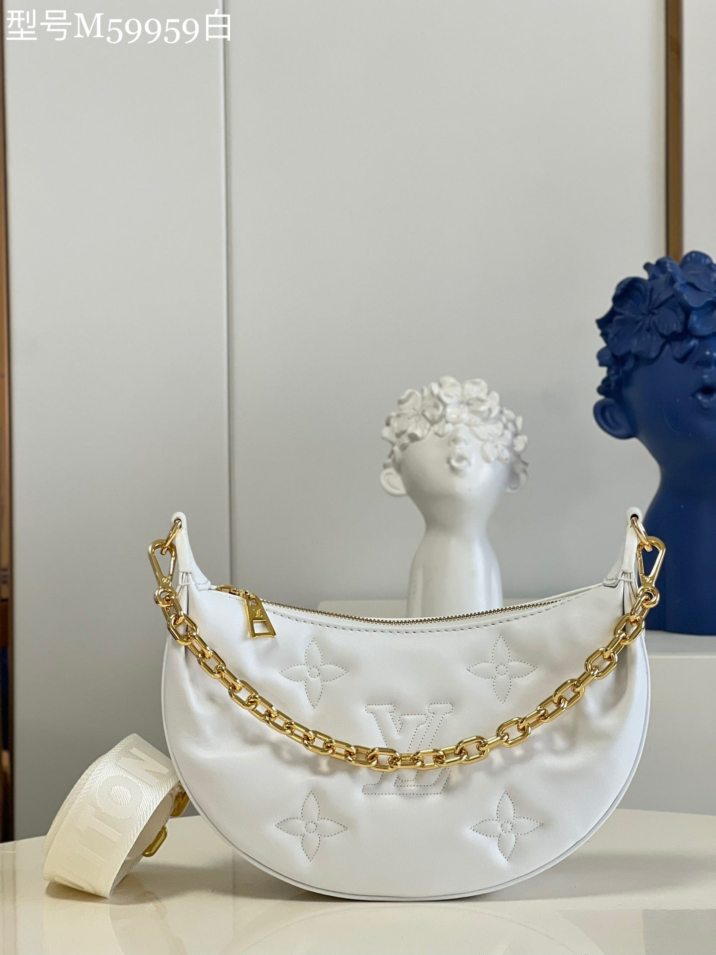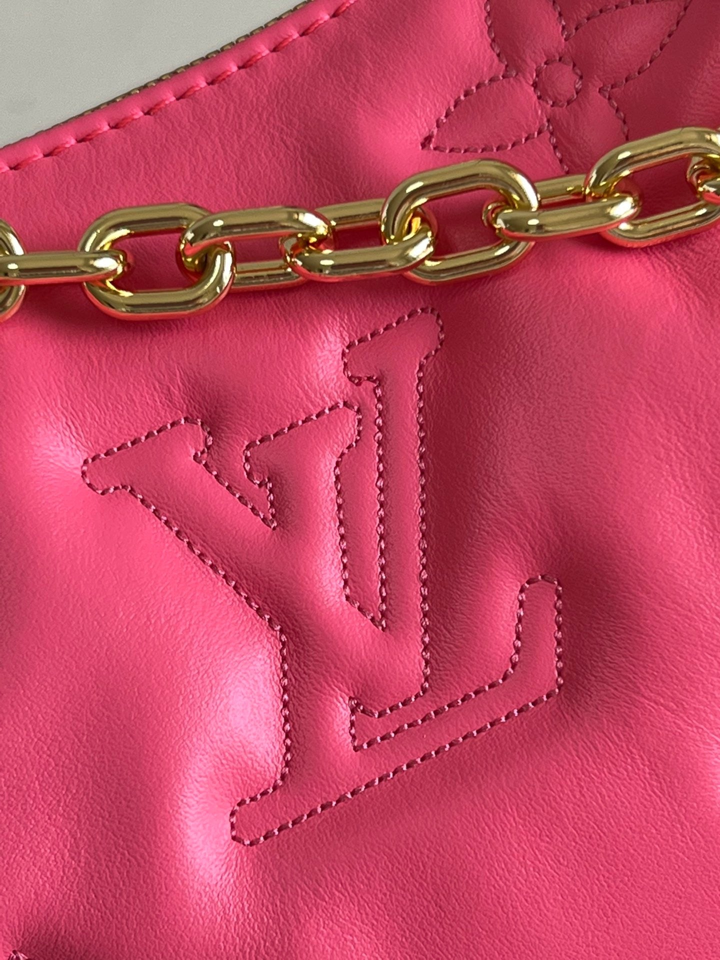 The Over The Moon delights with its versatile shape in quilted calf leather. The embroidered puffy Monogram pattern brings a statutory feel while the adjustable strap and gold-color chain deliver a myriad of carry options: elbow, short shoulder, cross-body, and long shoulder. With the strap removed, it can even be carried as an evening clutch.