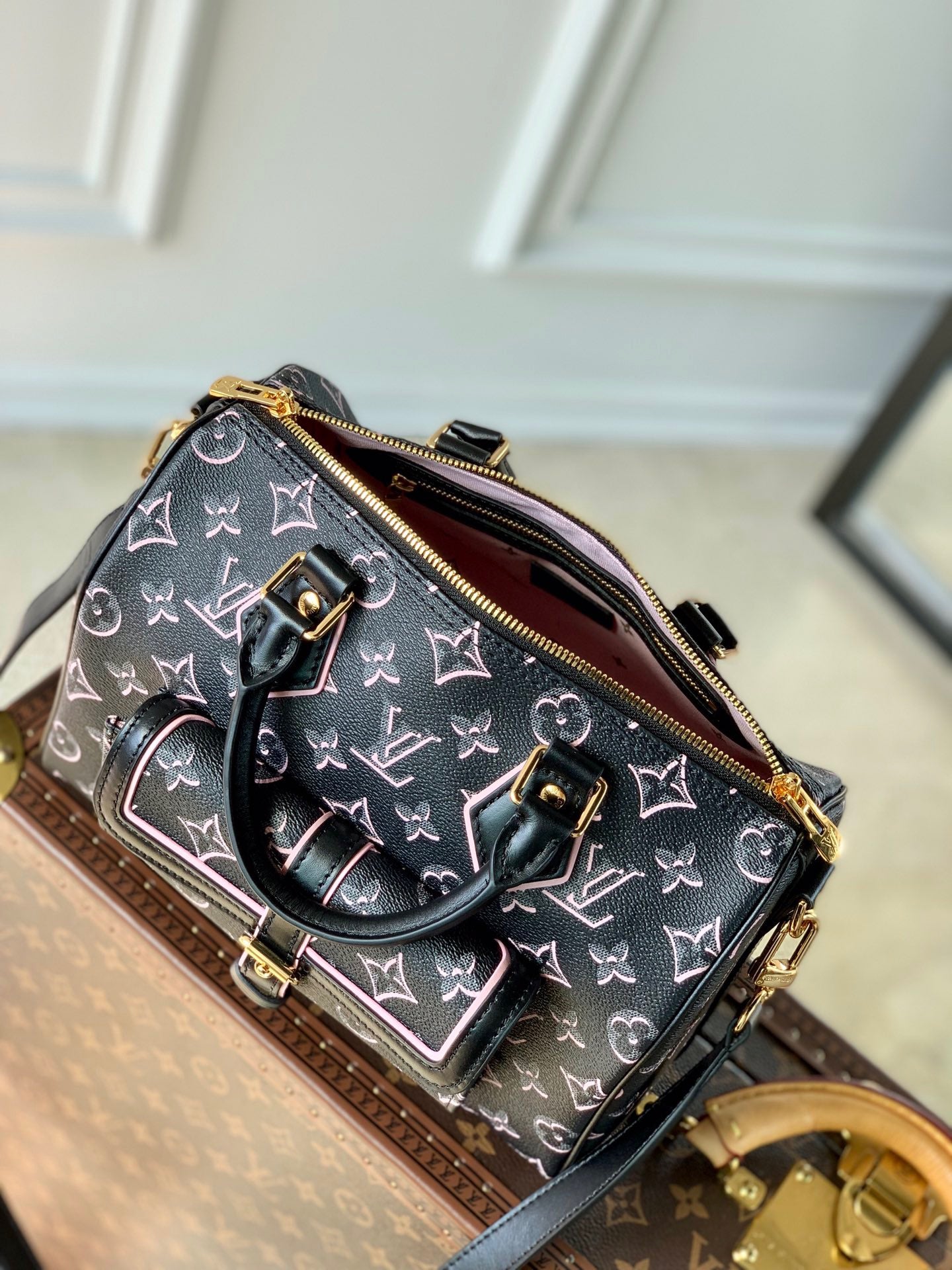 The compact Speedy Bandoulière 25 handbag reinvents its elegant silhouette with an outside pocket and gold-color buckle. The miniature Monogram pattern on the canvas and the leather trim evoke the House’s historic design codes, as do the rolled-leather handles and engraved padlock. An adjustable and removable strap enables shoulder and cross-body carry.