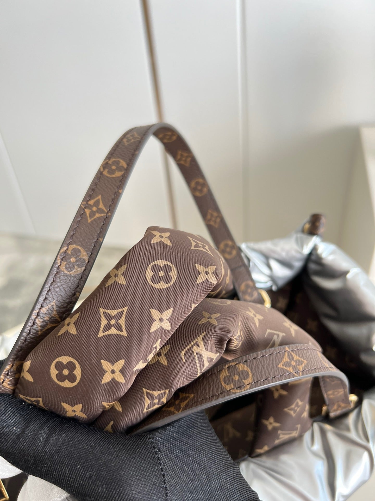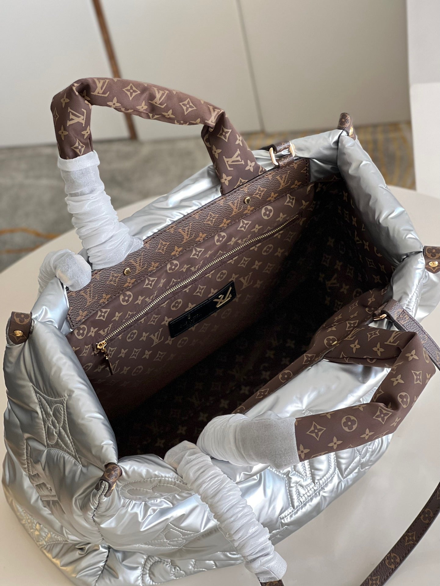 A sporty-chic tote with room for all the essentials: the LV Pillow OnTheGo GM is a stand-out piece for the winter season. Eco-designed using recycled and sustainable materials, it is made from silvery padded nylon, embroidered with Monogram motifs. With padded top handles and two long canvas straps, the bag is easy to wear and comfortable to carry.