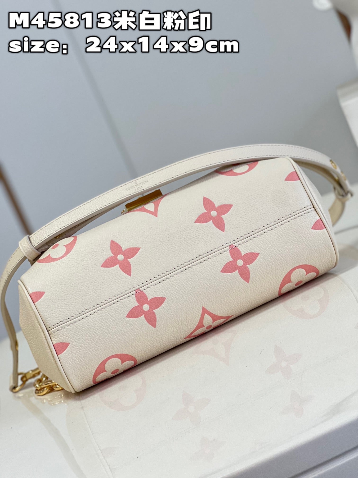 The Favorite is a fashionable baguette shoudler bag made from supple grained leather with an oversized embossed Monogram pattern. Feminine pleats bring a couture touch while the gold-color magnetic lock evokes Louis Vuitton’s heritage. A removable and adjustable strap enables short-shoulder carry or cross-body wear while a blod detachable gold-color chain allows more glamorous evening use.