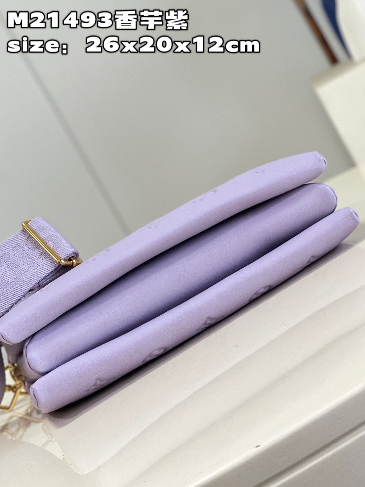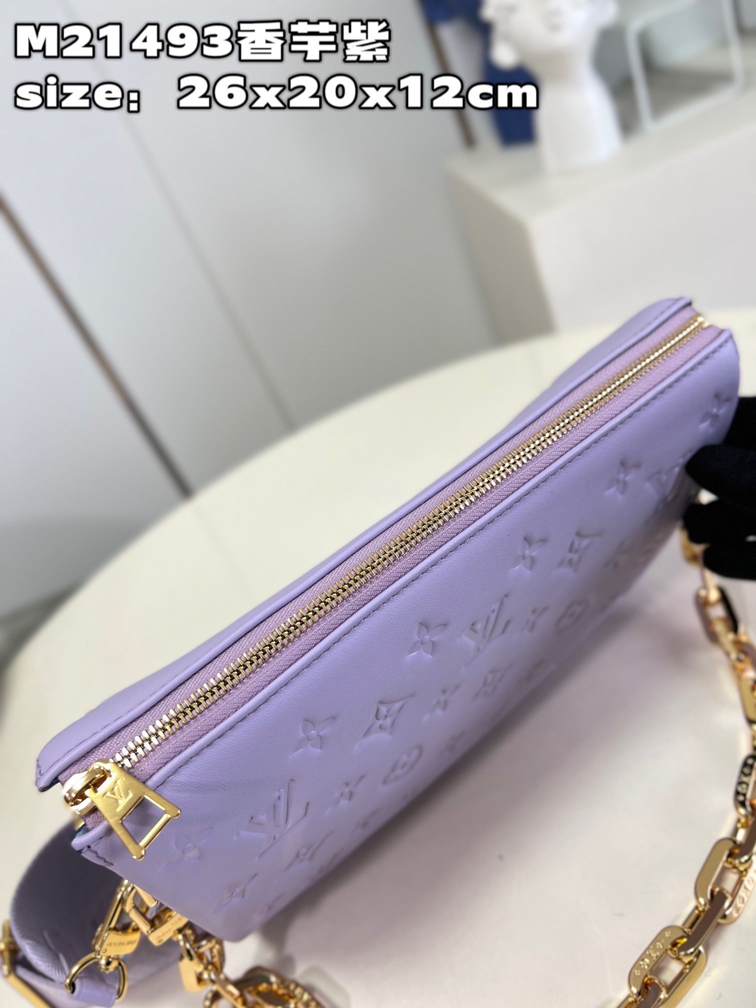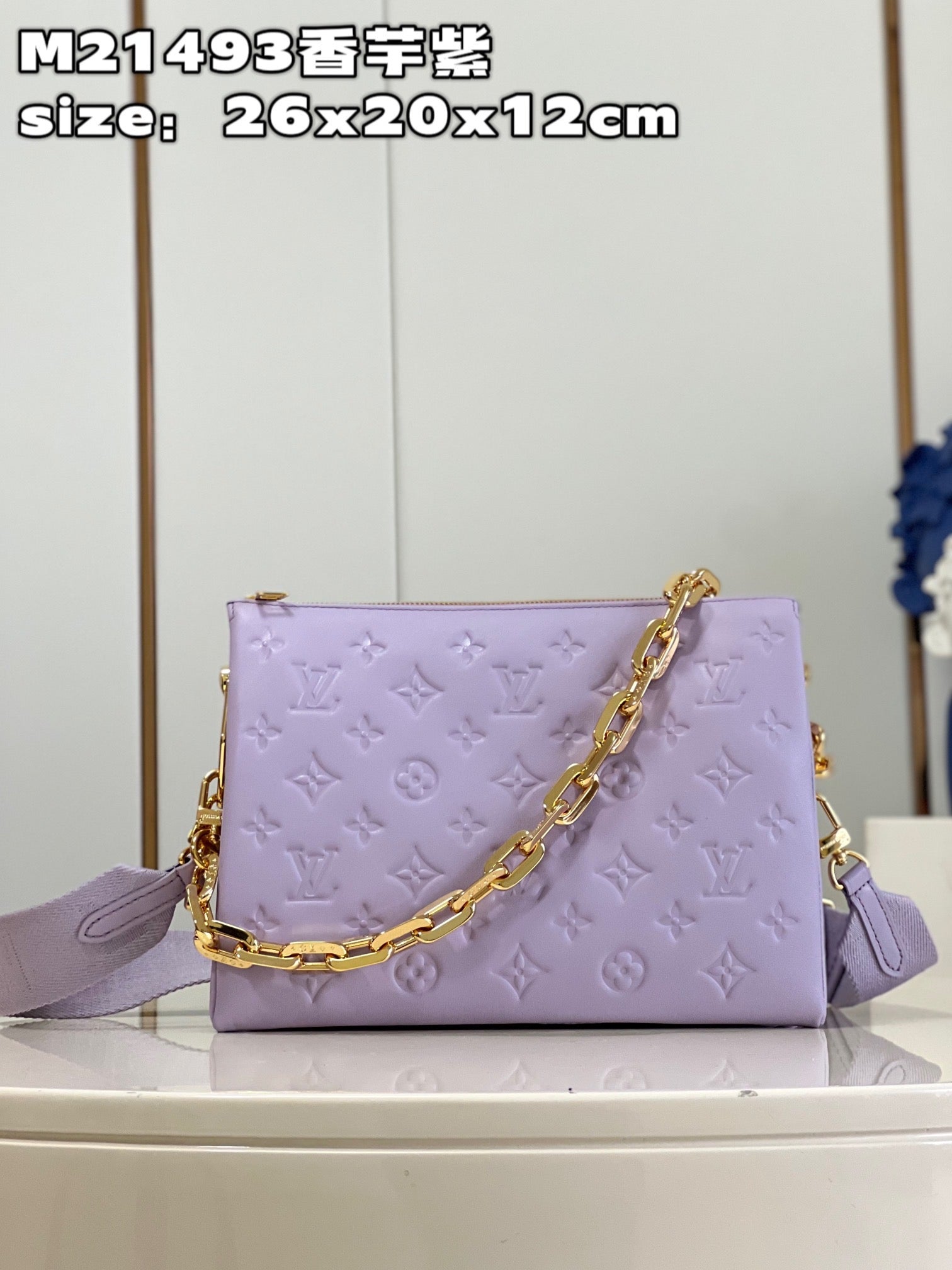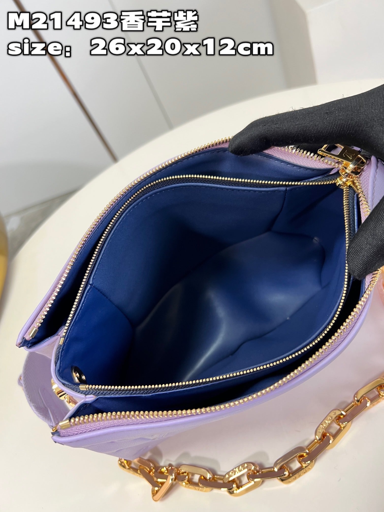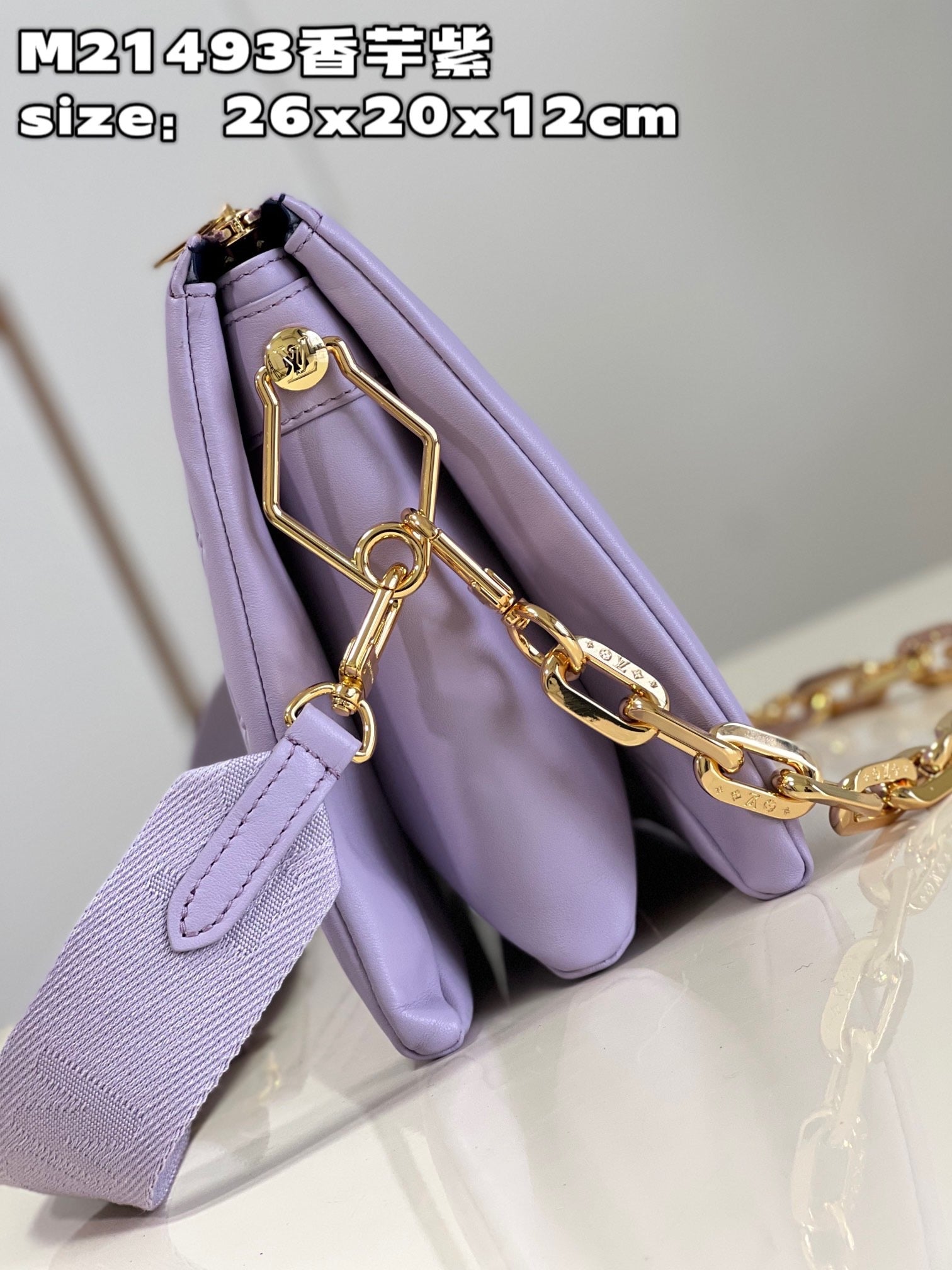 The Coussin PM handbag is made from puffy lambskin with the Monogram motif embossed into the leather. Inside the bag, there are two compartments separated by a zipped pocket. Its chunky gold-color chain and wide textile strap – both detachable – enable multiple carry options.