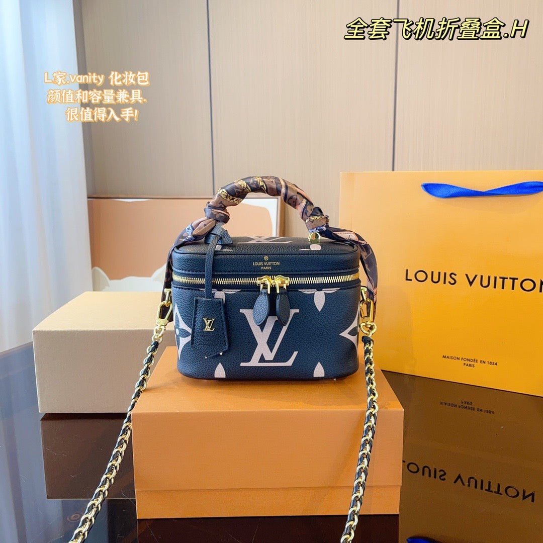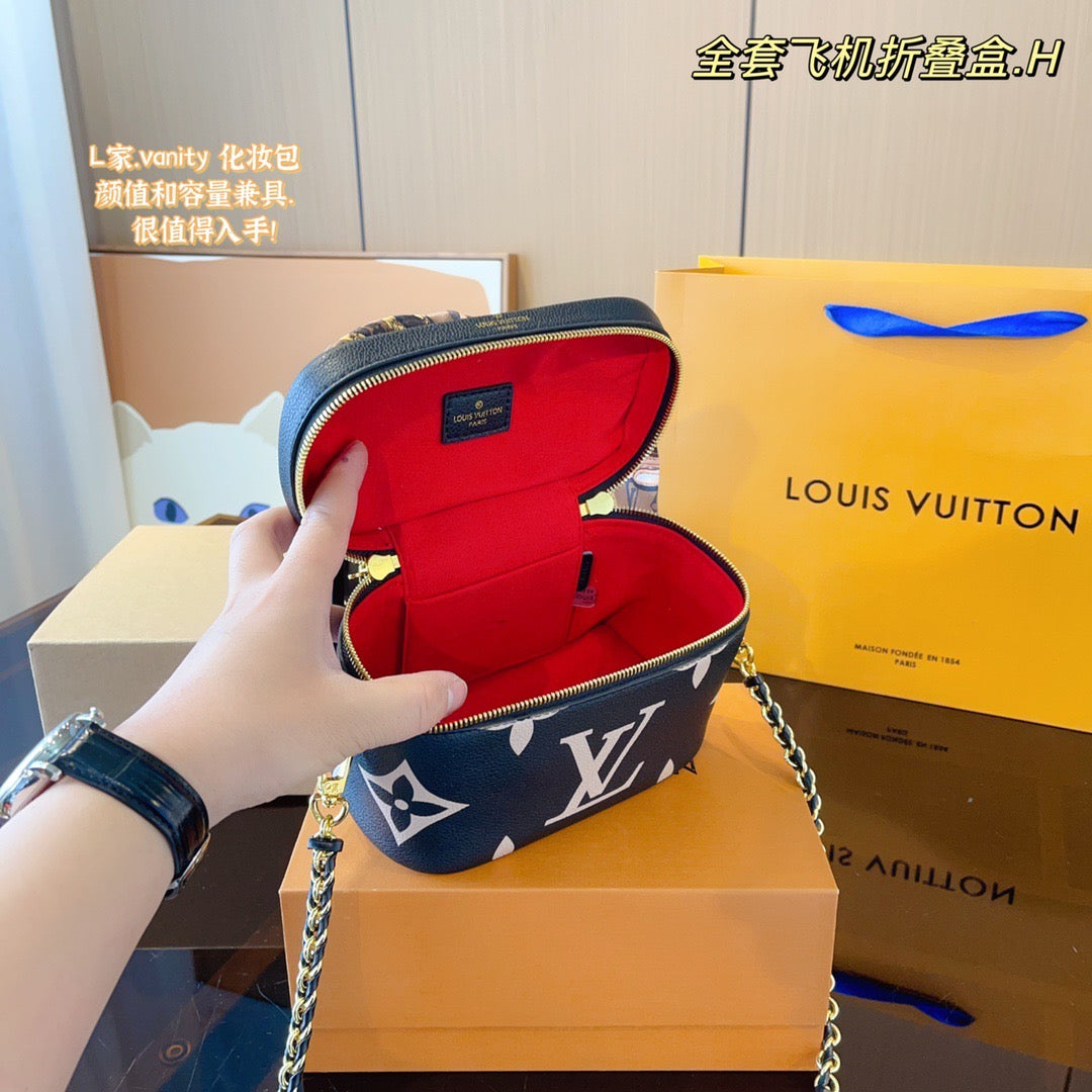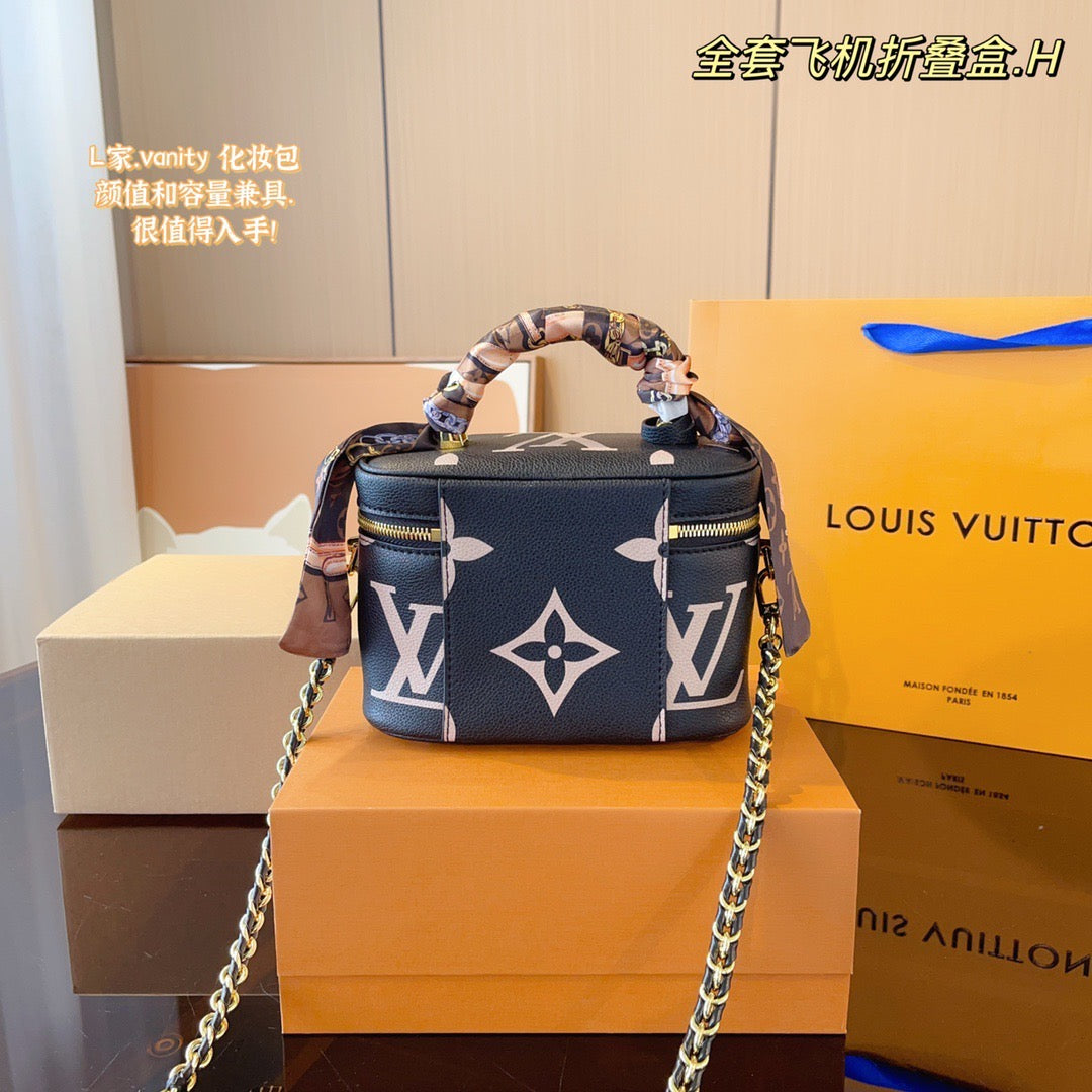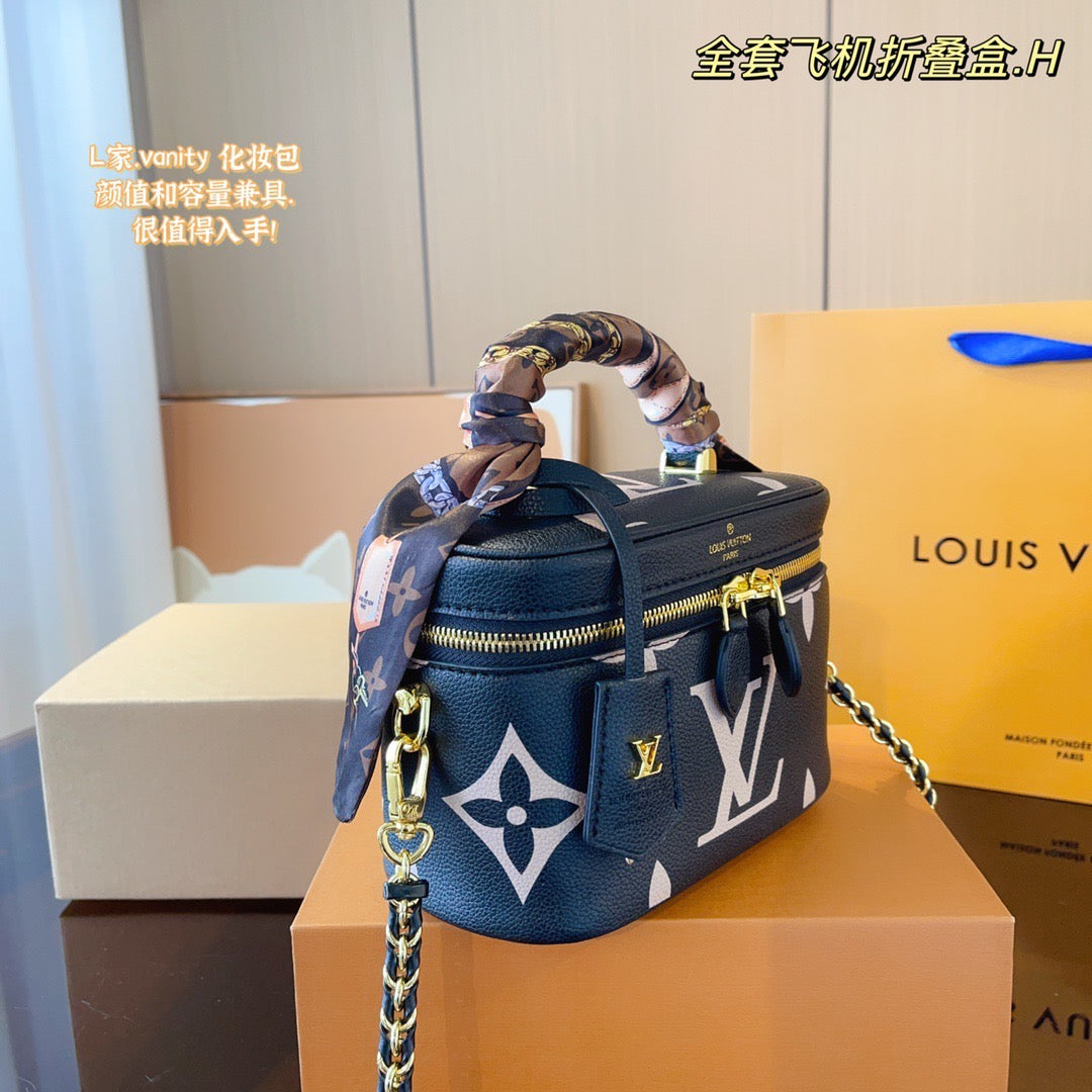 With its elegantly modern shape, leather top handle, and subtle embossed Giant Monogram pattern, the Vanity PM handbag is the perfect day-to-evening bag. It features two leather-tassel zip pulls for easy opening and a padlock for secure closure. The adjustable and removable leather strap is adorned with a small chain, interwoven with the leather.