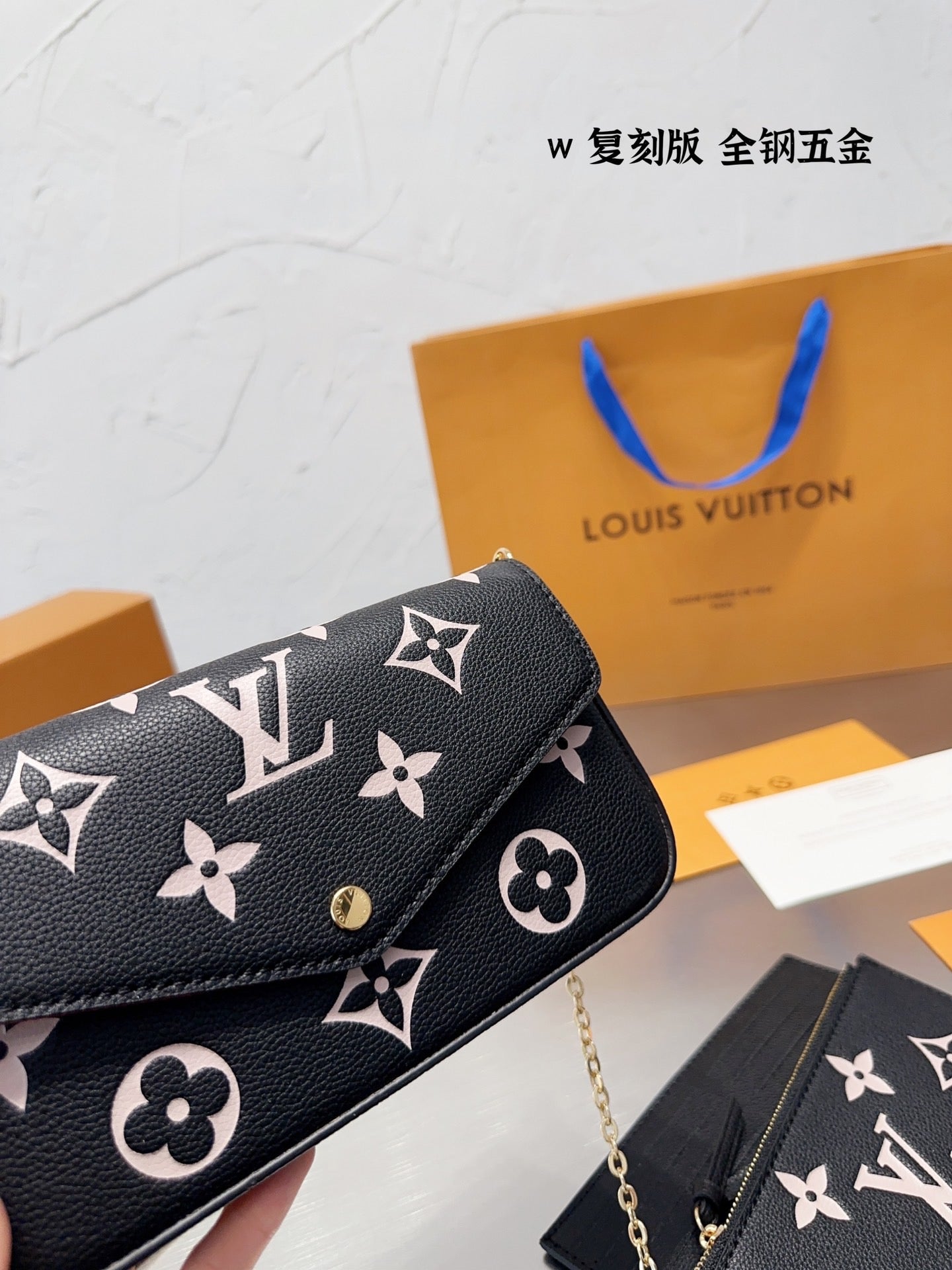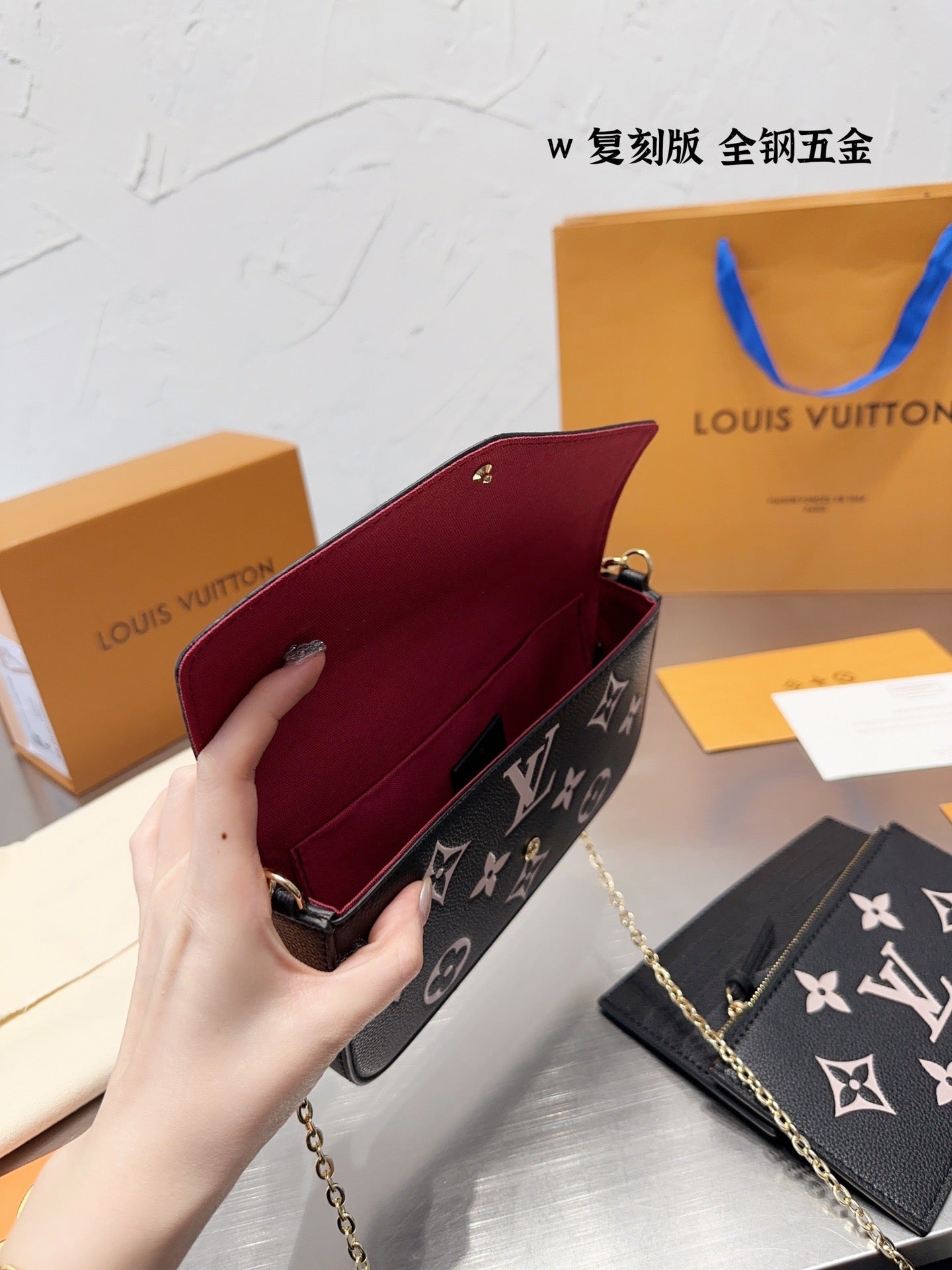 The Félicie Pochette is crafted from supple Monogram Empreinte leather, embossed with Louis Vuitton's iconic Monogram pattern. The bicolor palette brings added refinement to this elegant and versatile design, which features a removable, gold-tone chain, enabling it to be carried on the shoulder or as a clutch, as well as two removable pockets.
