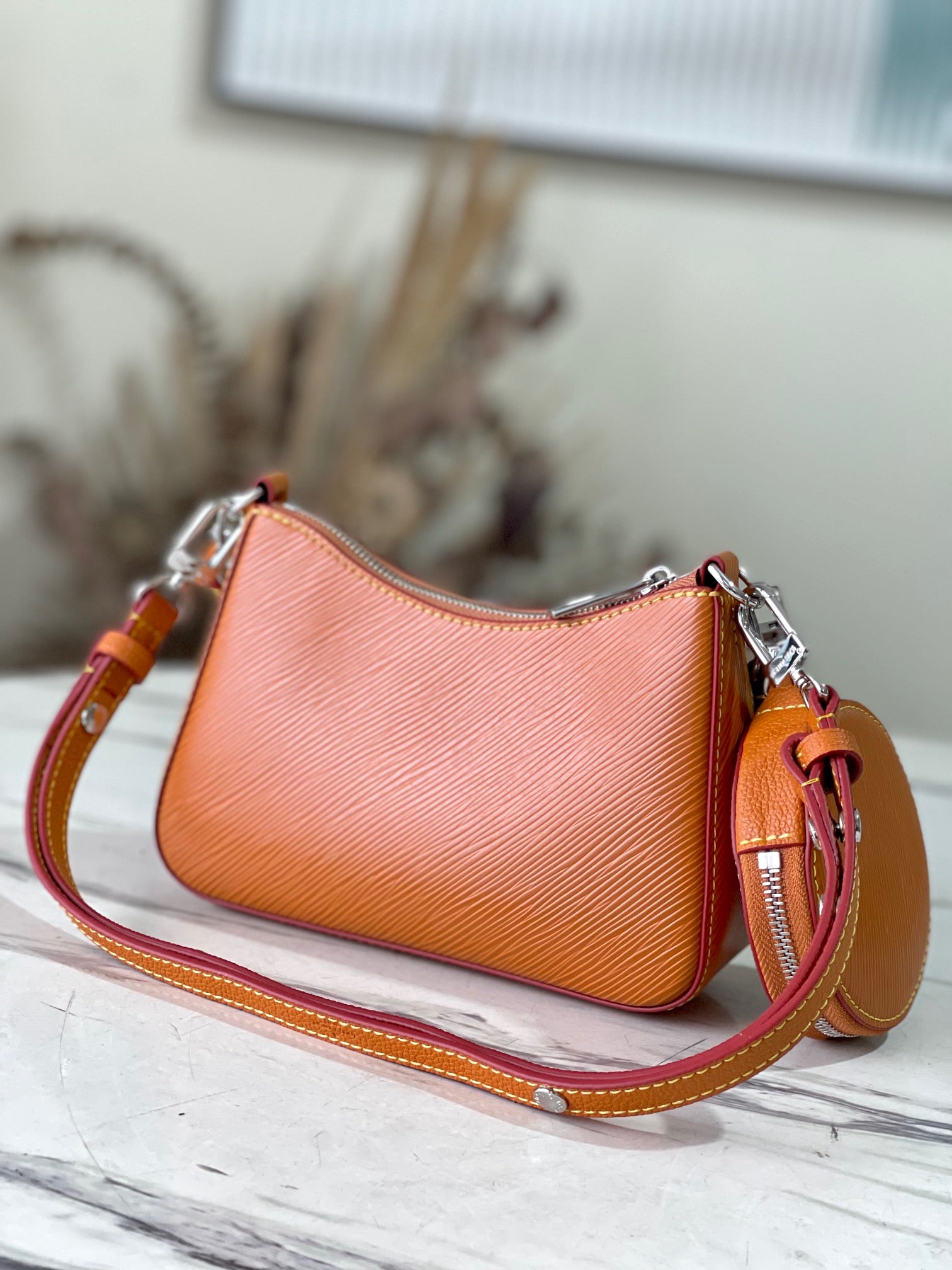 The Marellini handbag shares the sporty-chic signatures of the larger Marelle model, but in a charming mini format. Fashioned from the Maison’s classic Epi leather, this playful and versatile piece features a detachable round coin purse; a small mirror fits into the front pocket, hooked to the bag by a stylish silver-finish chain.
