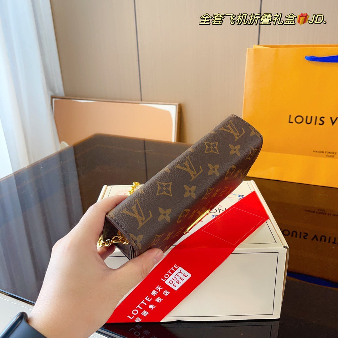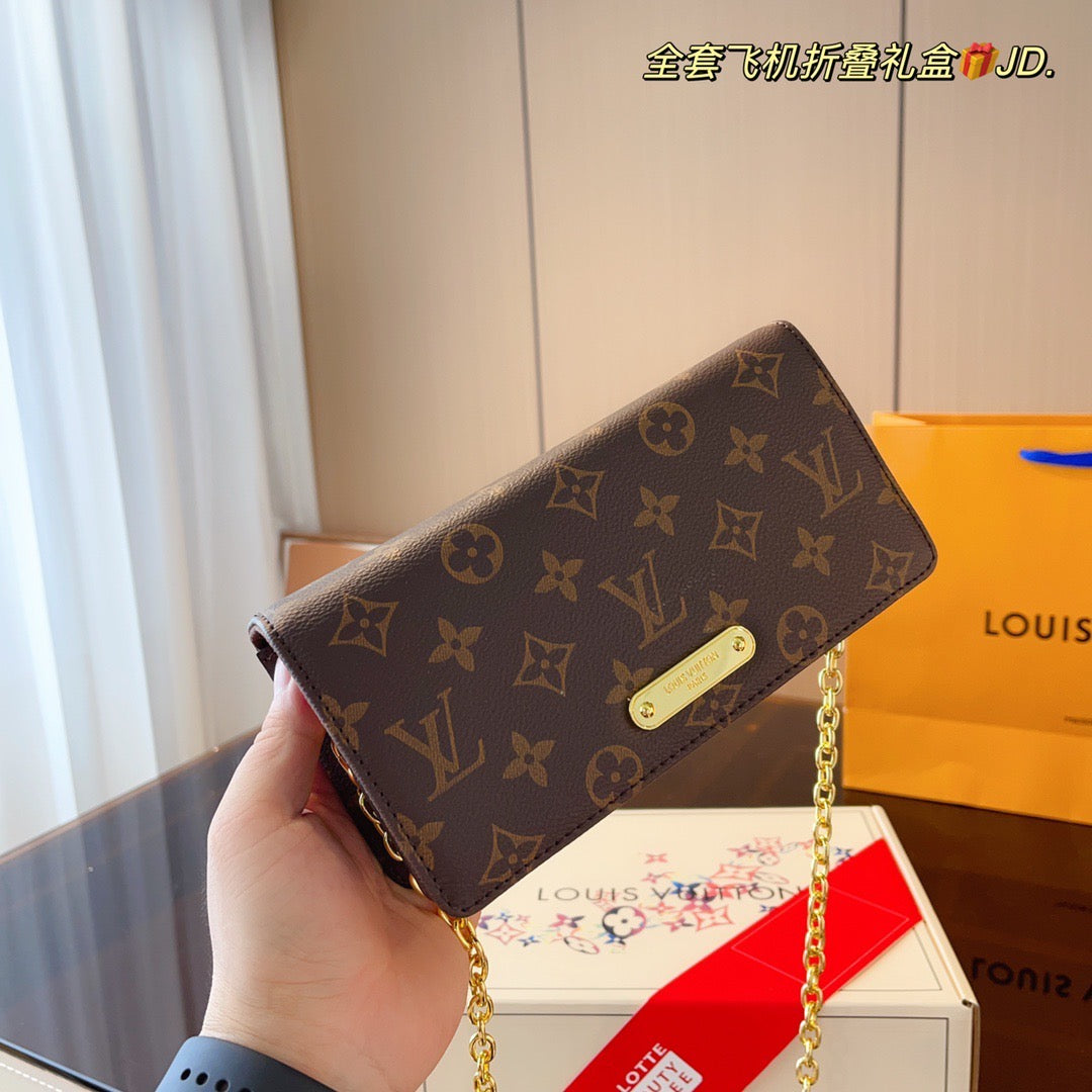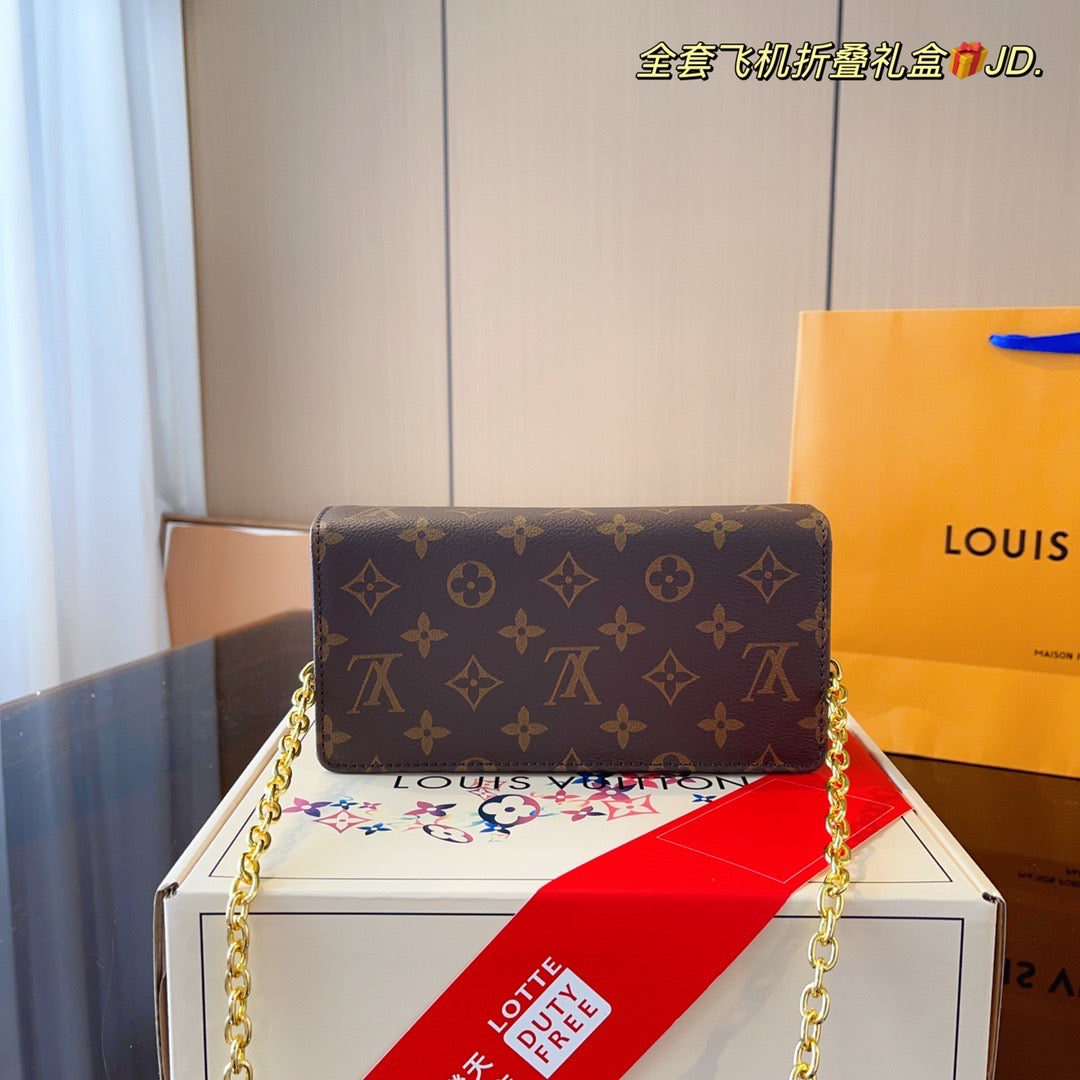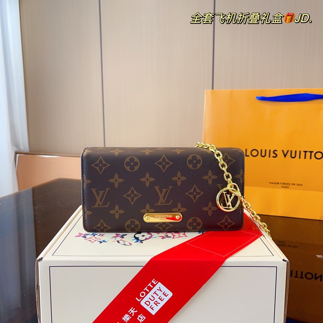 The Lily wallet on chain in Monogram canvas combines a sleek rectangular shape with a subtle retro look. Its flap features a gold-tone plate embellished with rivets and engraved with the Louis Vuitton signature. Large enough to carry essentials from day to evening, it offers different carry options thanks to its removable, adjustable chain with an LV Circle charm.