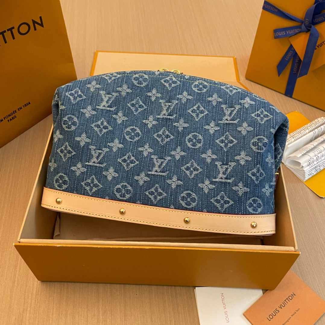 The Monogram Denim look gives the Pochette Cosmétique makeup pouch a cool aura of casual chic. Certified organic cotton canvas the color of stylishly faded blue jeans is enhanced with natural cowhide trim and gleaming gold-tone rivets. And it’s a handy travel companion, with plenty of room for storing makeup and small personal items.