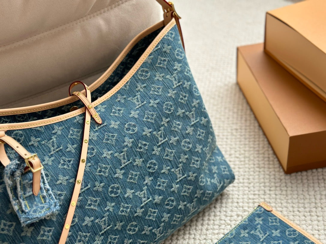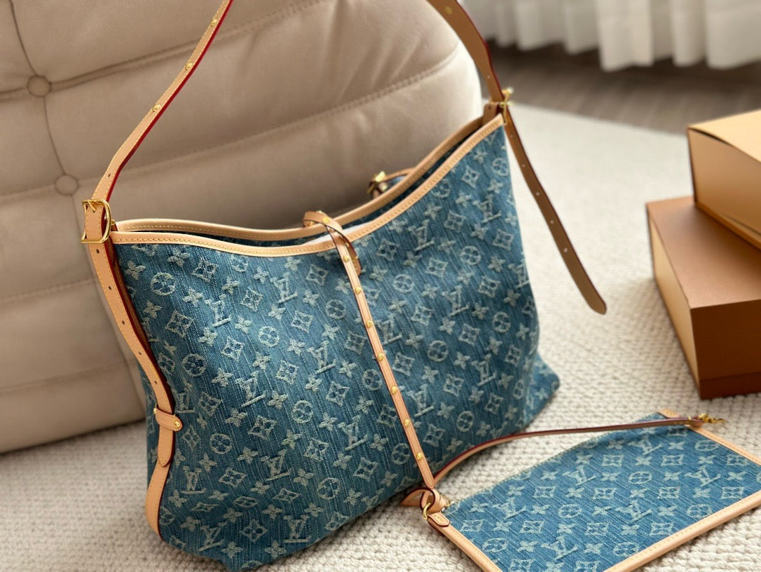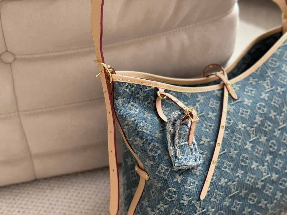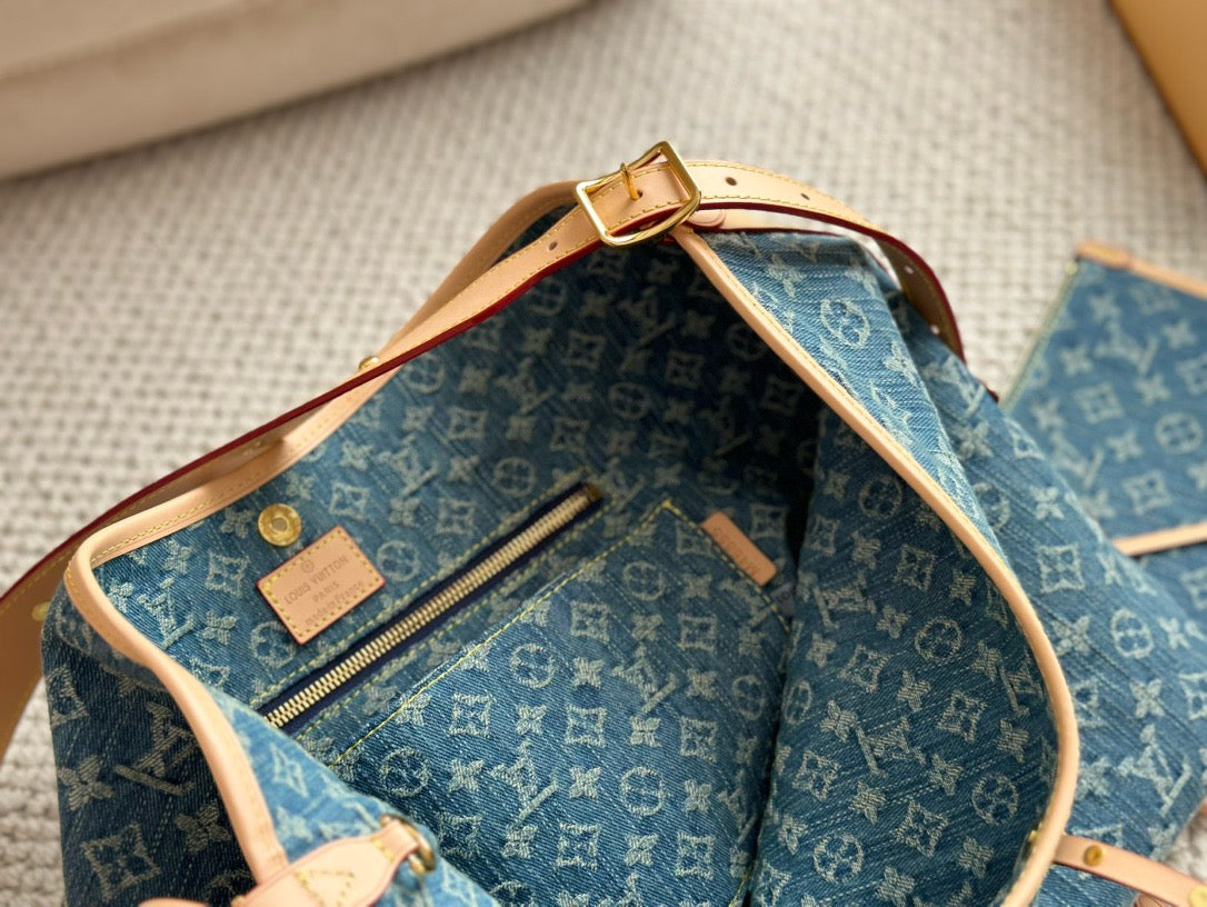 The roomy Carryall MM bag in Monogram Denim canvas with natural cowhide-leather trim combines style with functionality. The body-friendly design and spacious interior make it a versatile everyday bag. There’s an inside zipped pocket and a leather drawstring, in addition to the magnetic closure. The adjustable shoulder strap enables a comfortable carry.