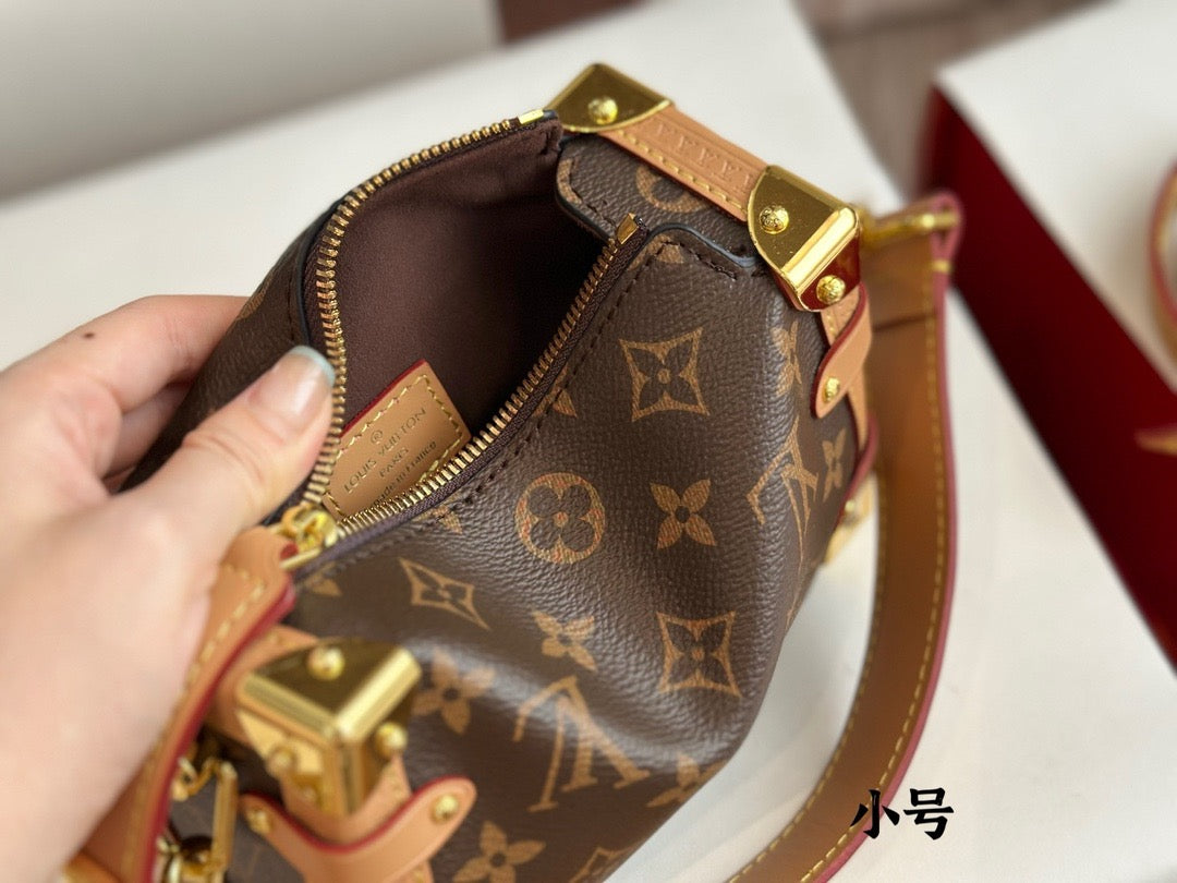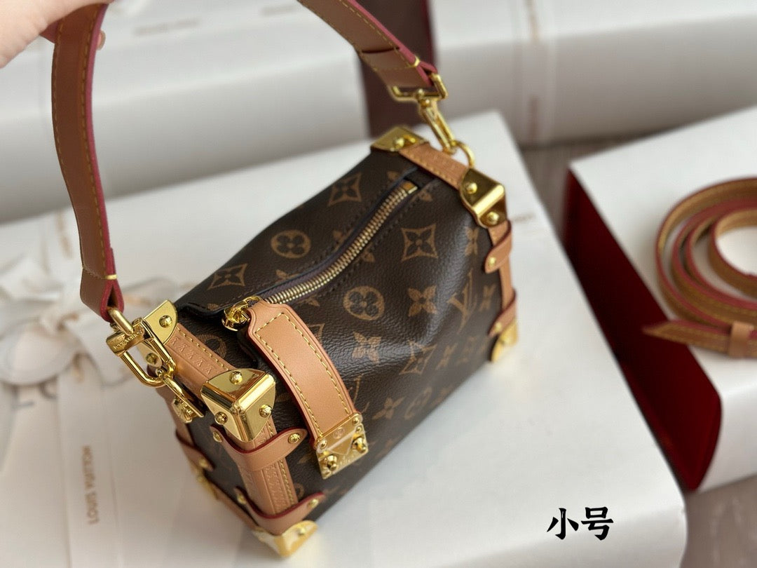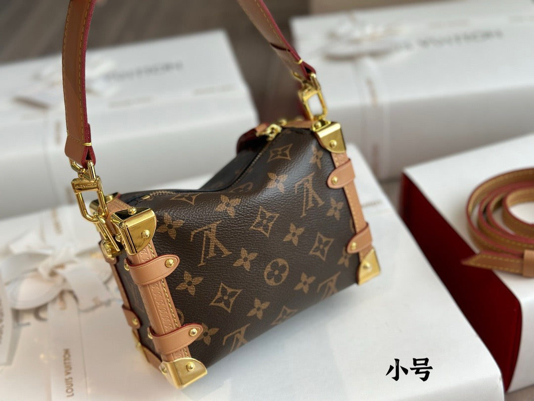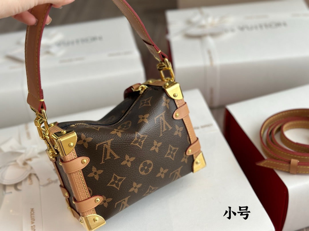 Evocative of the House’s historic trunks, the Side Trunk PM’s rectangular shape is fashioned from Monogram canvas with cowhide-leather trim and gold-color hardware. The reinforced corners and S-lock attached to the zipper are directly inspired by Louis Vuitton trunks. It can be carried by hand or on the shoulder thanks to the removable and adjustable leather strap.