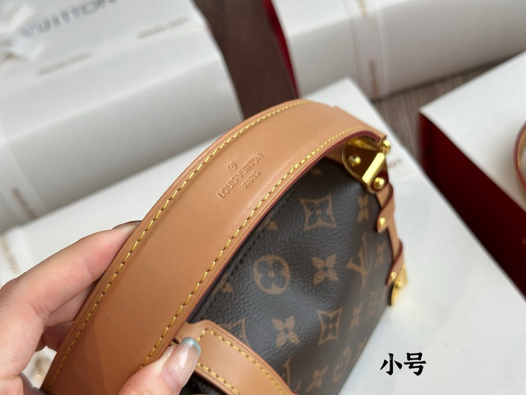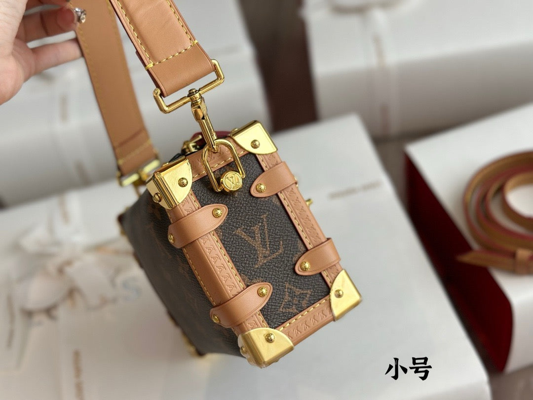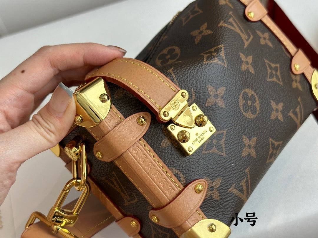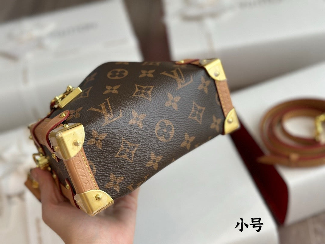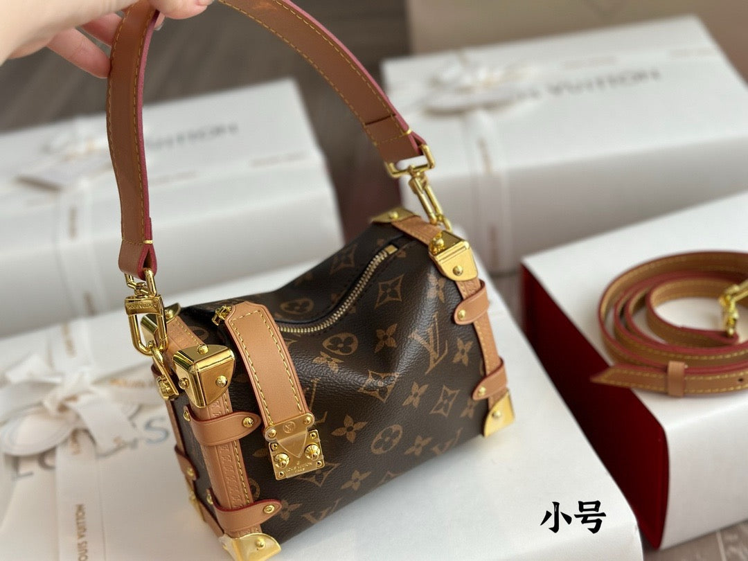 Evocative of the House’s historic trunks, the Side Trunk PM’s rectangular shape is fashioned from Monogram canvas with cowhide-leather trim and gold-color hardware. The reinforced corners and S-lock attached to the zipper are directly inspired by Louis Vuitton trunks. It can be carried by hand or on the shoulder thanks to the removable and adjustable leather strap.