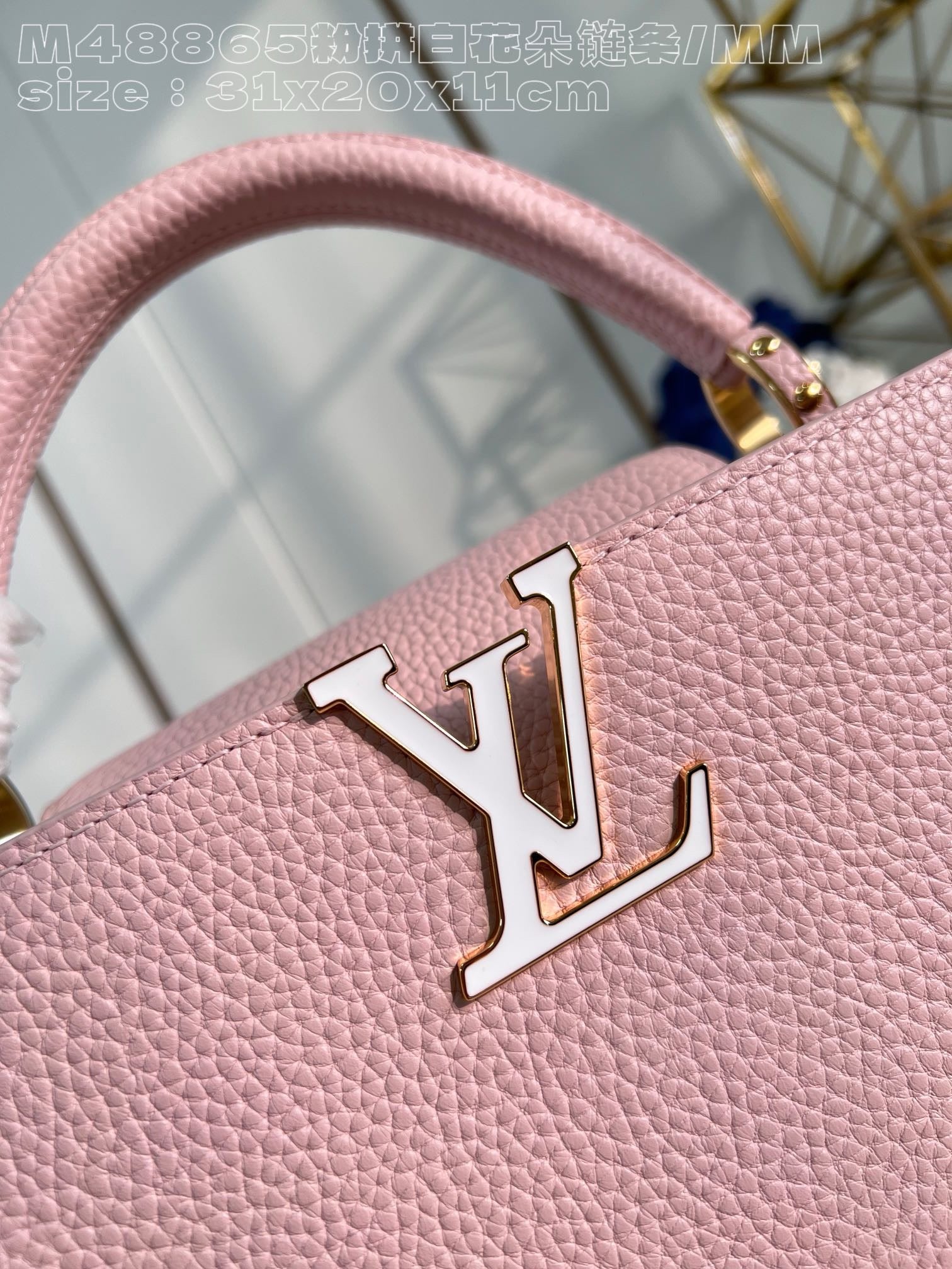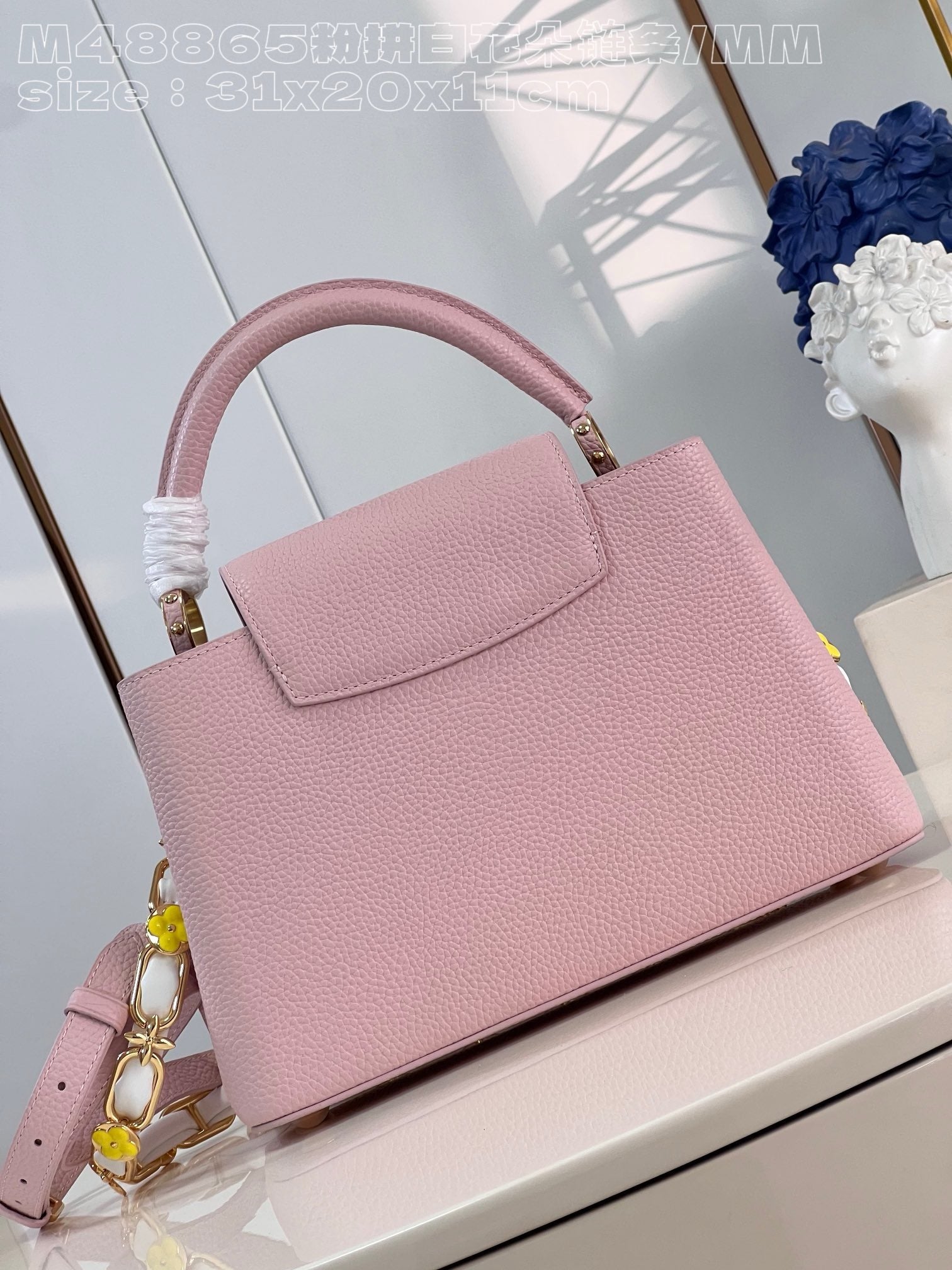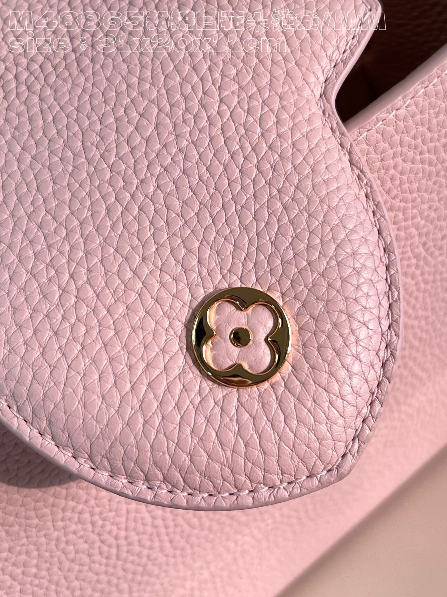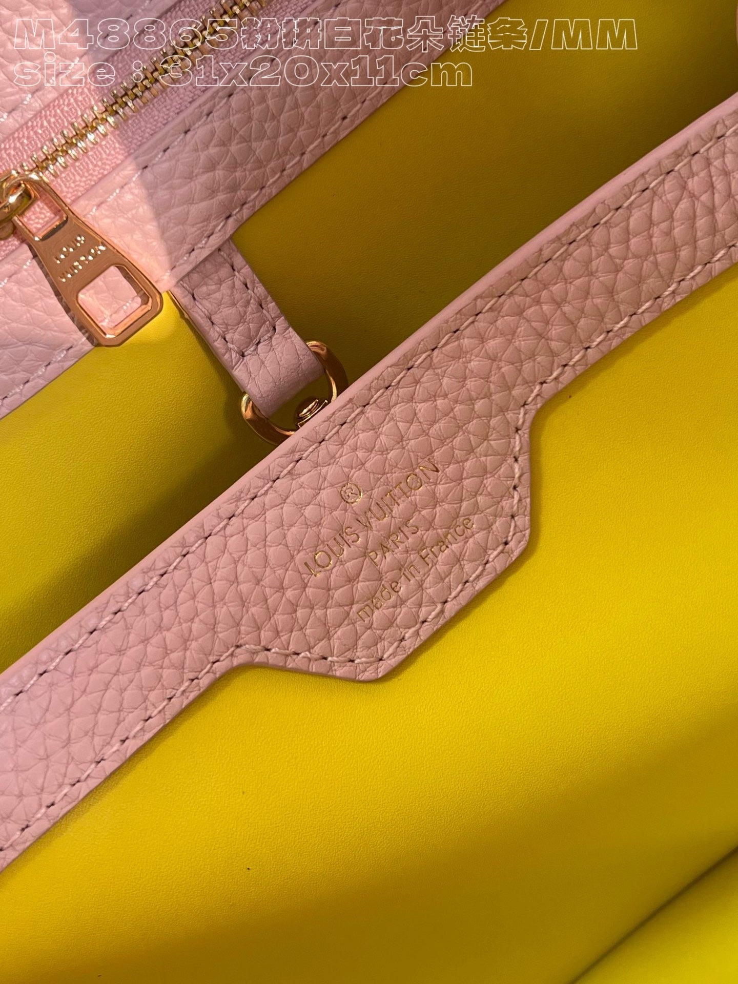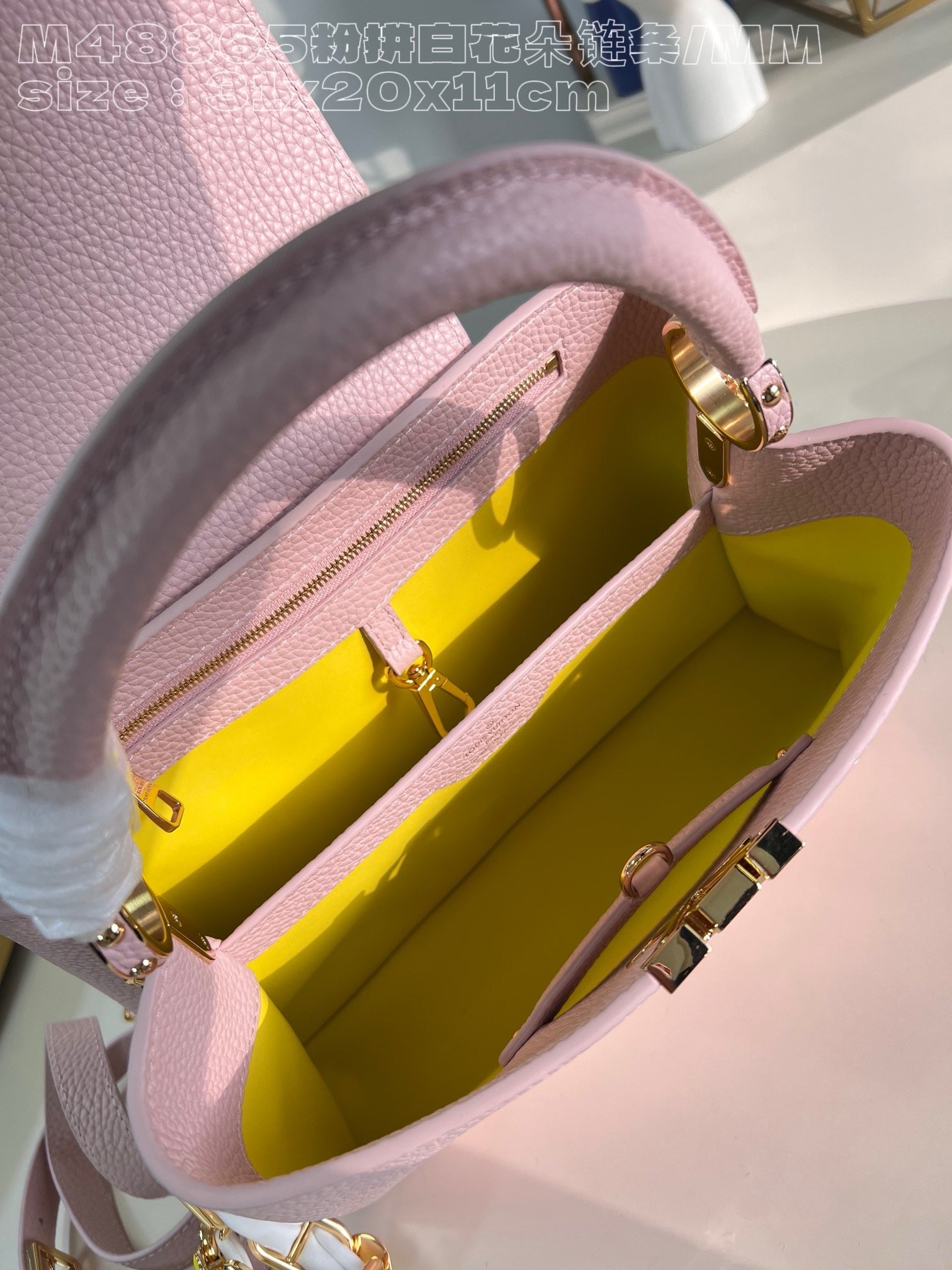 A small treasure of a handbag, the Capucines Mini in Taurillon leather presents a rich mix of materials and textures. The braided Blossom Chain features golden links entwined with soft calfskin, accented by enameled and gold-tone Monogram Flowers. The LV signature finished in contrasting enamel lends a refined touch to this supremely feminine accessory.