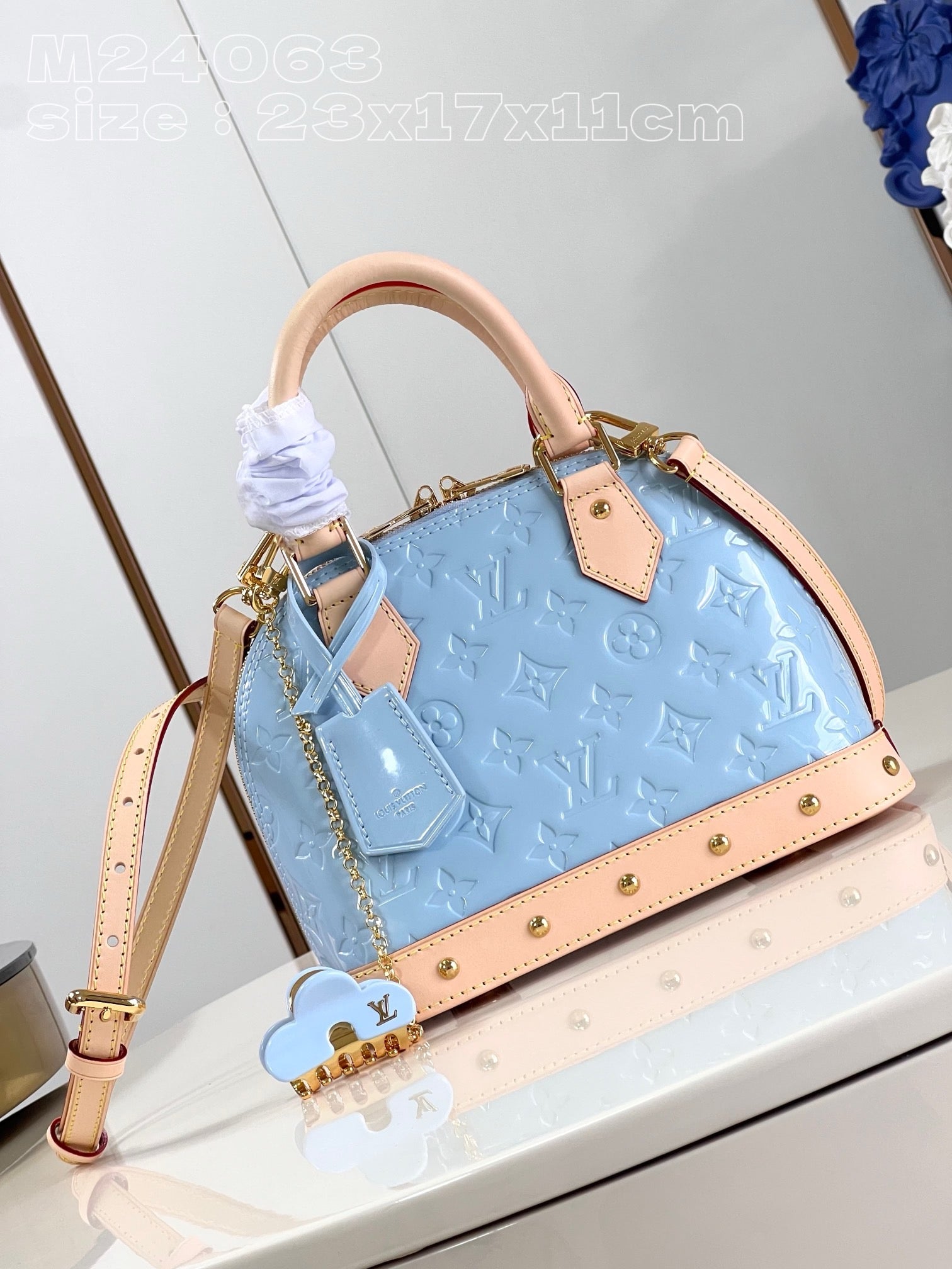 The Alma BB’s distinctive Art Deco shape looks stunning in shiny Monogram Vernis leather, with natural cowhide-leather on the top handle and along the bottom. The pastel colorway and golden rivets on the handle mounts and bottom leather trim bring an on-trend feel. Each bag comes with a matching-colored hair clip.