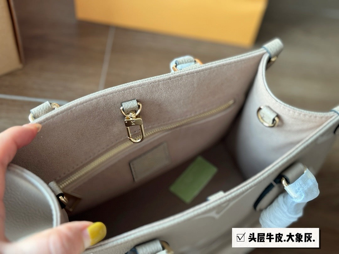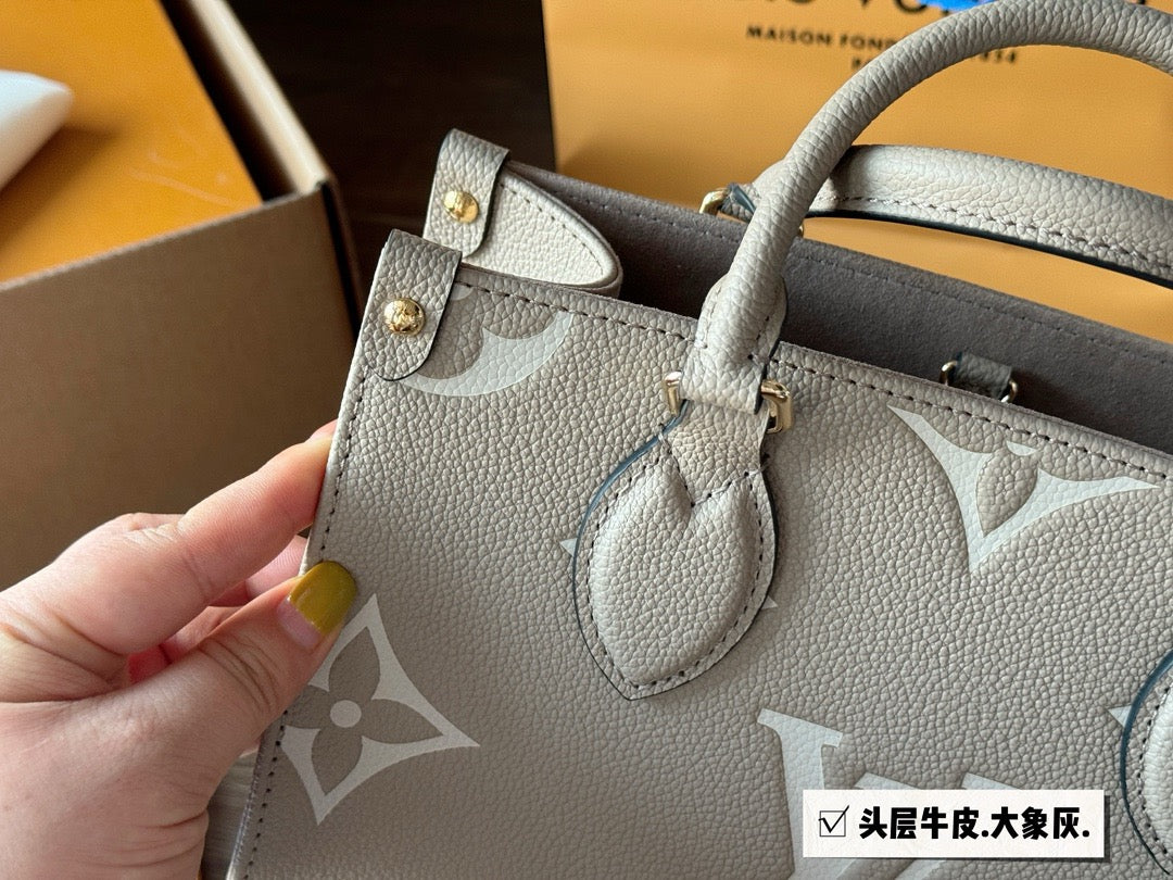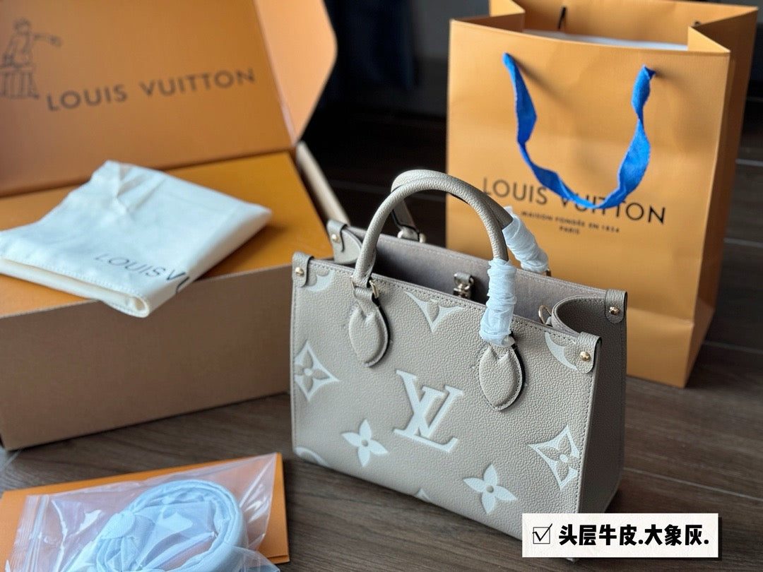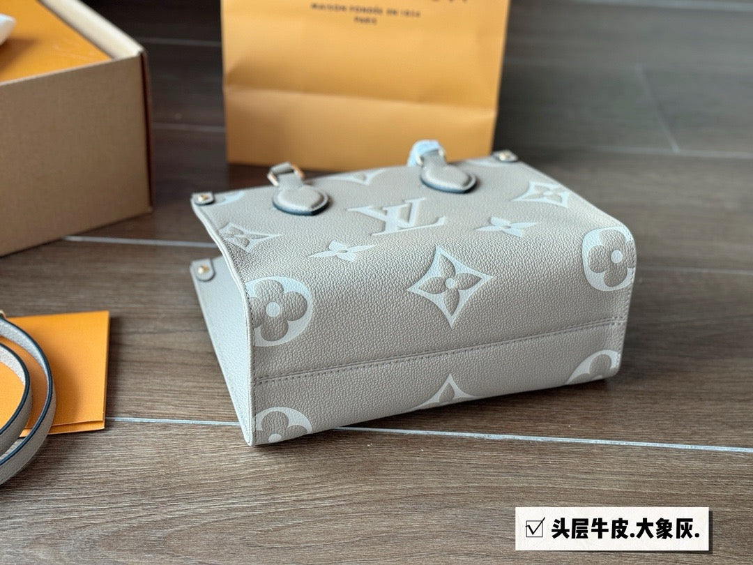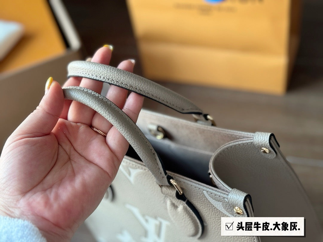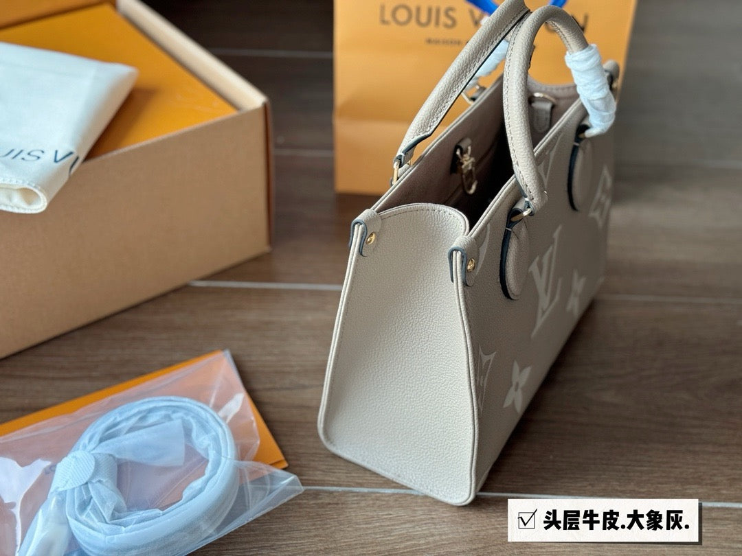 Inspired by Louis Vuitton’s famous Sac Plat from 1968, the Onthego PM tote is fashioned in Monogram Empreinte leather, embossed with a Giant Bicolor Monogram pattern. This smaller version of the original Onthego fits essentials such as an iPad Mini. Articulated top handles and an adjustable removable strap offer a variety of carry options.