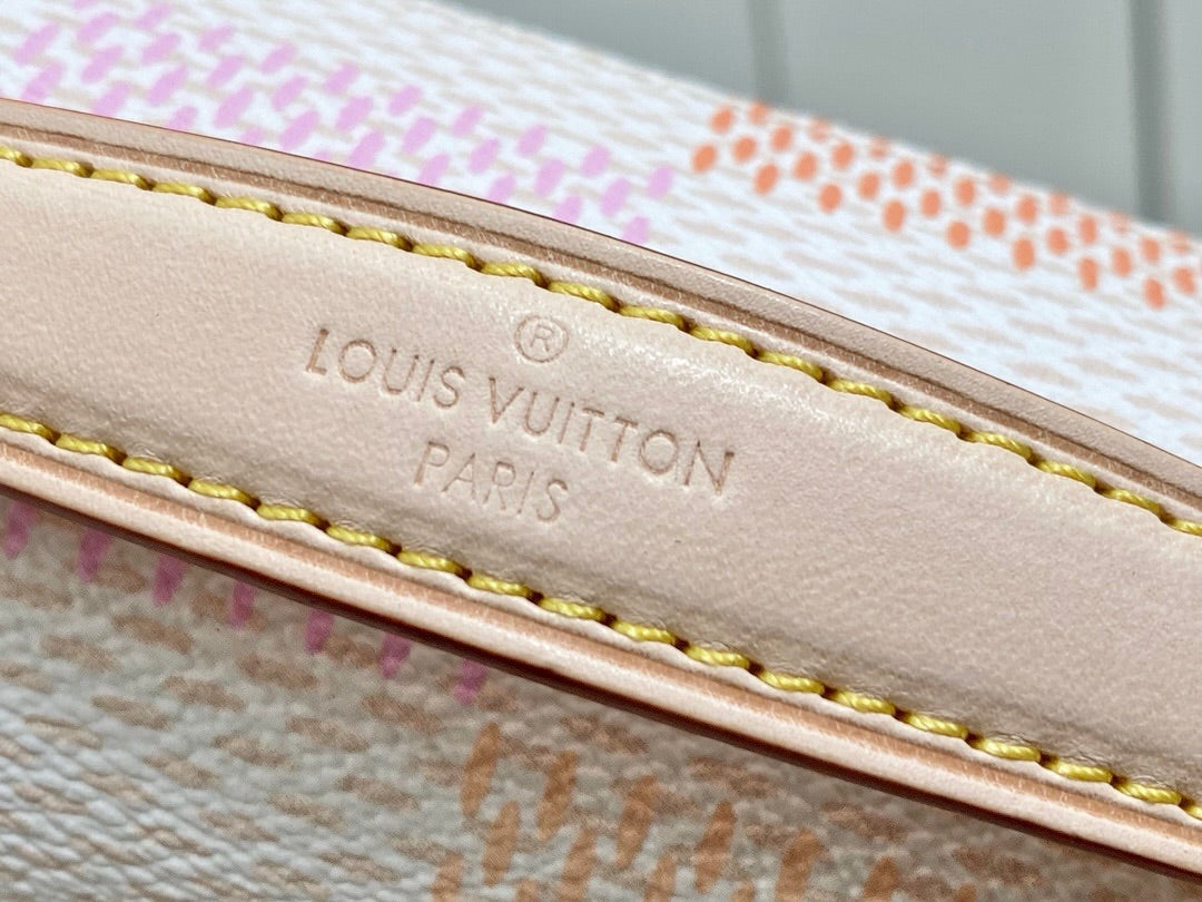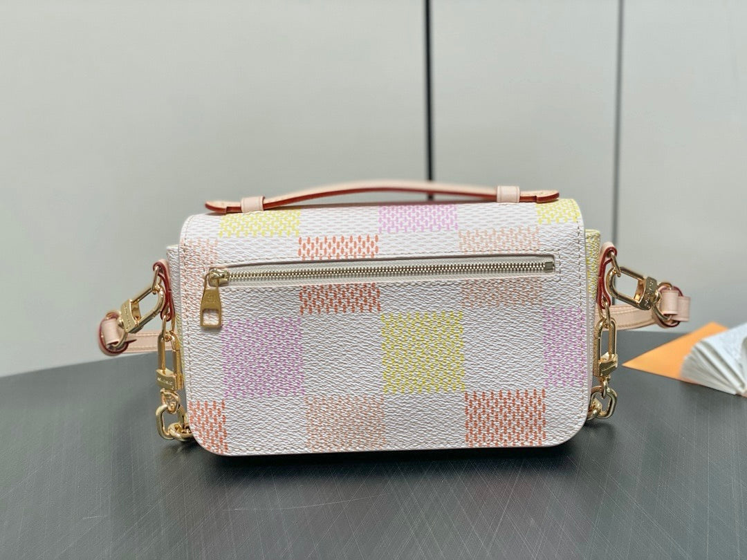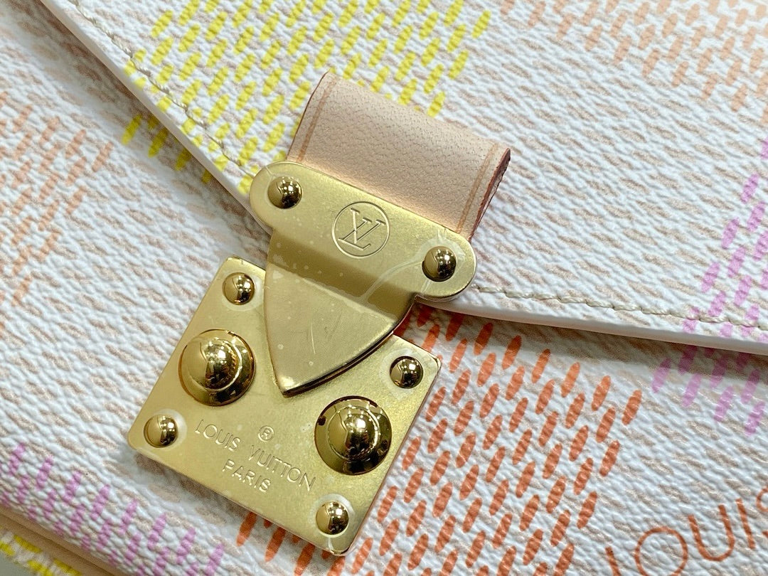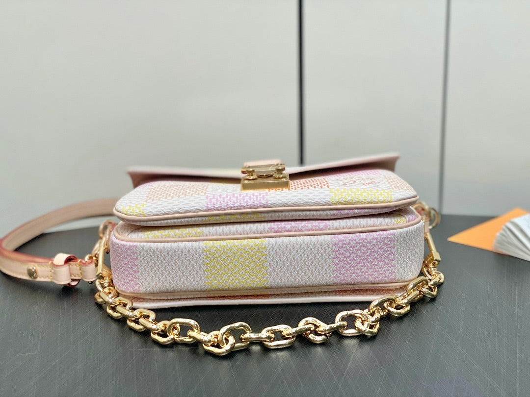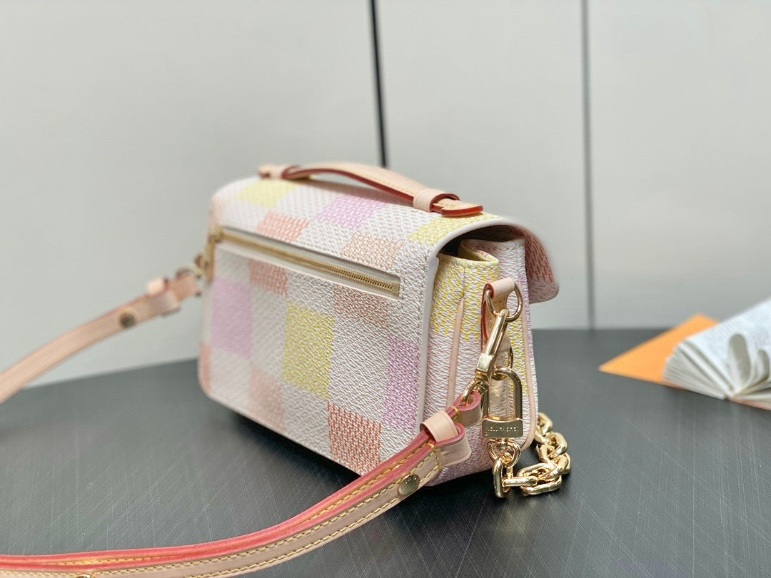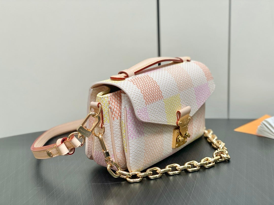 Fashioned from Damier Giant canvas in a pastel colorway, the Pochette Métis East West takes part in the Damierlicious capsule. This stylish shapes features an S-lock and removable short chain, both with a golden finish. The organized interior and the adjustable and removable leather strap make this compact bag perfect for women on the go.