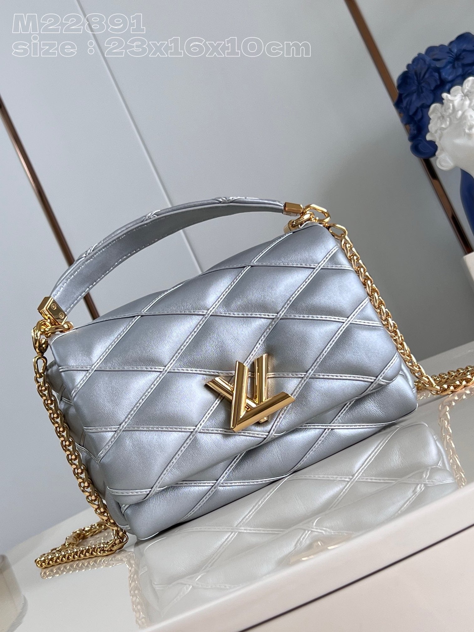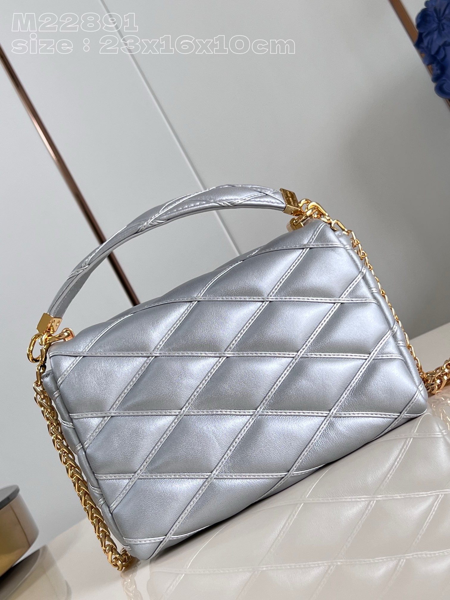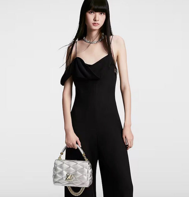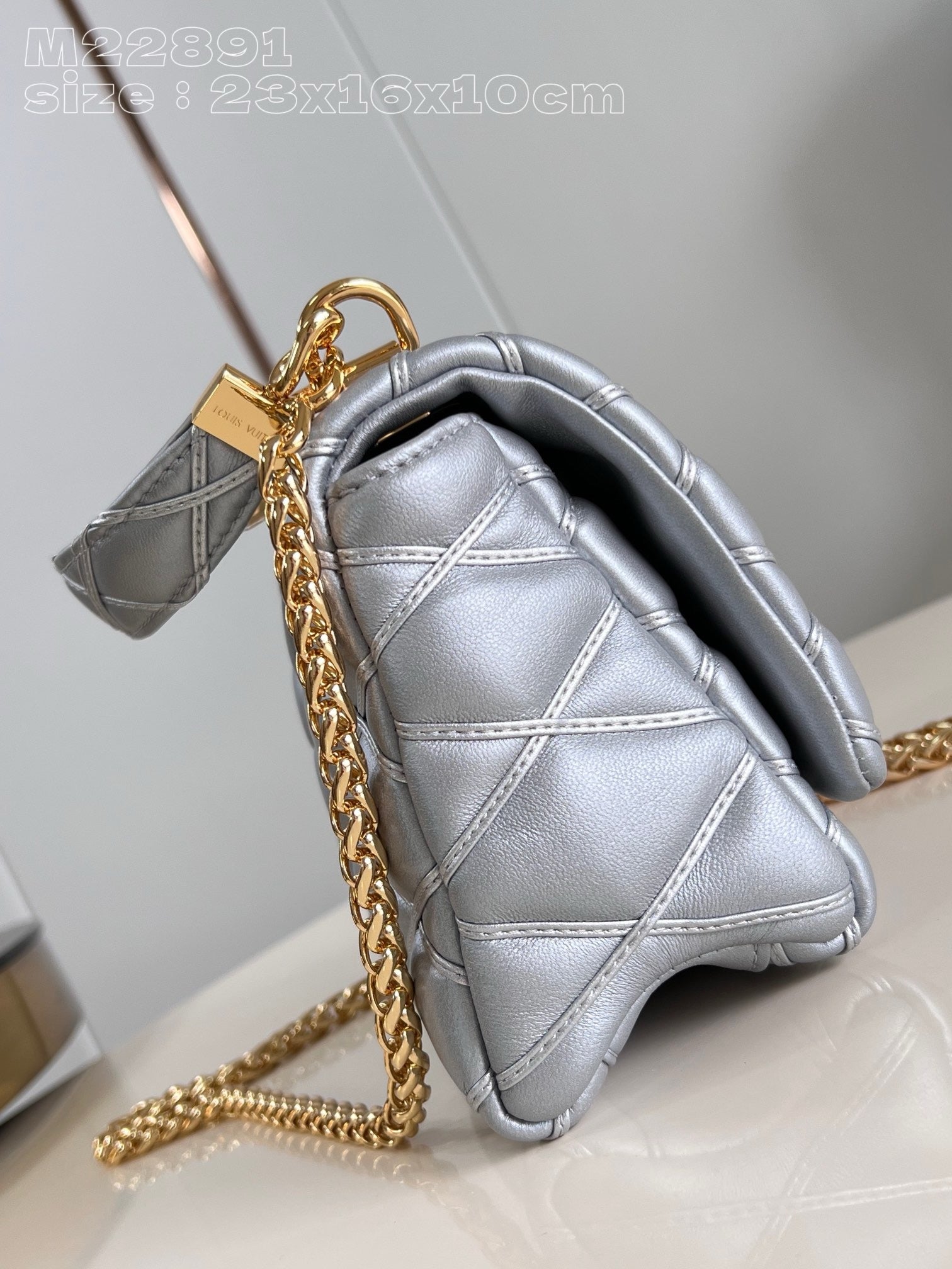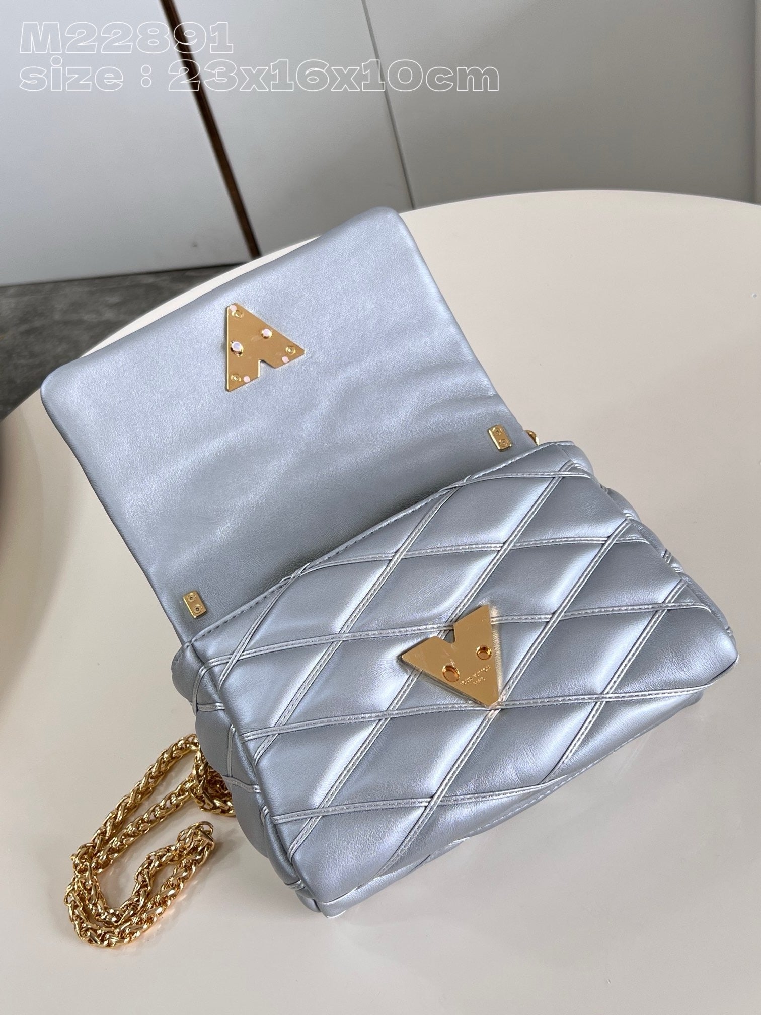 This GO-14 MM handbag in silver-color lambskin was introduced in the Spring-Summer 2024 Collection. The quilted lamb leather features a glamourous metallic finish. Gold-color hardware perfectly complements the silver leather. The GO-14 has both a removable handle for hand carry and a detachable and adjustable sliding chain for shoulder or cross-body wear.