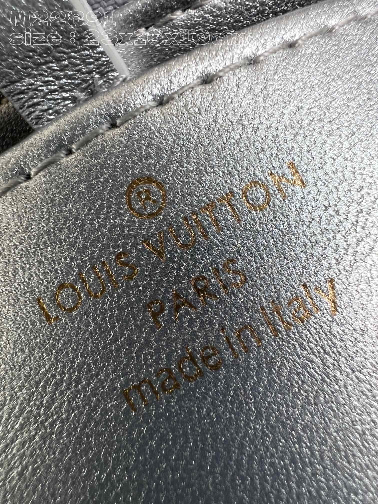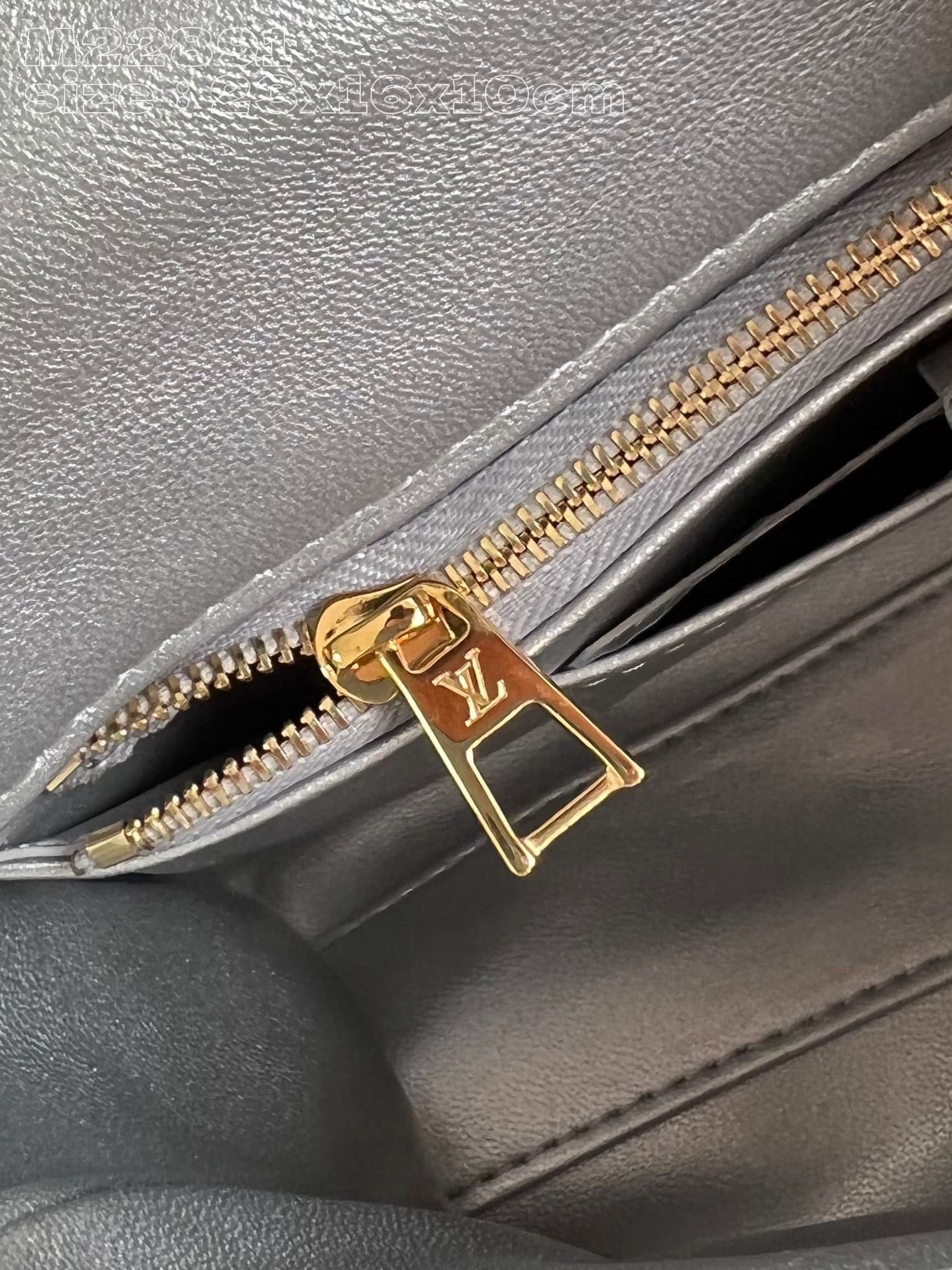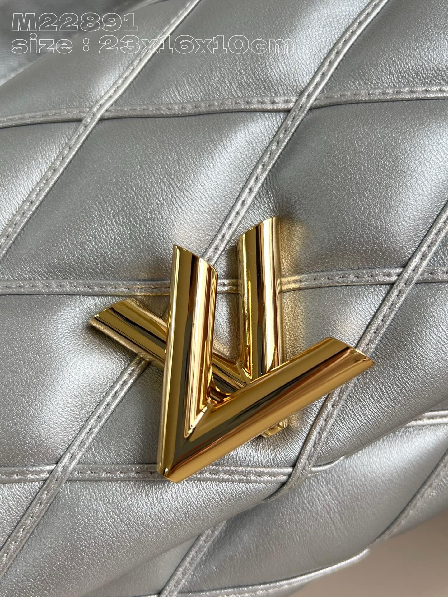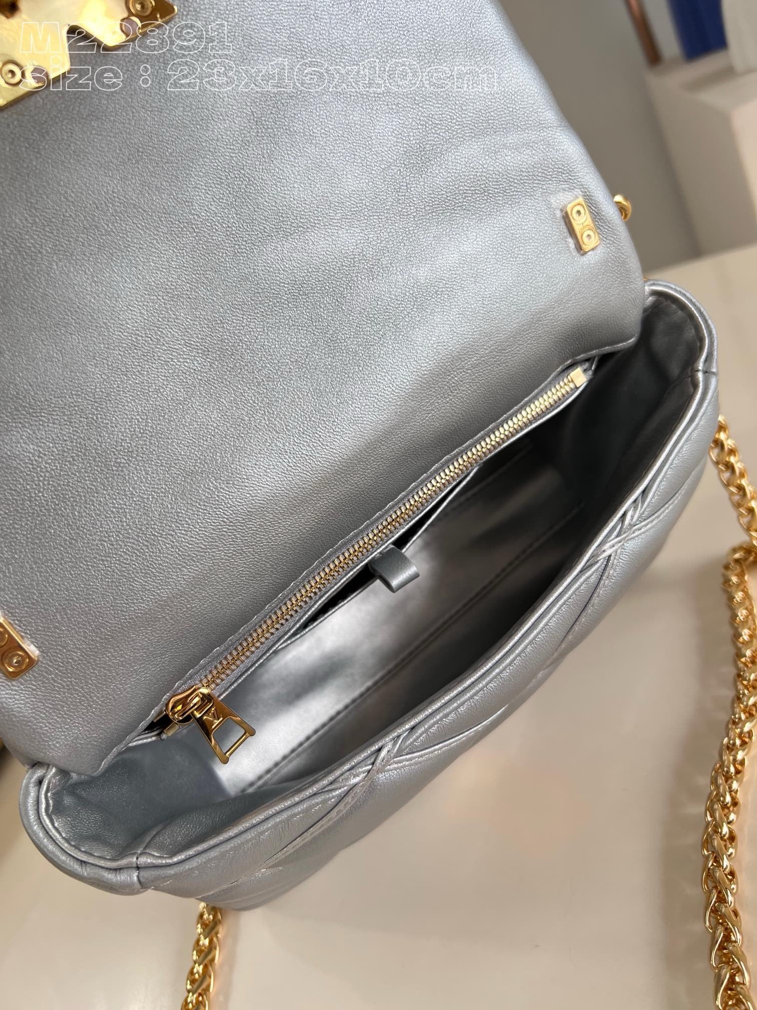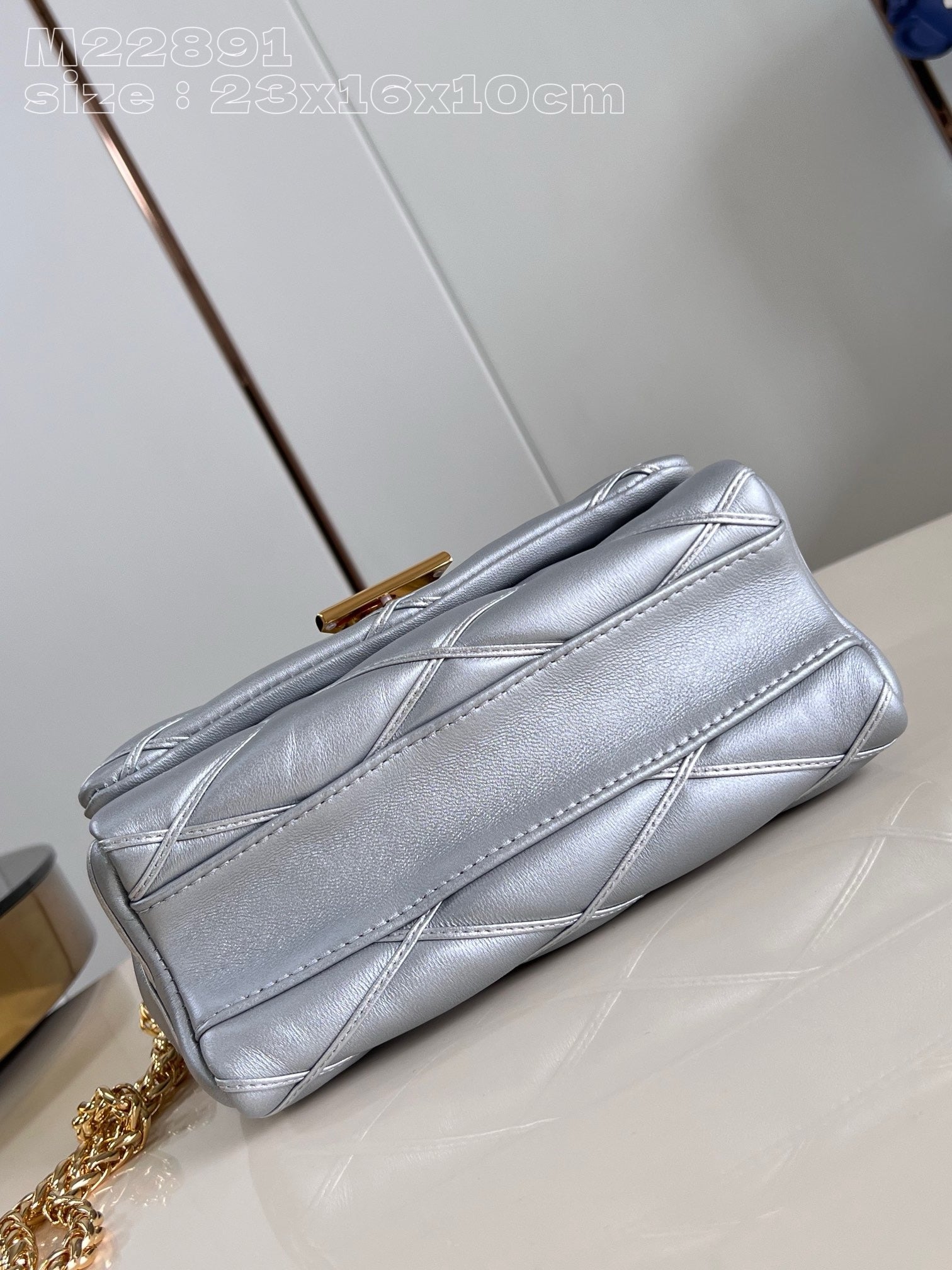 This GO-14 MM handbag in silver-color lambskin was introduced in the Spring-Summer 2024 Collection. The quilted lamb leather features a glamourous metallic finish. Gold-color hardware perfectly complements the silver leather. The GO-14 has both a removable handle for hand carry and a detachable and adjustable sliding chain for shoulder or cross-body wear.